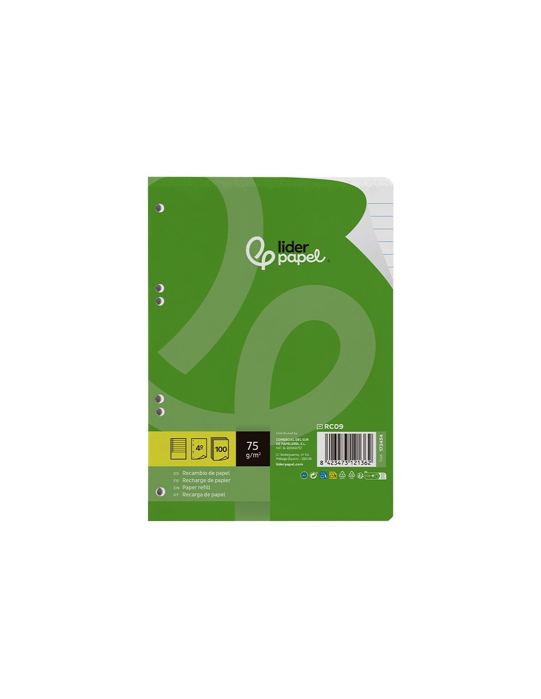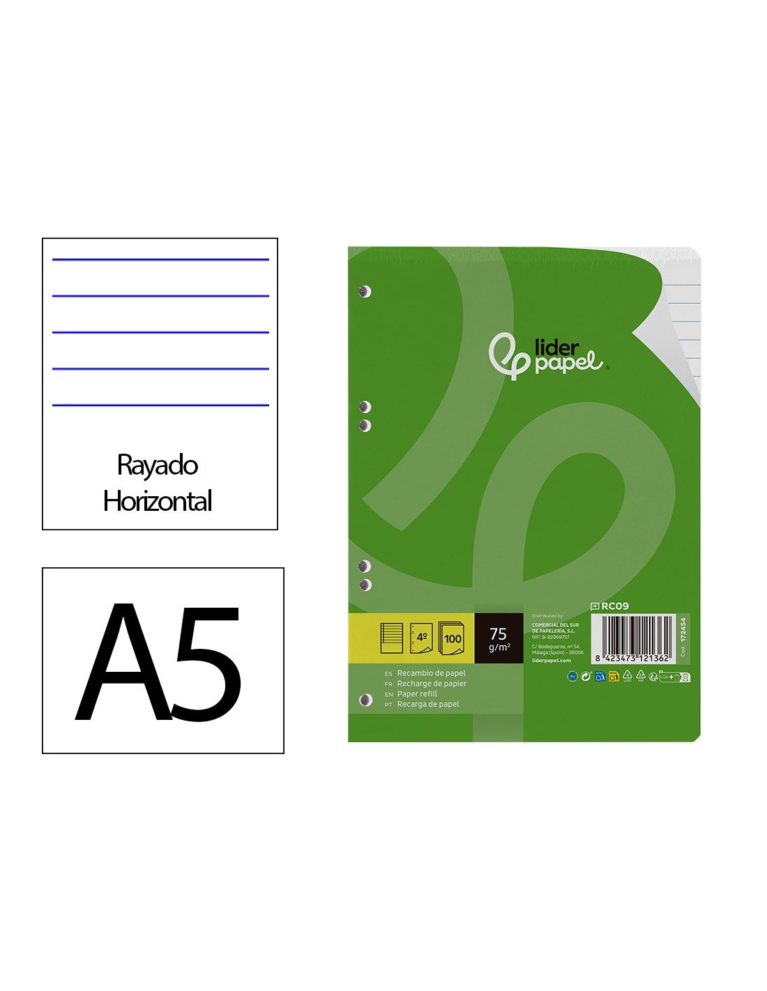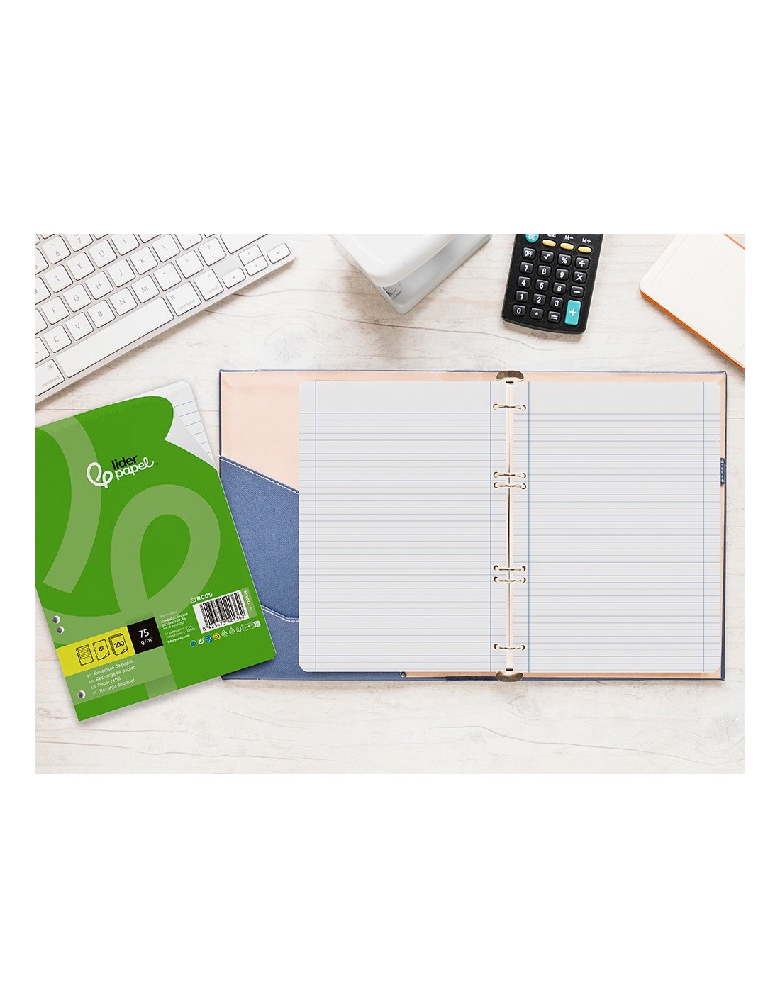 Recambio tamaño A5 (155x212mm) con papel de 75gr de alta calidad, retractilado de 100 hojas sueltas con 6 taladros, compatibles con carpetas de anillas. Archiva tus apuntes fácilmente y transporta solo las hojas que necesites.