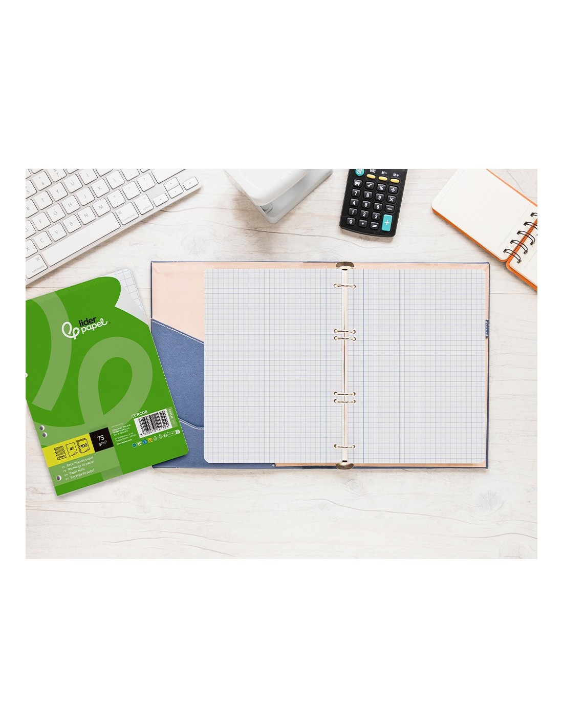Recambio tamaño A5 (155x212mm) con papel de 75gr de alta calidad, retractilado de 100 hojas sueltas con 6 taladros, compatibles con carpetas de anillas. Archiva tus apuntes fácilmente y transporta solo las hojas que necesites.