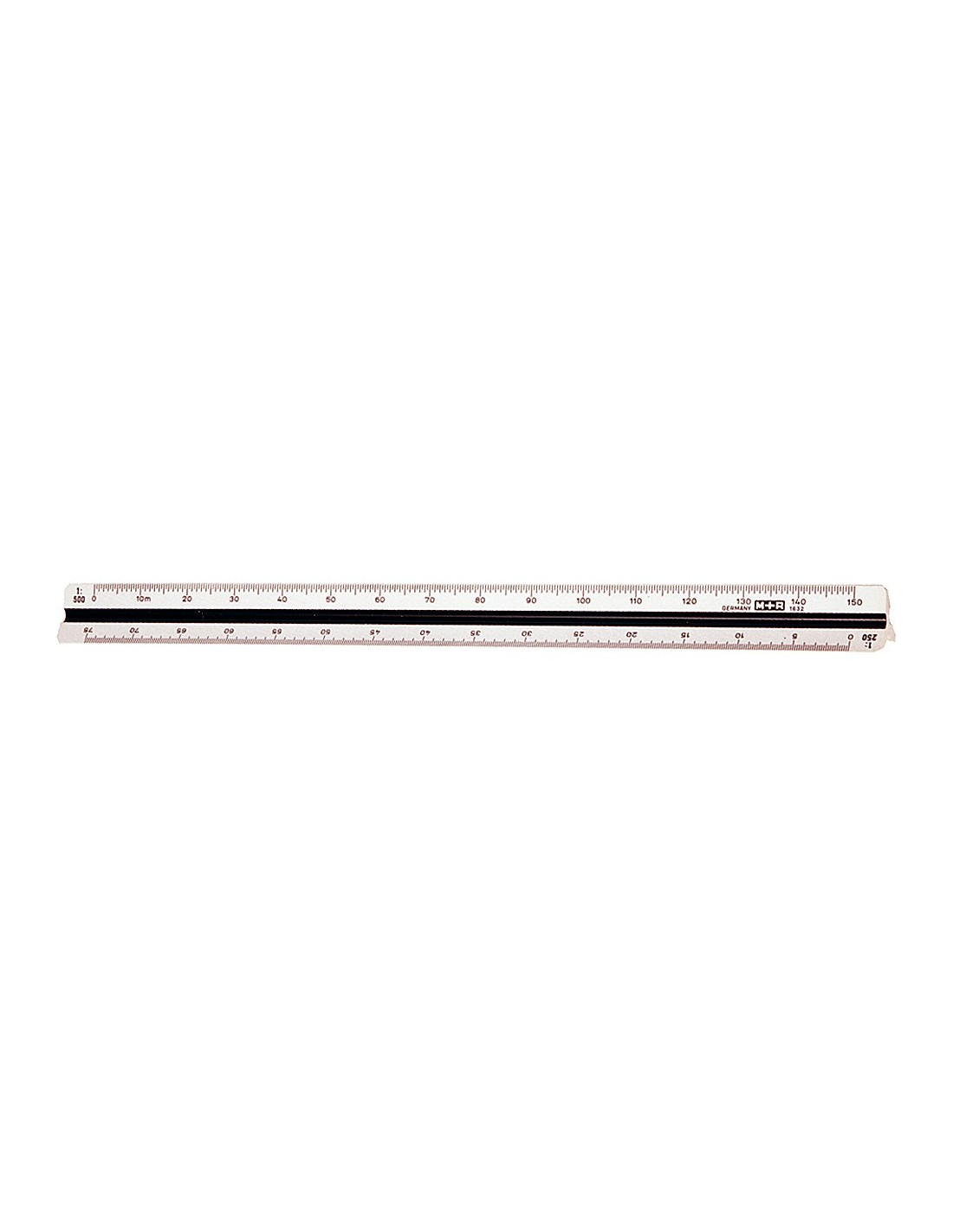 Poliestireno de alto impacto de color blanco, de 30 cm de longitud. Hendiduras de orientación en color. 6 divisiones. Estuche individual rígido PVC. Escalas 1:100, 1:200, 1:250, 1:300, 1:400 y 1:500. Para arquitectura. Con funda.