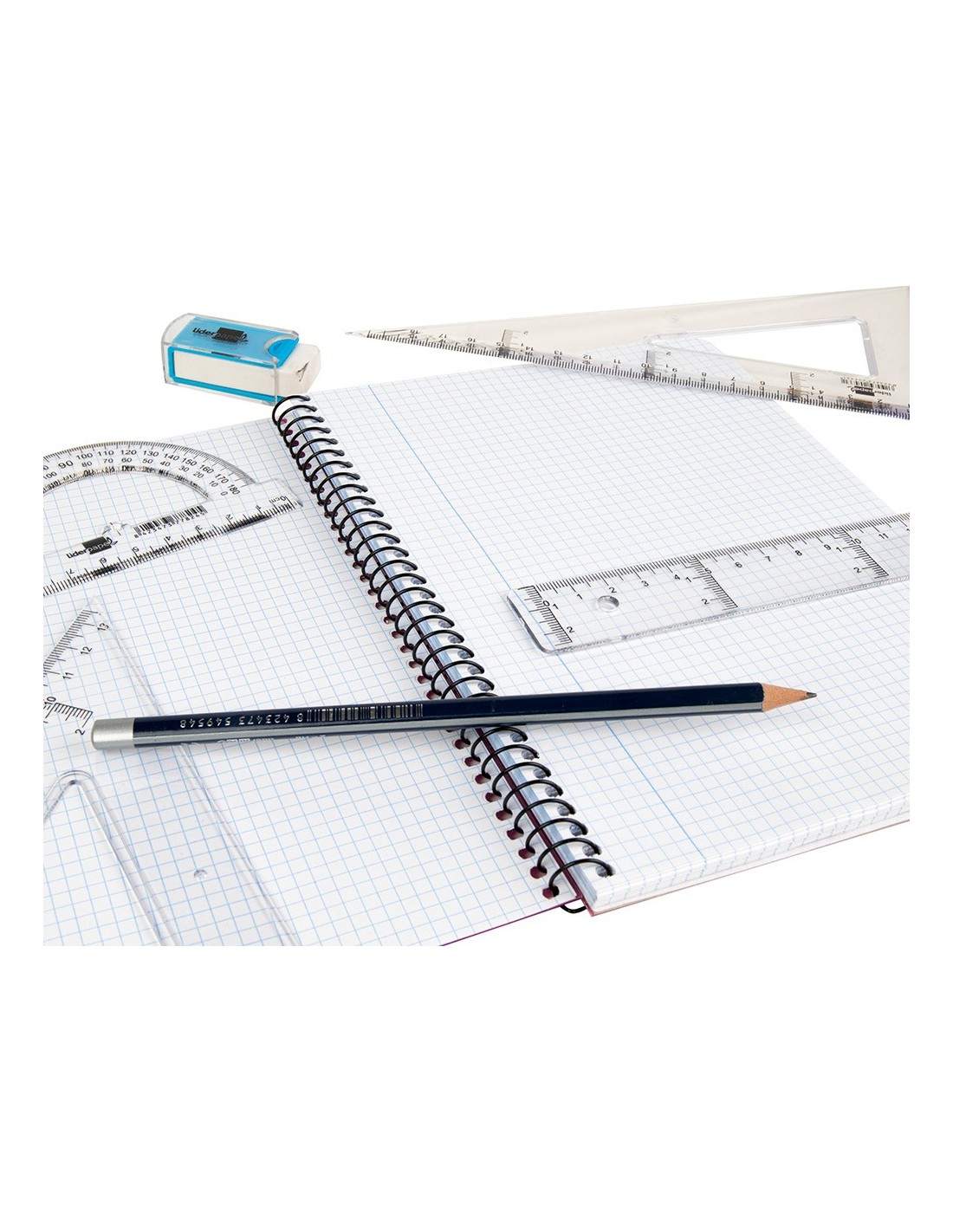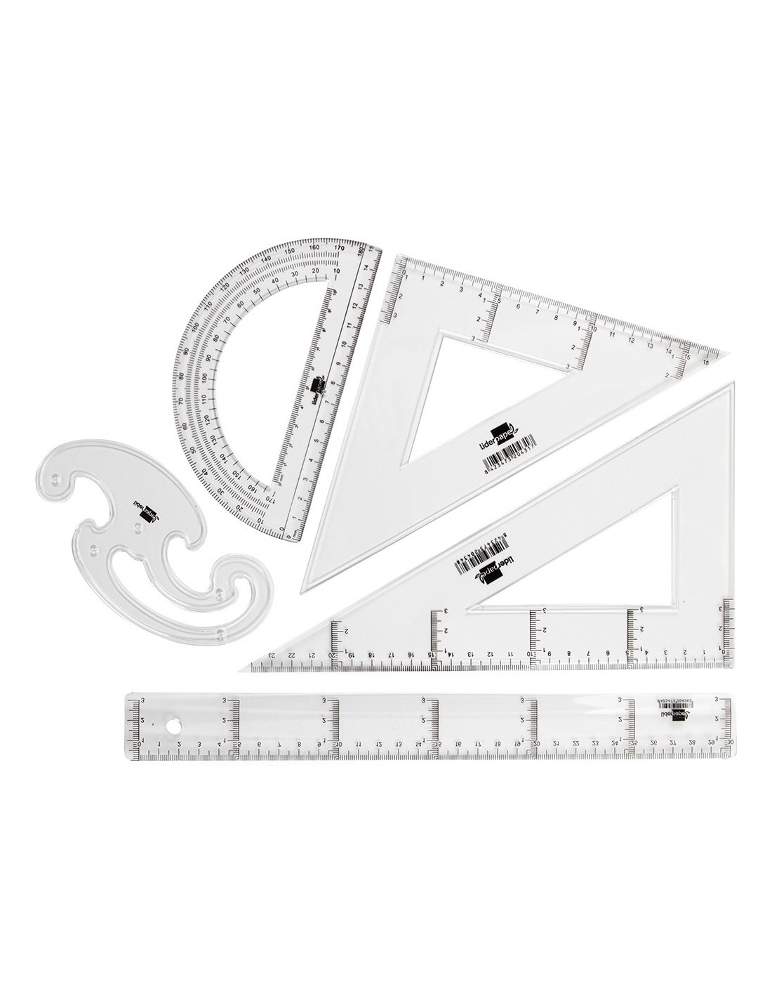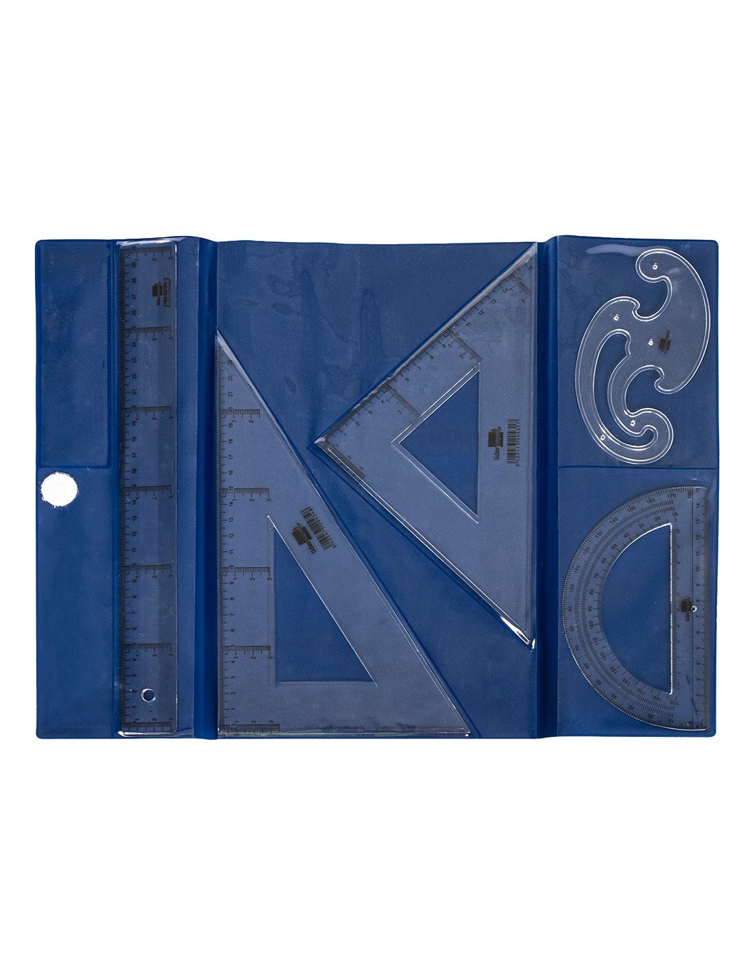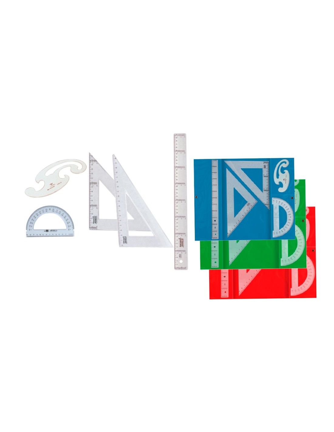 Petaca plástica transparente y verde con regla de 30 cm, escuadra de 25 cm, cartabón de 25 cm, semicírculo de 15 cm (180°) y plantilla de curvas. Transparentes, biselados y graduados en milímetros. Con cierre de broche.