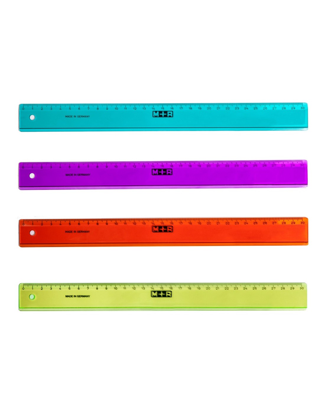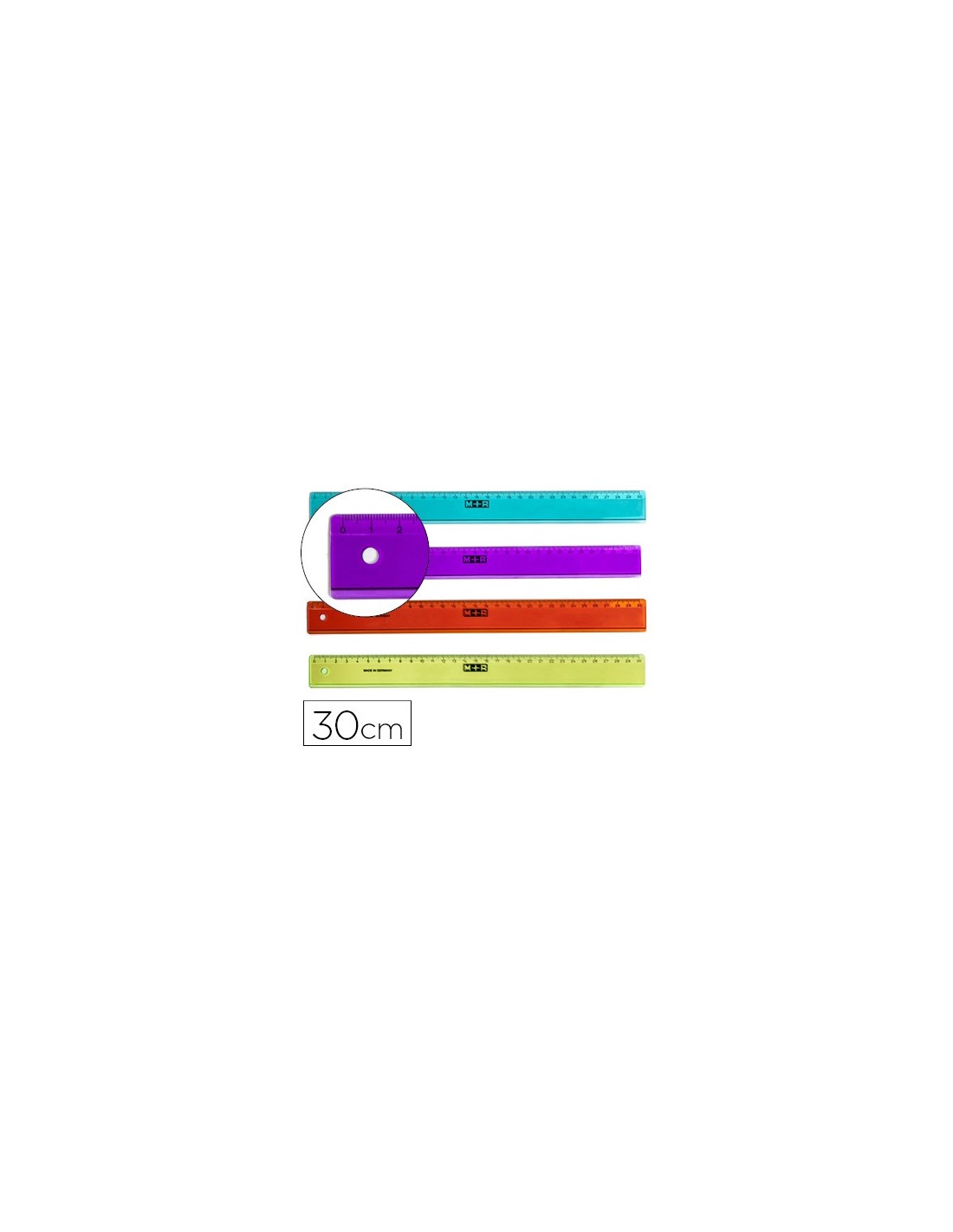 Regla de alta calidad fabricada en poliestireno transparente. Biselada. Colores surtidos: azul, naranja, morado y verde.