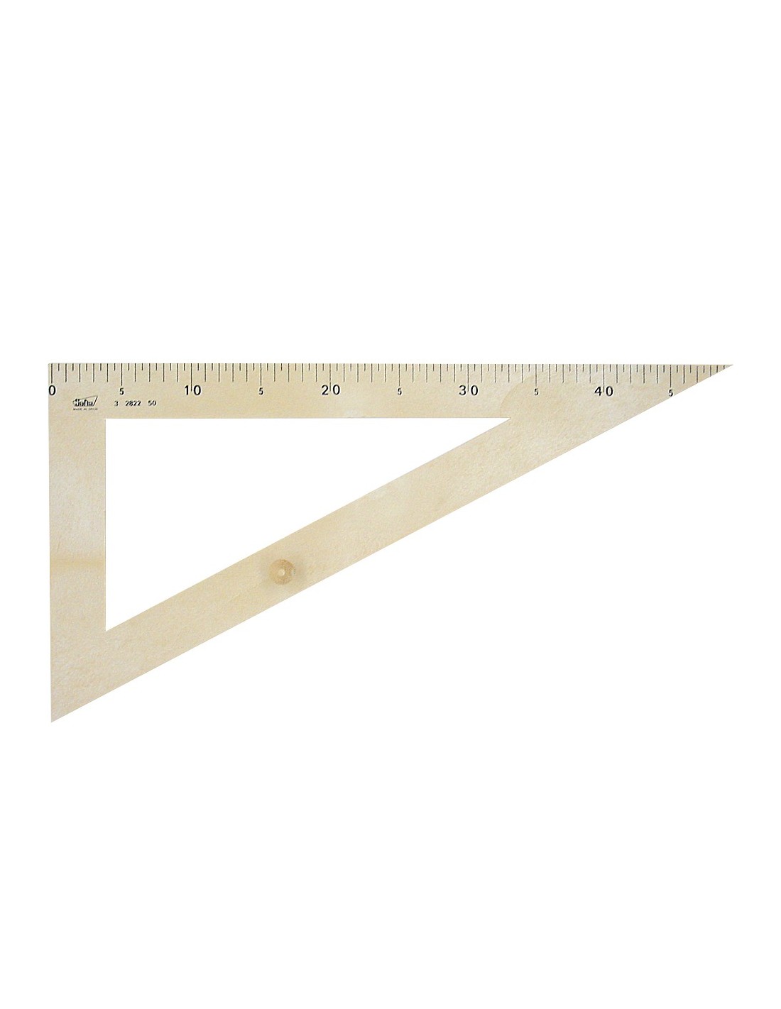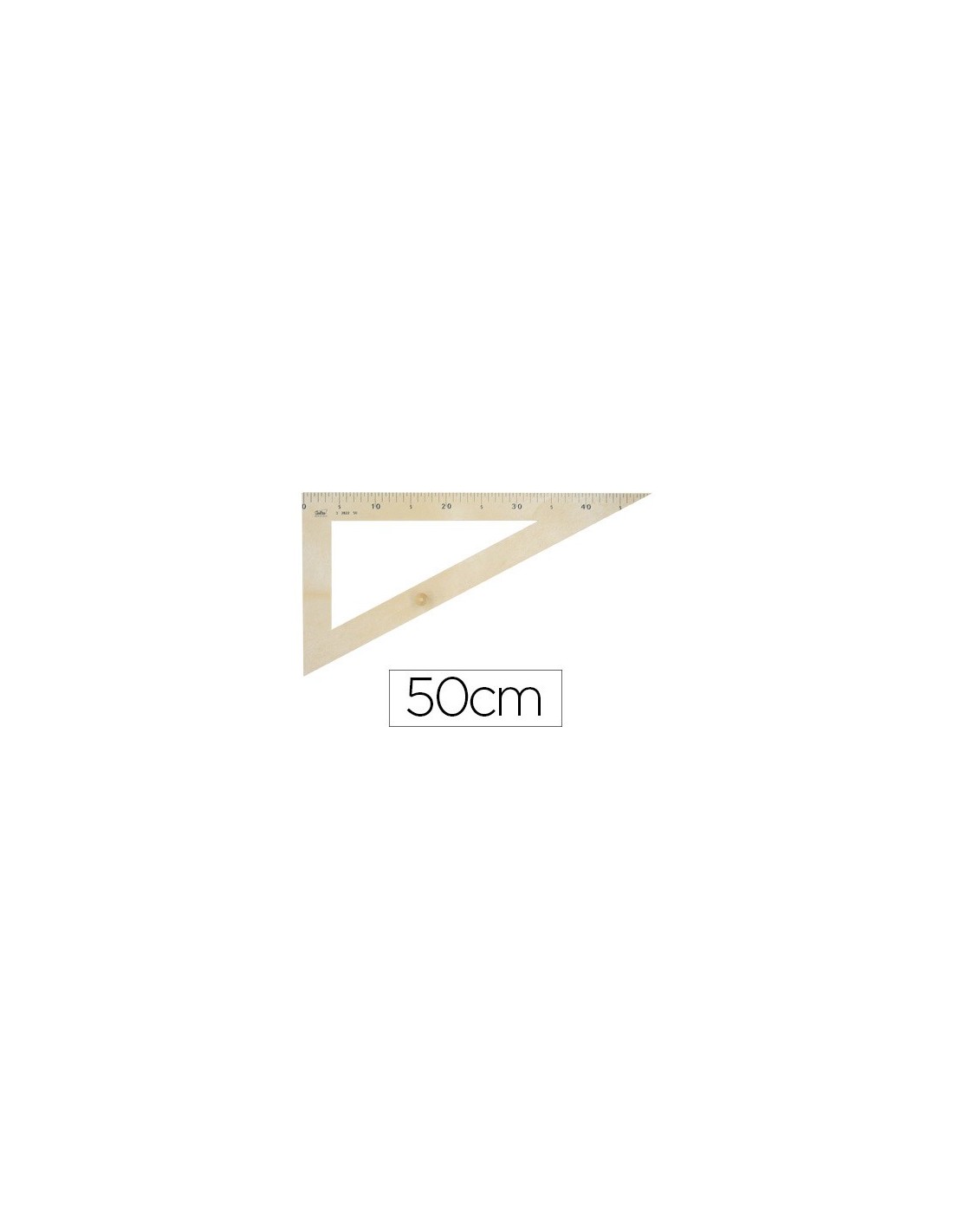 Uso escolar, para pizarra. Fabricado en plástico inyectado de baja presión imitación madera. 100% reciclable. Con agarradera. Graduación en cm. Longitud cateto mayor: 50 cm.