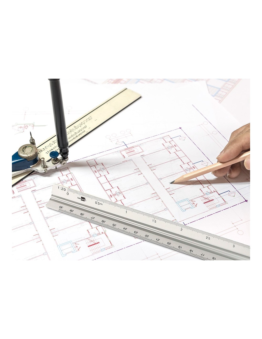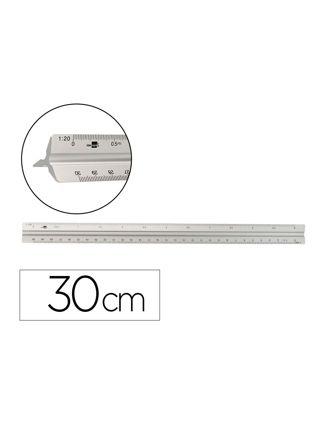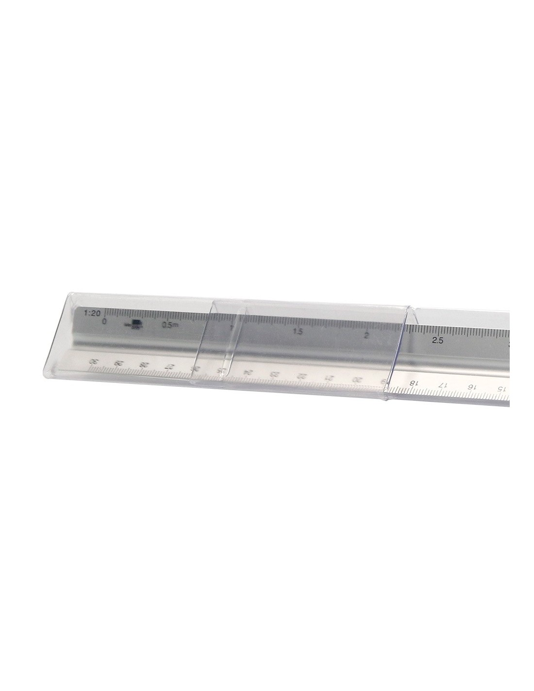 Escala fabricada en aluminio. Longitud: 30 cm. Escalas 1:20/1:25/1:50/1:75/1:100 y 1:150. Con funda de plástico.