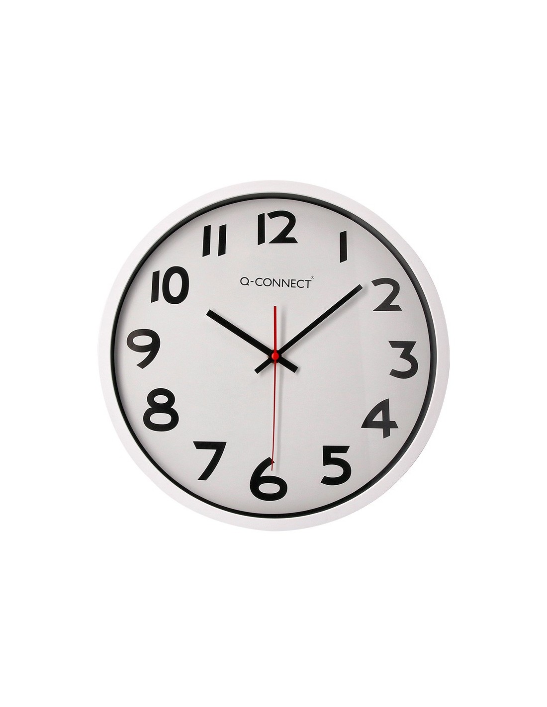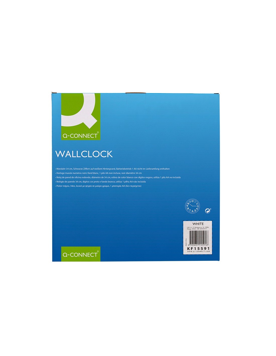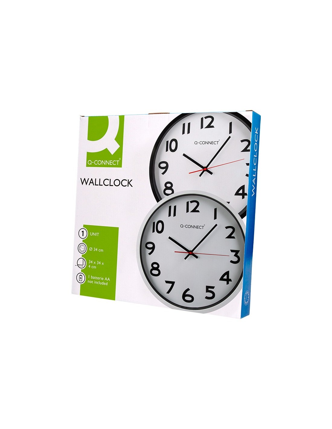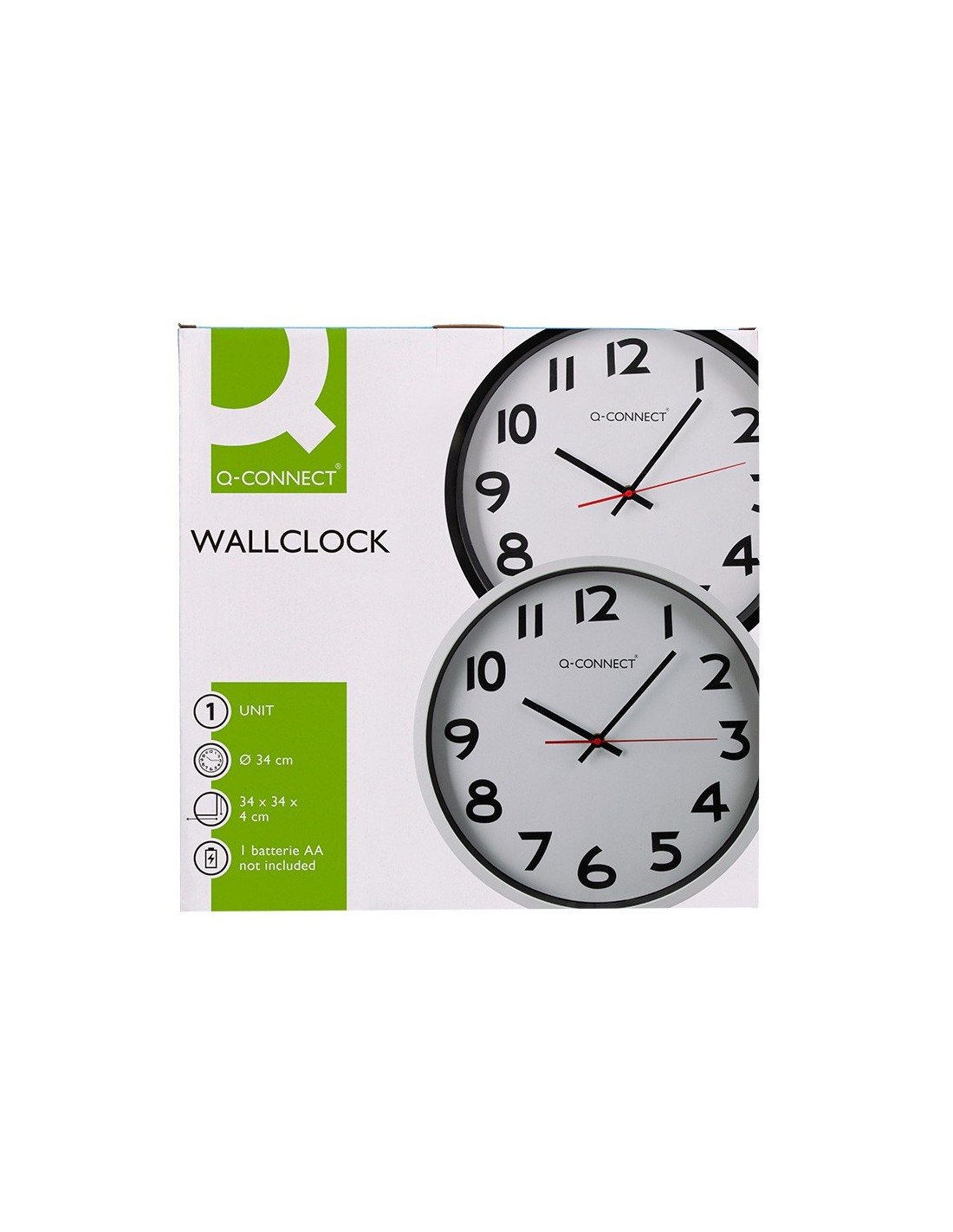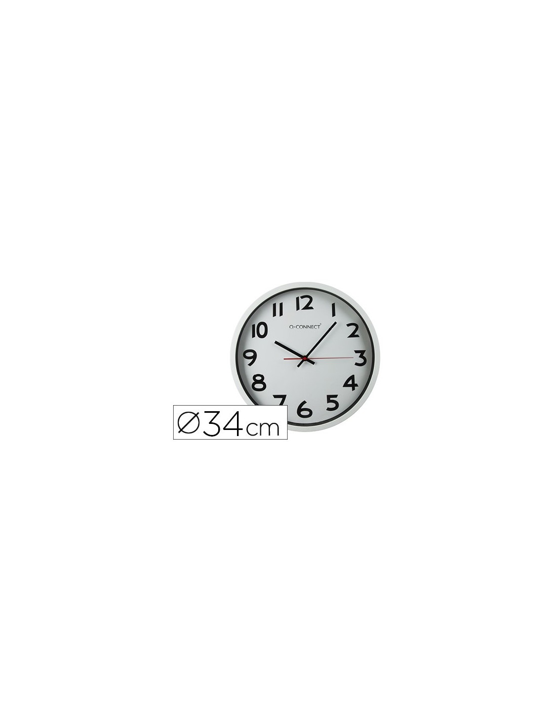 Reloj de pared, diseño moderno y actual. Con números grandes y en color negro sobre una base blanca que facilita su lectura. Funciona con 1 pila AA (no incluida). Diámetro: 340 mm.