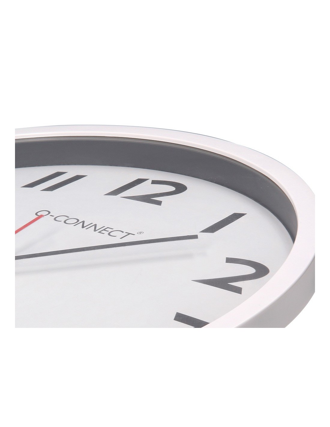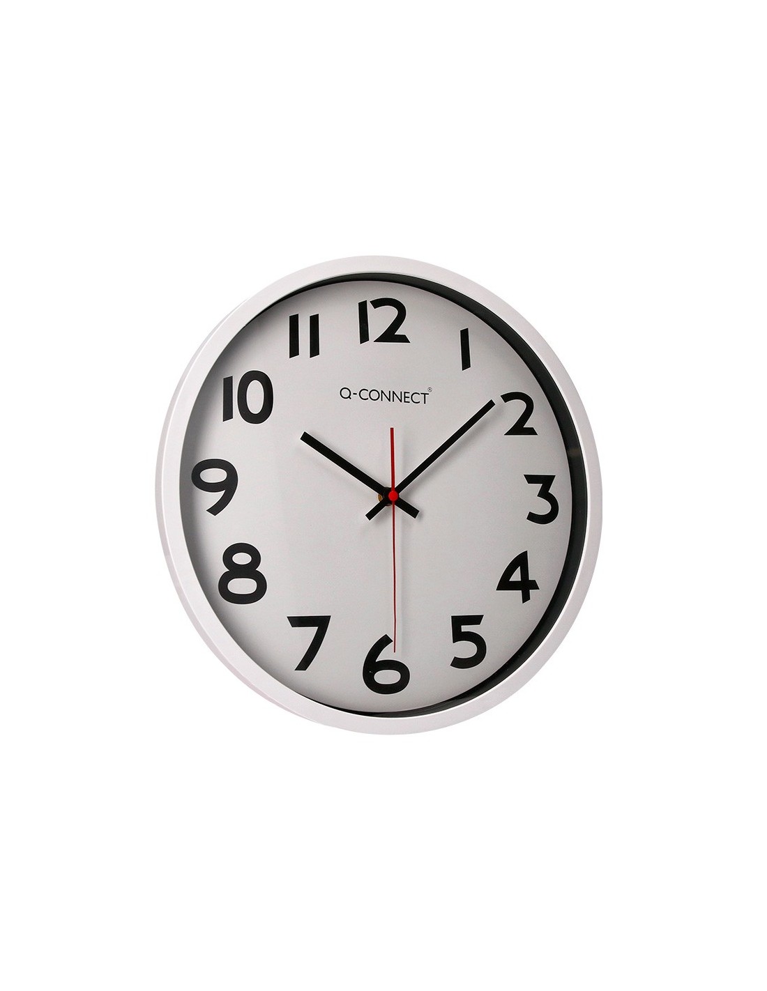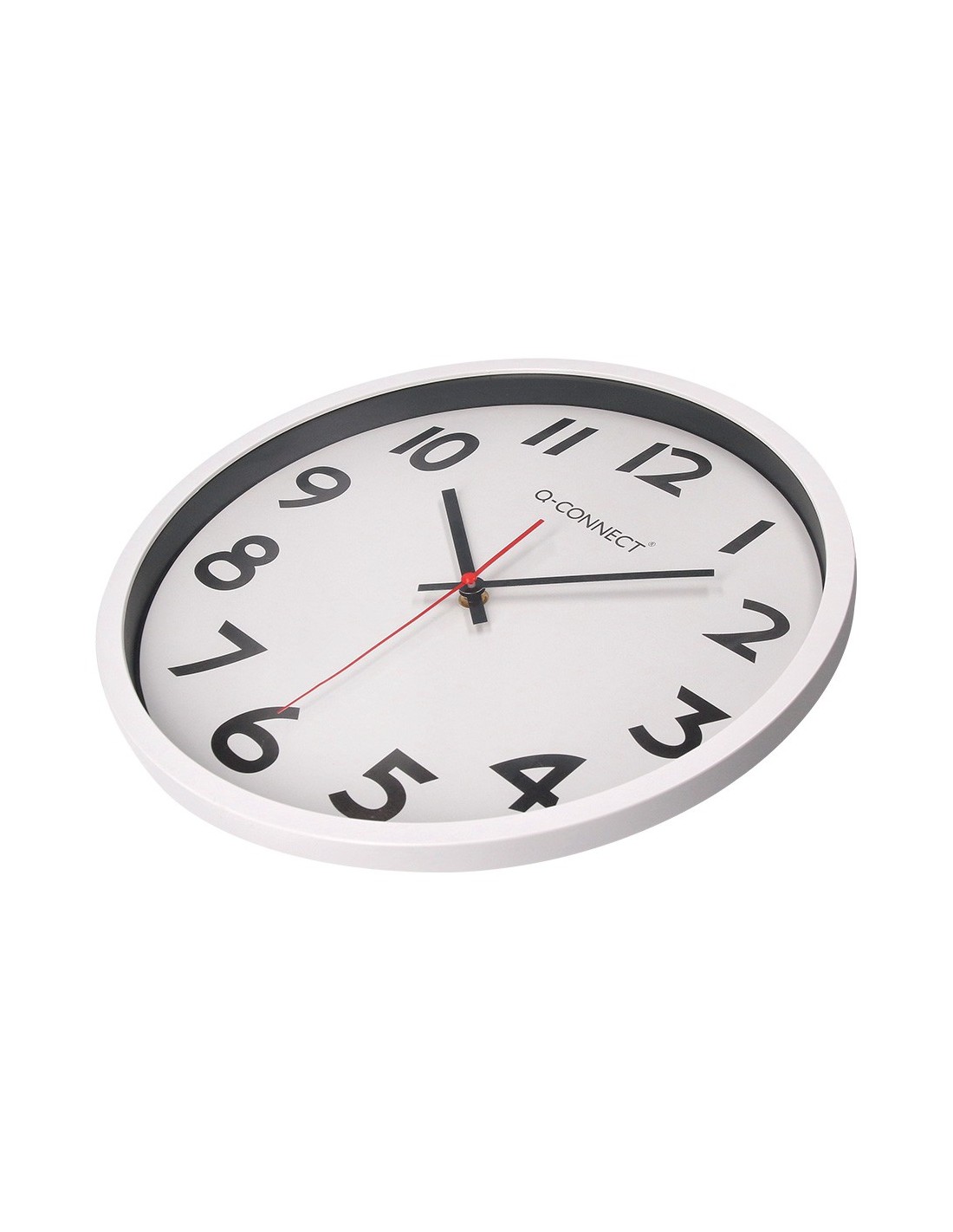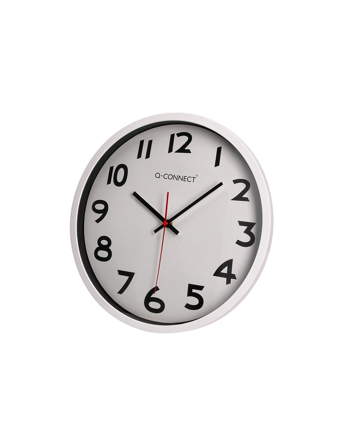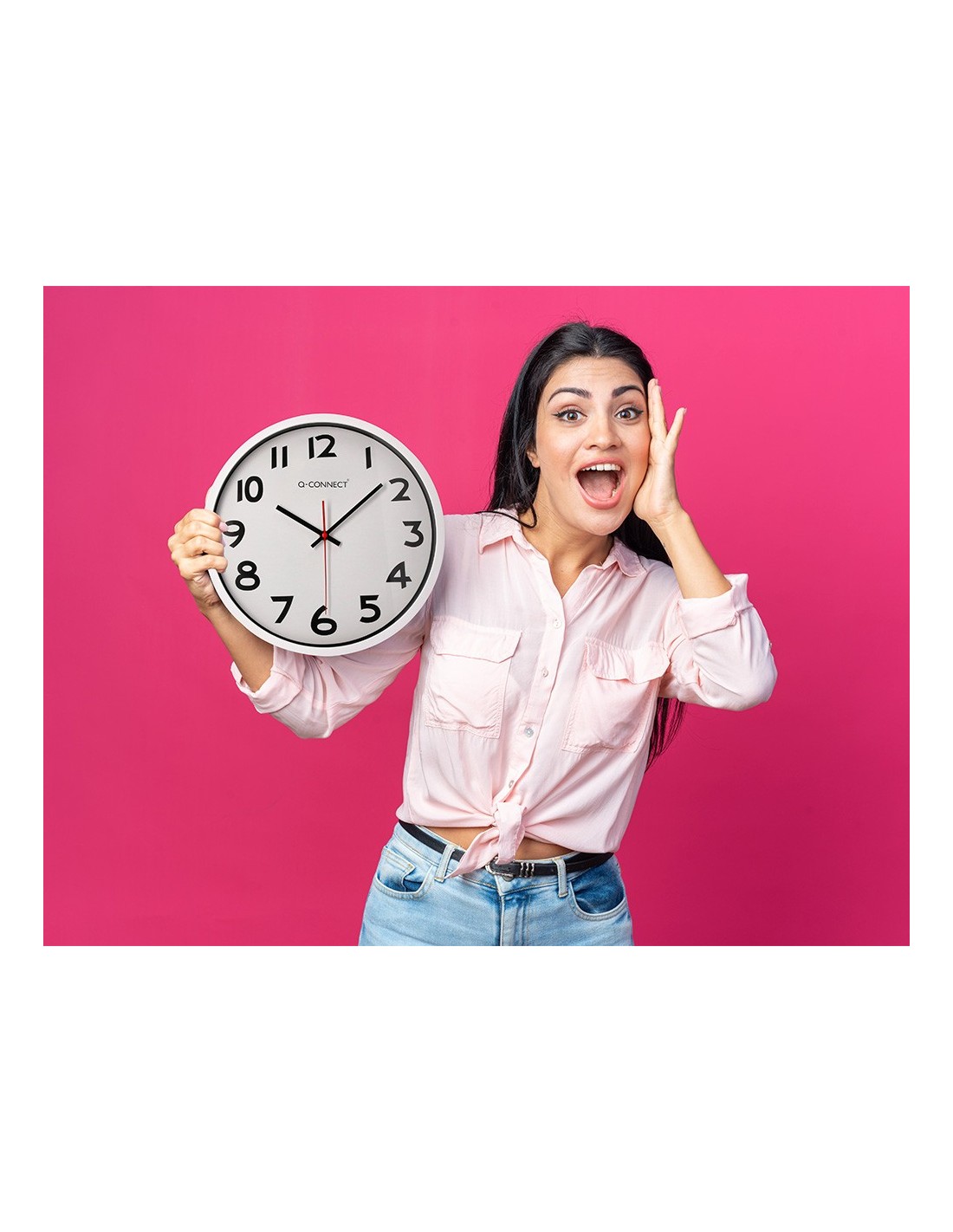Reloj de pared, diseño moderno y actual. Con números grandes y en color negro sobre una base blanca que facilita su lectura. Funciona con 1 pila AA (no incluida). Diámetro: 340 mm.
