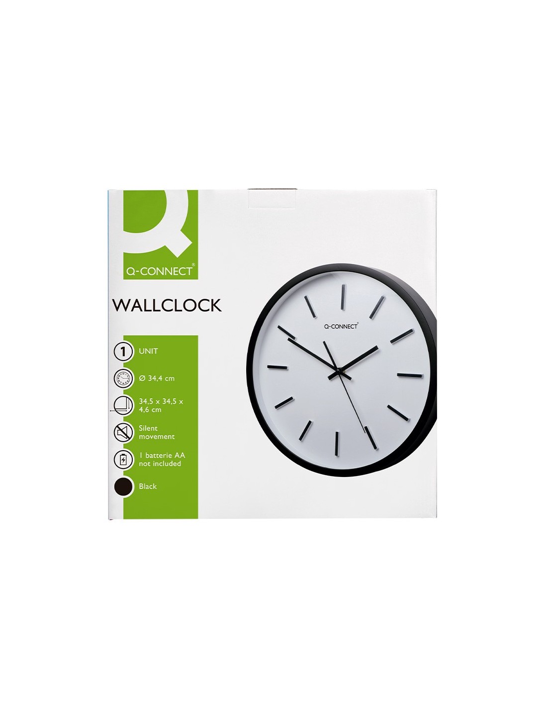 Reloj de pared, diseño moderno y actual. Marco de plástico de color negro. Color blanco y negro, estilo minimalista. Mecanismo silencioso. Funciona con 1 pila AA (no incluida). Diámetro: 344 mm.