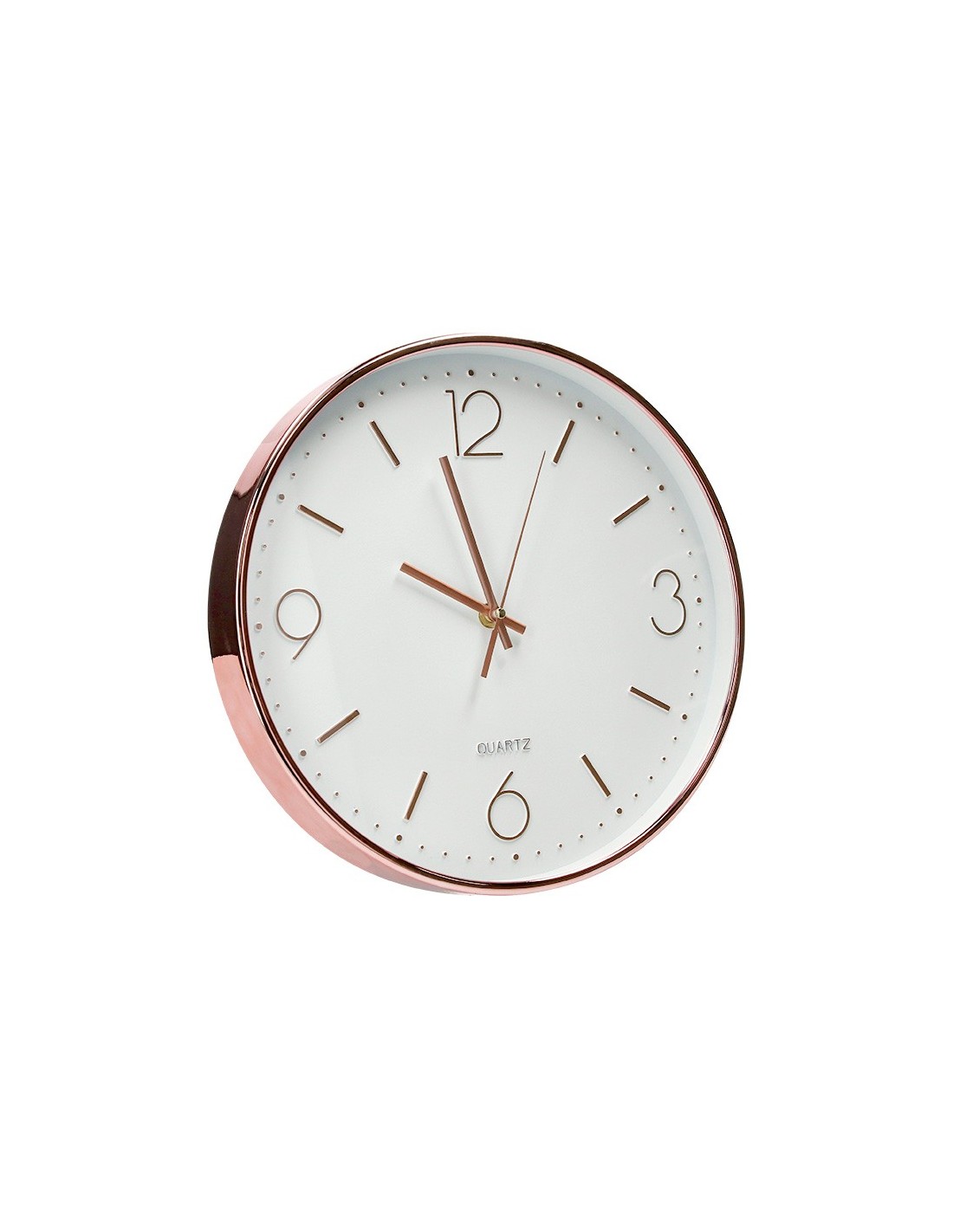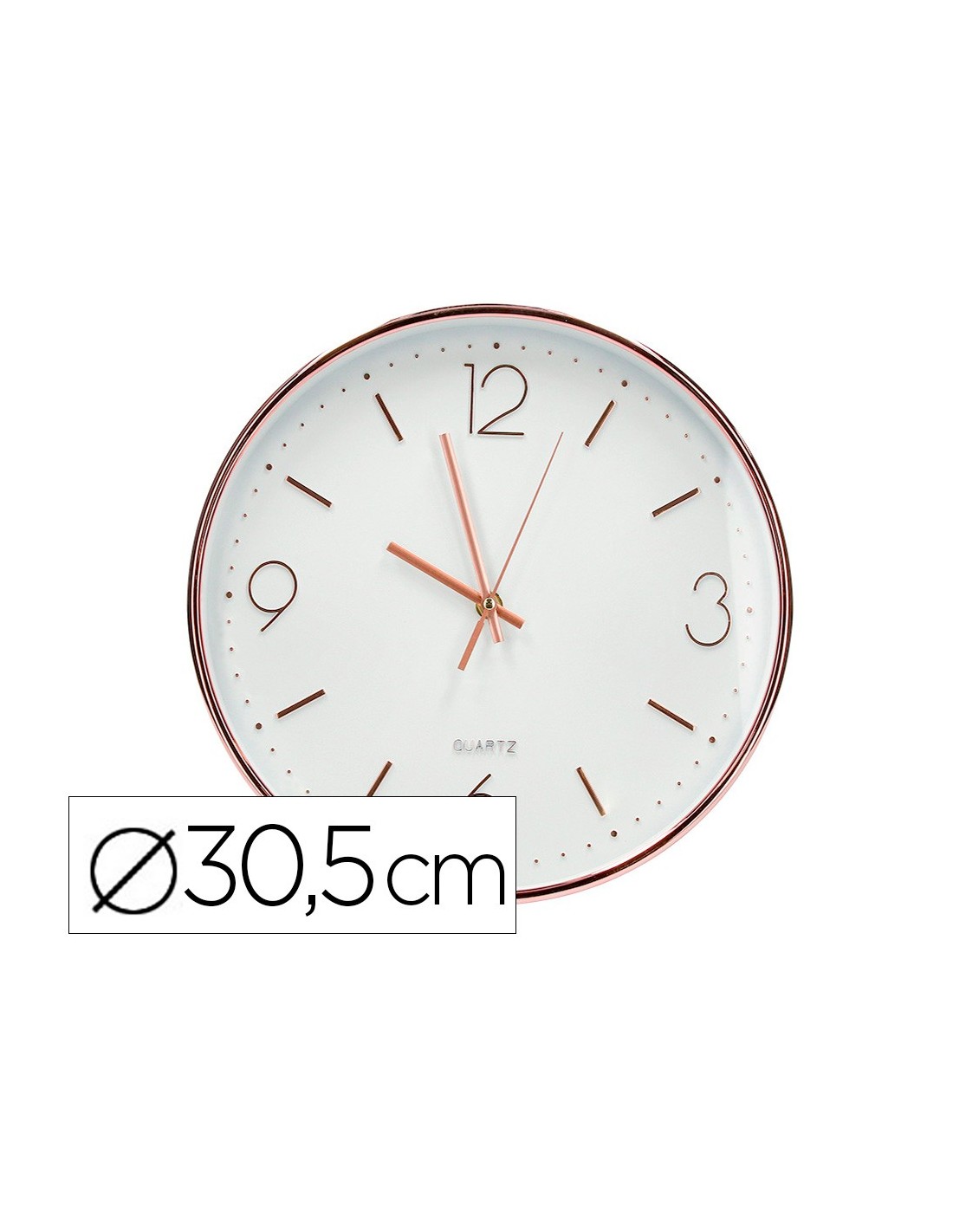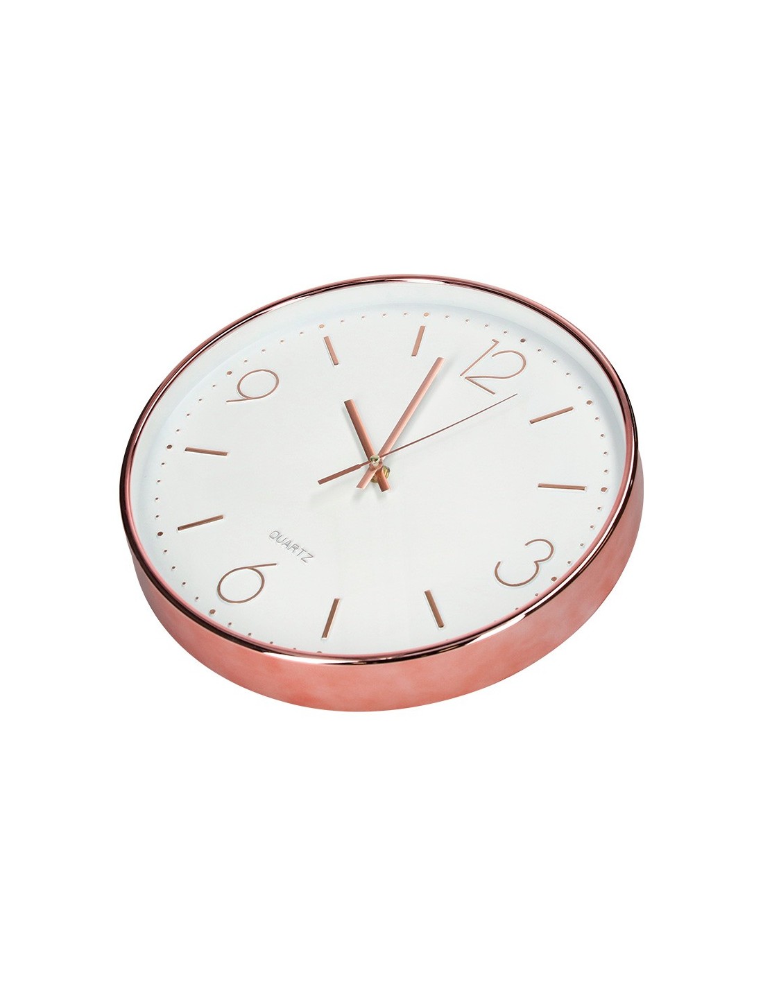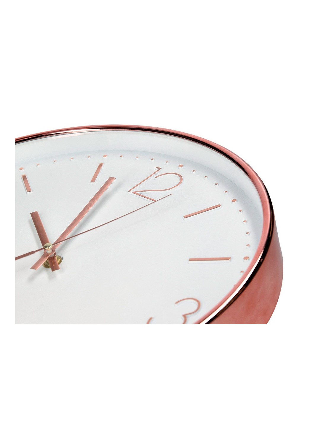 Reloj de pared, diseño actual y atractivo. Marco metálico de color oro rosa cromado. Con números grandes de color para una lectura fácil. Mecanismo silencioso. Funciona con 1 pila AA (no incluida). Diámetro: 305 mm.
