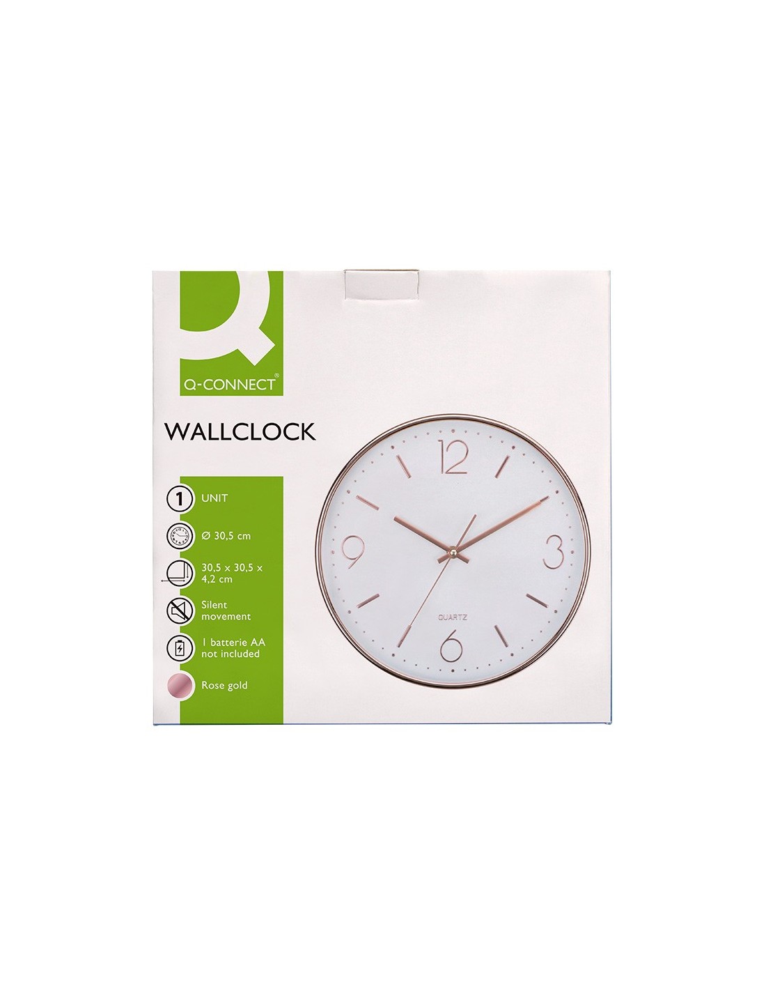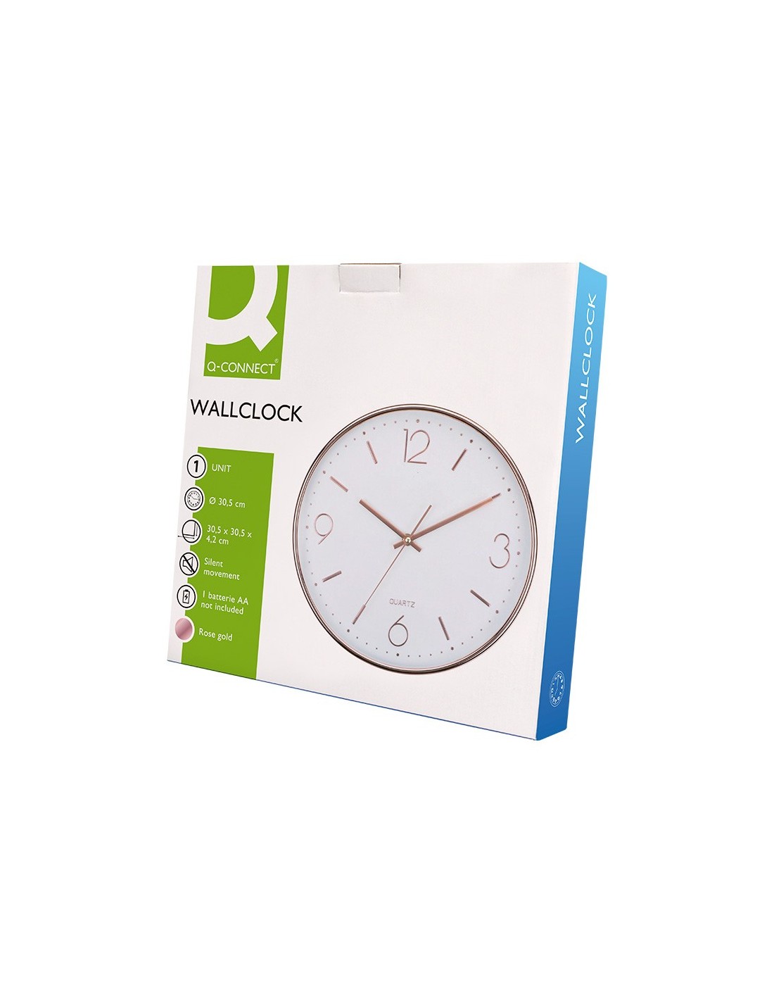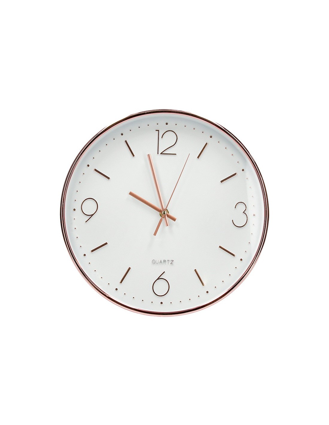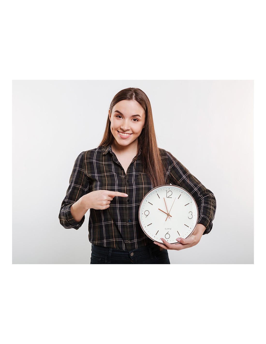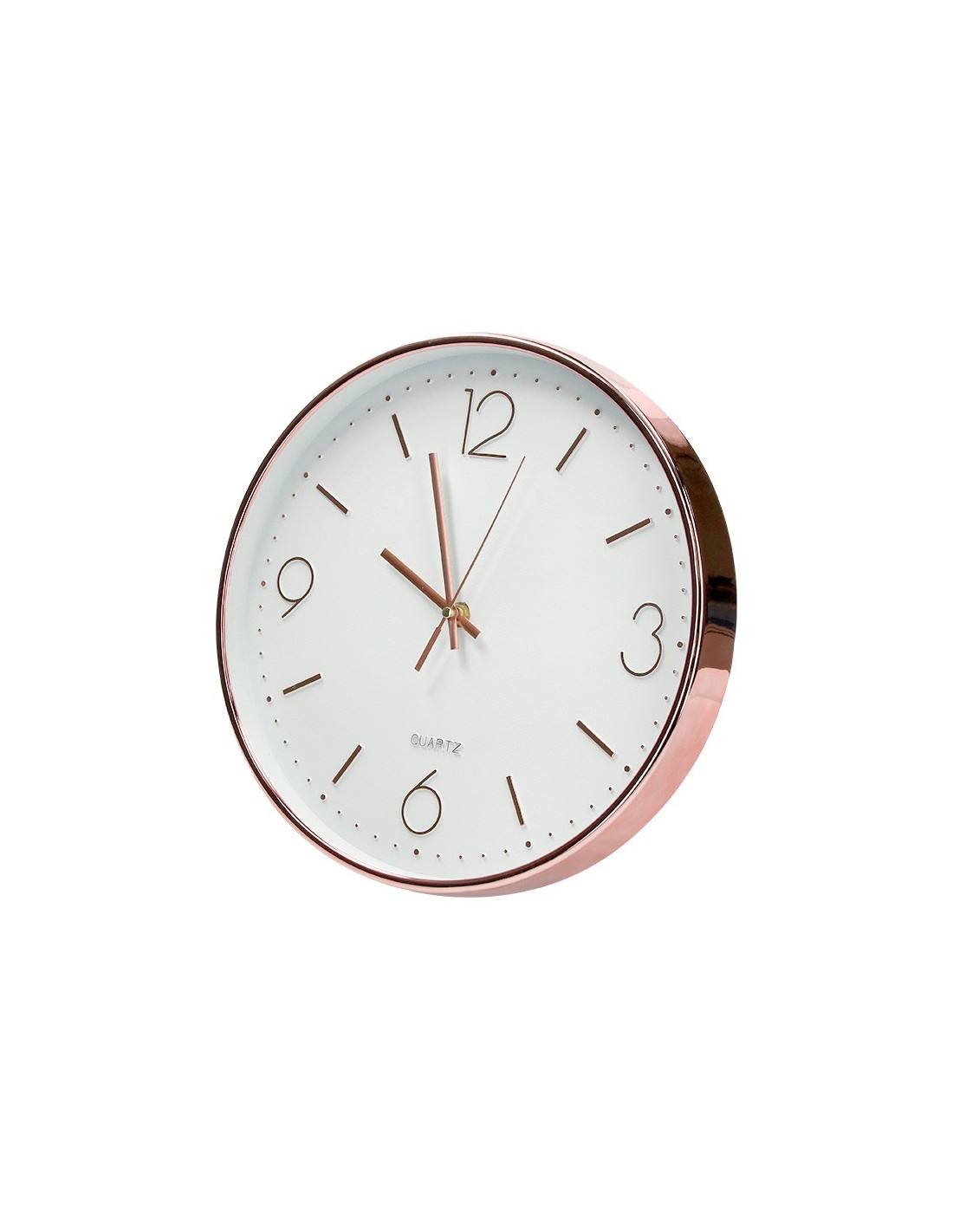 Reloj de pared, diseño actual y atractivo. Marco metálico de color oro rosa cromado. Con números grandes de color para una lectura fácil. Mecanismo silencioso. Funciona con 1 pila AA (no incluida). Diámetro: 305 mm.