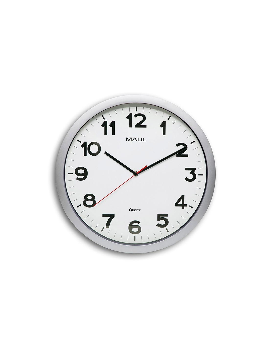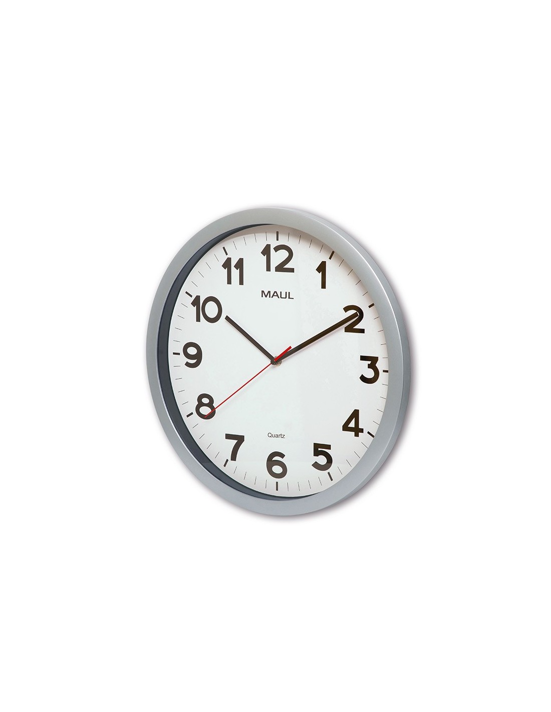Modelo estándar extra grande con diseño elegante. Moderno marco de plástico irrompible. Tipo de letra especialmente legible. Aspecto discreto para oficinas o el hogar. Cubierta plana de cristal mineral. De quarzo. Funcionamiento con pilas, incluida una pila de 1,5 V (AA). Números arábigos en negro, letra negrita. Altura de los dígitos 3,5 cm. Esfera blanca con unidades de minutos y horas. Eje en color puntero. Fijación mural mediante ojal de pera.