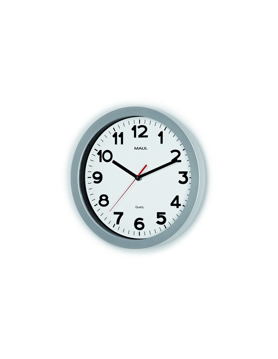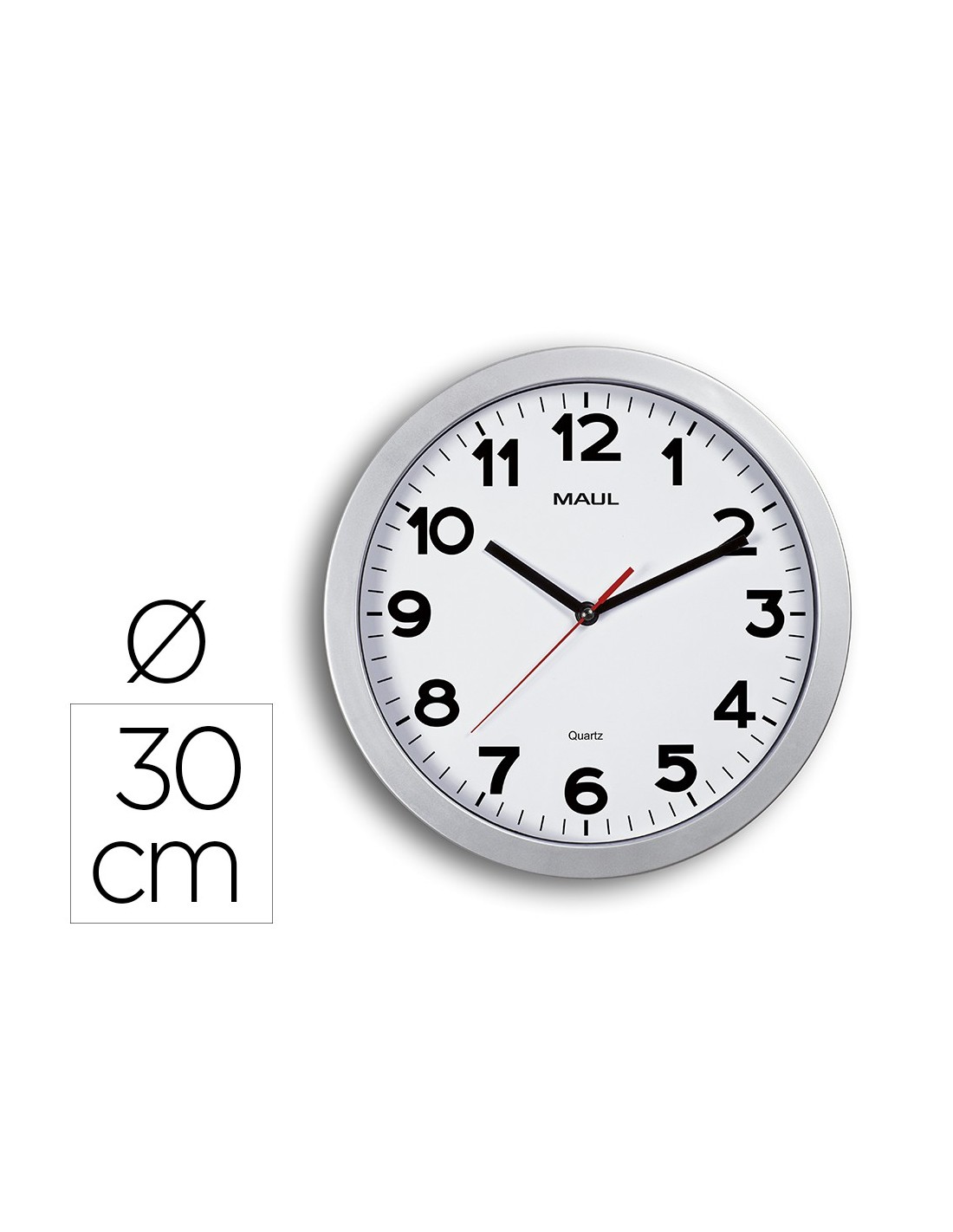 Modelo estándar con diseño elegante. Moderno marco de plástico irrompible.Tipo de letra especialmente legible. Aspecto discreto para oficinas o el hogar. Cubierta plana de cristal mineral. De quarzo. Funcionamiento con pilas, incluida una pila de 1,5 V (AA). Números arábigos en negro, letra negrita. Altura de los dígitos 2,5 cm. Esfera blanca con unidades de minutos y horas. Eje en color puntero. Fijación mural mediante ojal de pera.