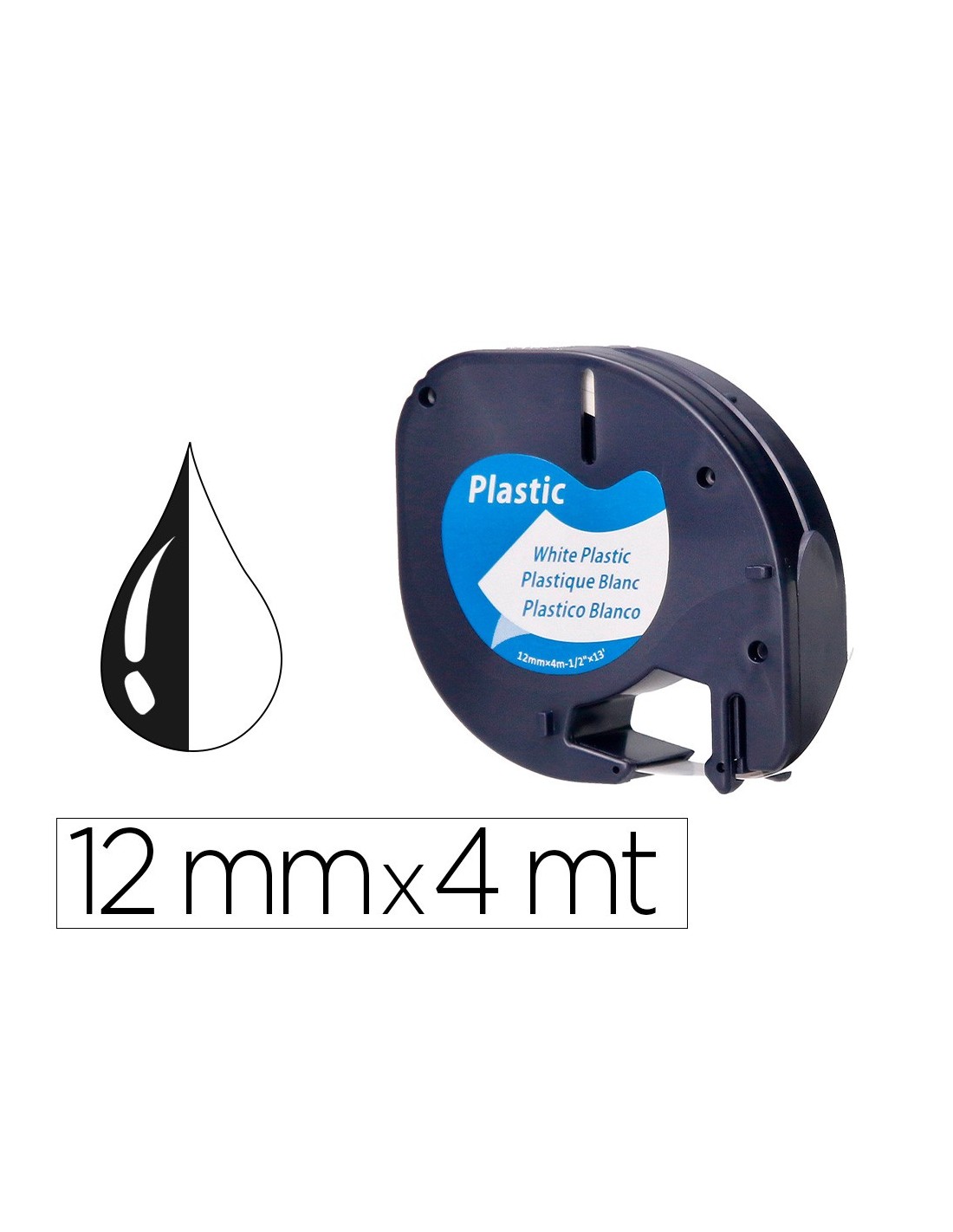 Cinta compatible para su rotuladora DYMO. Diferentes colores de impresión y fondos. Buena calidad a un buen precio. Puede pegarse en una variedad de superficies. Ampliamente utilizado en la oficina, casa, escuela, hospital, etc. Medidas: 12 mm x 4 m.
