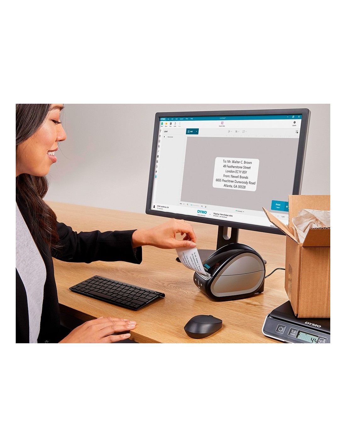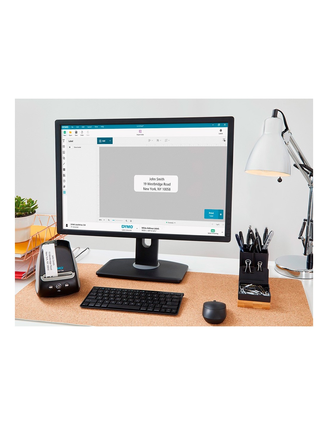 Impresora de etiquetas sin tinta para PC y Mac®. Utiliza la tecnología de impresión térmica directa, sin necesidad de tinta o tóner. Cree e imprima etiquetas de direcciones, para carpetas de archivos, códigos de barras y más desde su PC o Mac® a través del software DYMO® Connect. Imprime hasta 62 etiquetas por minuto. Diseño gráfico nítido con una resolución estándar de 300 x 300 DPI. Incluye: LabelWriter 550, 1 rollo básico de etiquetas de direcciones (28 mm x 89 mm), un adaptador de CA, un cable de alimentación, un cable USB, una guía de referencia rápida y 2+1 años de garantía limitada. Medidas: 160 x 140 x 270 mm. Peso: 1,3 kg.