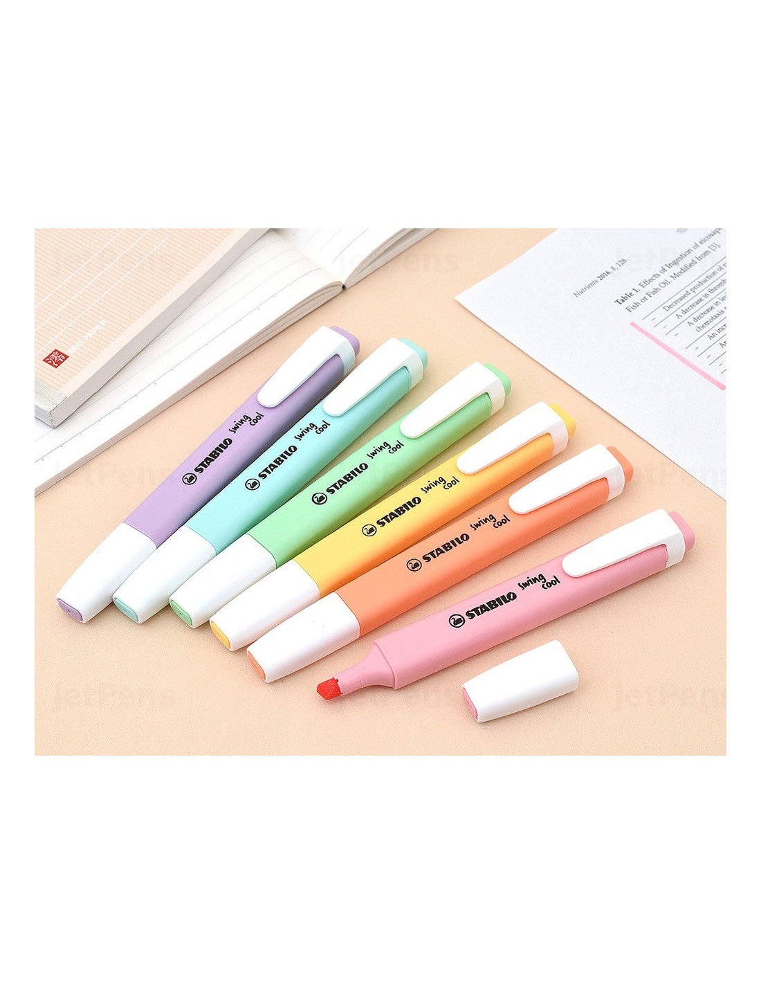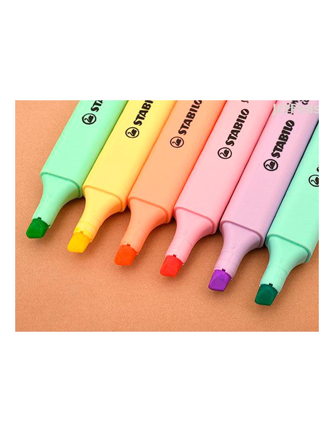 Rotuladores fluorescentes en colores pastel. Con tecnología anti secado (4 horas destapado sin secarse). Tinta a base de agua, resistente a la luz en todo tipo de papel: normal, fax, fotocopia, etc. Capuchón ventilado. Punta biselada. Modelo plano de bolsillo. Trazo de 2 a 5 mm.