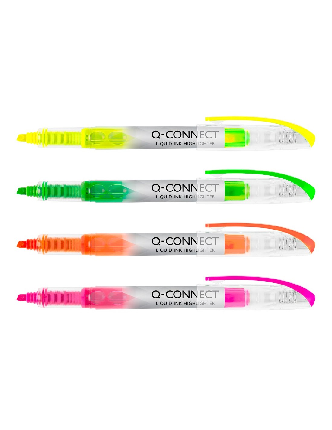 Rotulador fluorescente con punta biselada para resaltar información importante. Adecuado para la mayoría de los papeles. Cuerpo de plástico transparente que permite ver el nivel de tinta. Tinta líquida a base de agua de colores vibrantes: amarillo, rosa, naranja y verde. Esperanza de vida: 2 años. Trazo de 1 a 4 mm. Incluye 4 rotuladores.