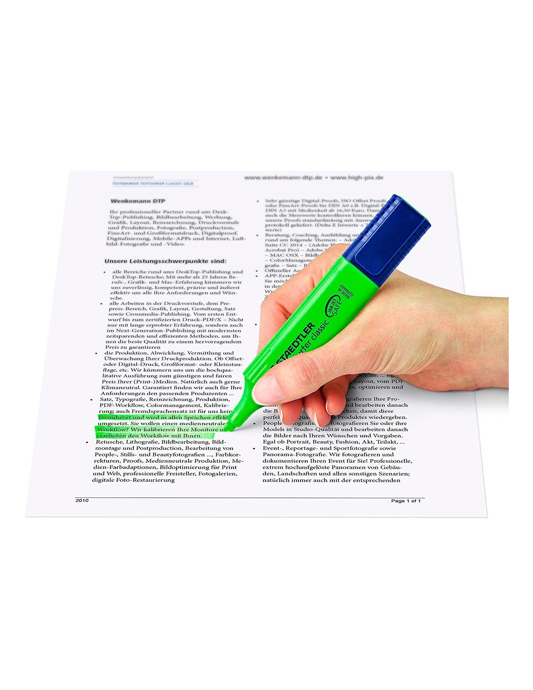 Con gran depósito de tinta para resultados de resaltado de máxima duración. INK·JET SAFE: no emborrona las impresiones inkjet ni los textos manuscritos. COPY PROOF: los colores violeta y turquesa permanecen visibles en las fotocopias. Cuerpo y capuchón en PP, que garantiza una larga vida del producto. Recargable. Punta biselada ultrasuave con trazo de 1-5 mm aproximadamente.