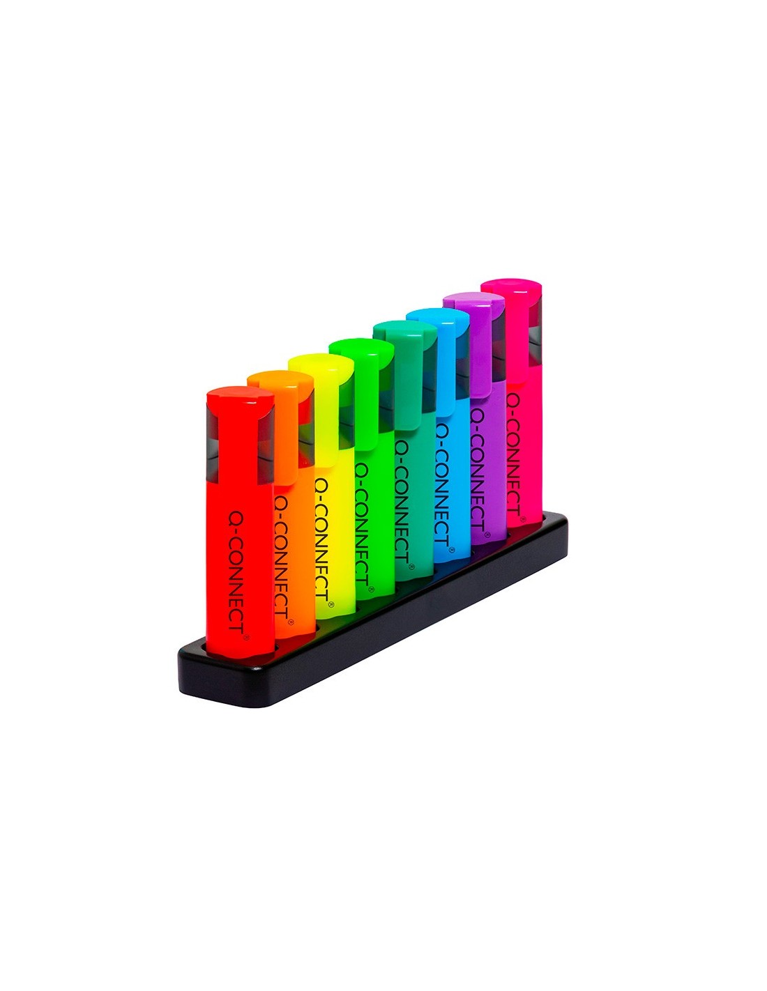 Estuche de sobremesa con 8 rotuladores fluorescentes con punta biselada colores neón surtidos. Tinta con base de agua. Cuerpo del color de la tinta. Capuchón con clip. Trazo entre 1 y 5 mm.