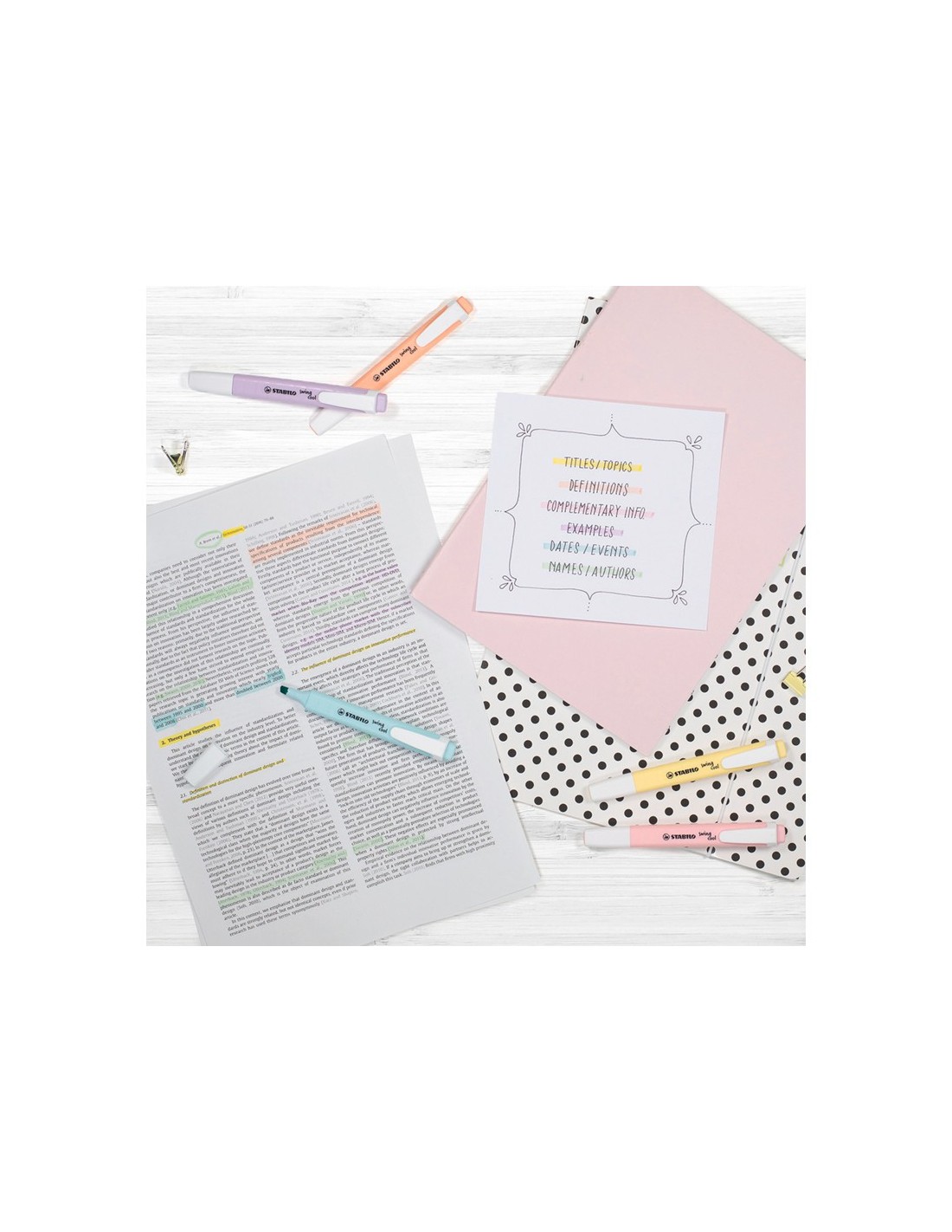 Rotuladores fluorescentes en colores pastel. Con tecnología anti secado (4 horas destapado sin secarse). Tinta a base de agua, resistente a la luz en todo tipo de papel: normal, fax, fotocopia, etc. Capuchón ventilado. Punta biselada. Modelo plano de bolsillo. Trazo de 2 a 5 mm.