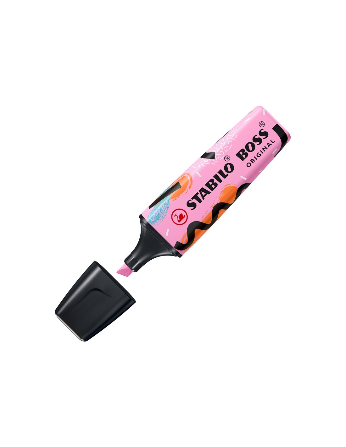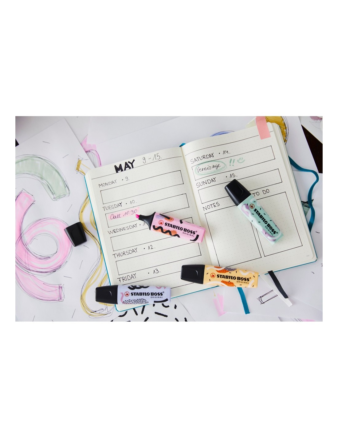 Marcador Stabilo Boss Original Pastel by Ju Schnee. Diseño moderno de la joven artista Ju Schnee con una impresión completa en el fluorescente. Los subrayadores pastel crean reflejos sutiles y agregan más estructura a los textos. Tecnología Antisecado STABILO: 4 horas de protección antisecado para concentrarse en el trabajo. 2 anchos de trazo 2 + 5 mm. Recargable. Tinta con base acuosa para papel, copias o fax. Económica y fácil recarga. Incuestionable líder de mercado.