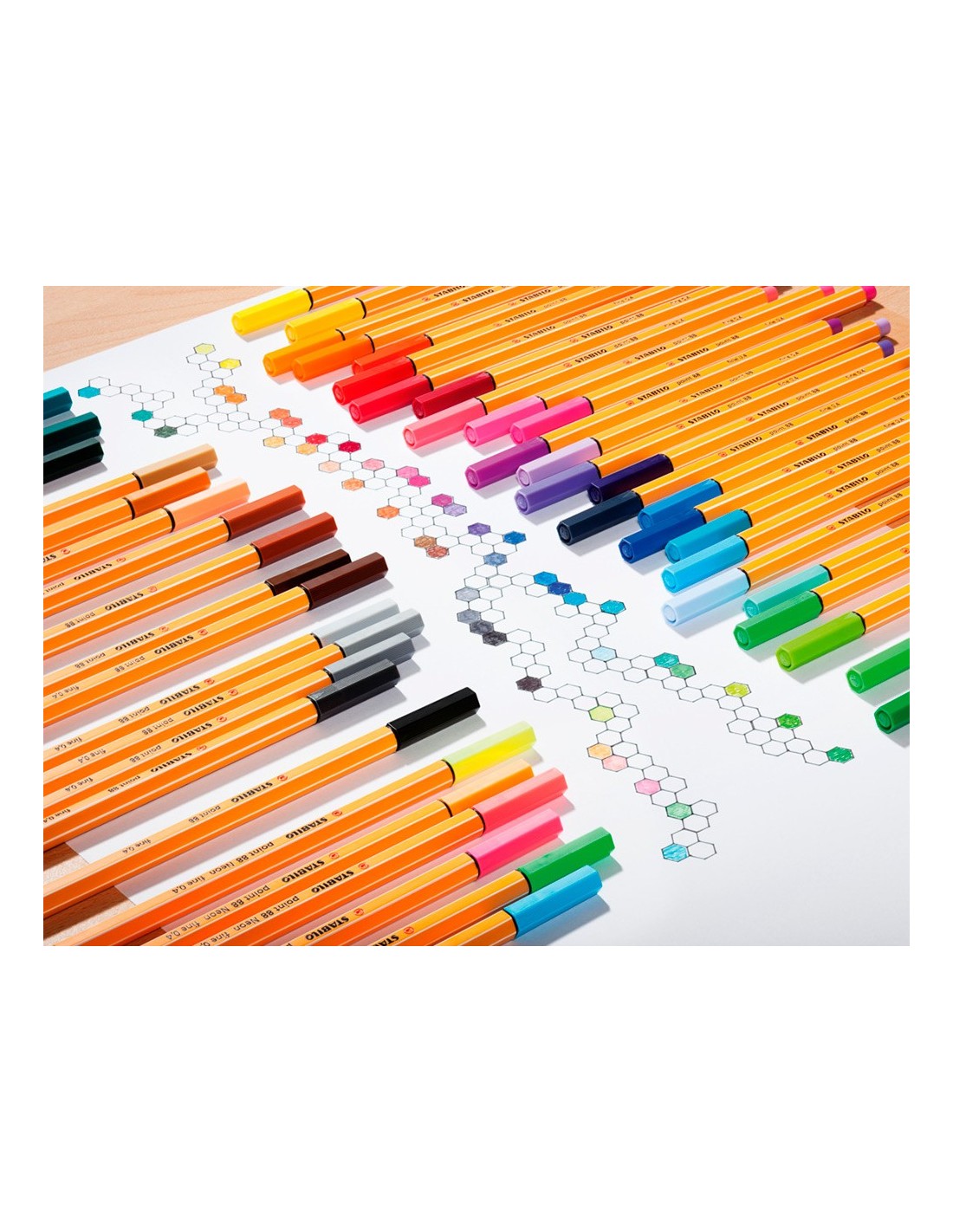 Rotulador con punta fina número uno en Europa. Con un diseño hexagonal de finas líneas inconfundibles. Punta de fibra con refuerzo de metal para una larga vida. Apta para usar con reglas y plantillas. Tinta con base al agua. Larga vida sin tapón. Trazo de 0,4 mm.
