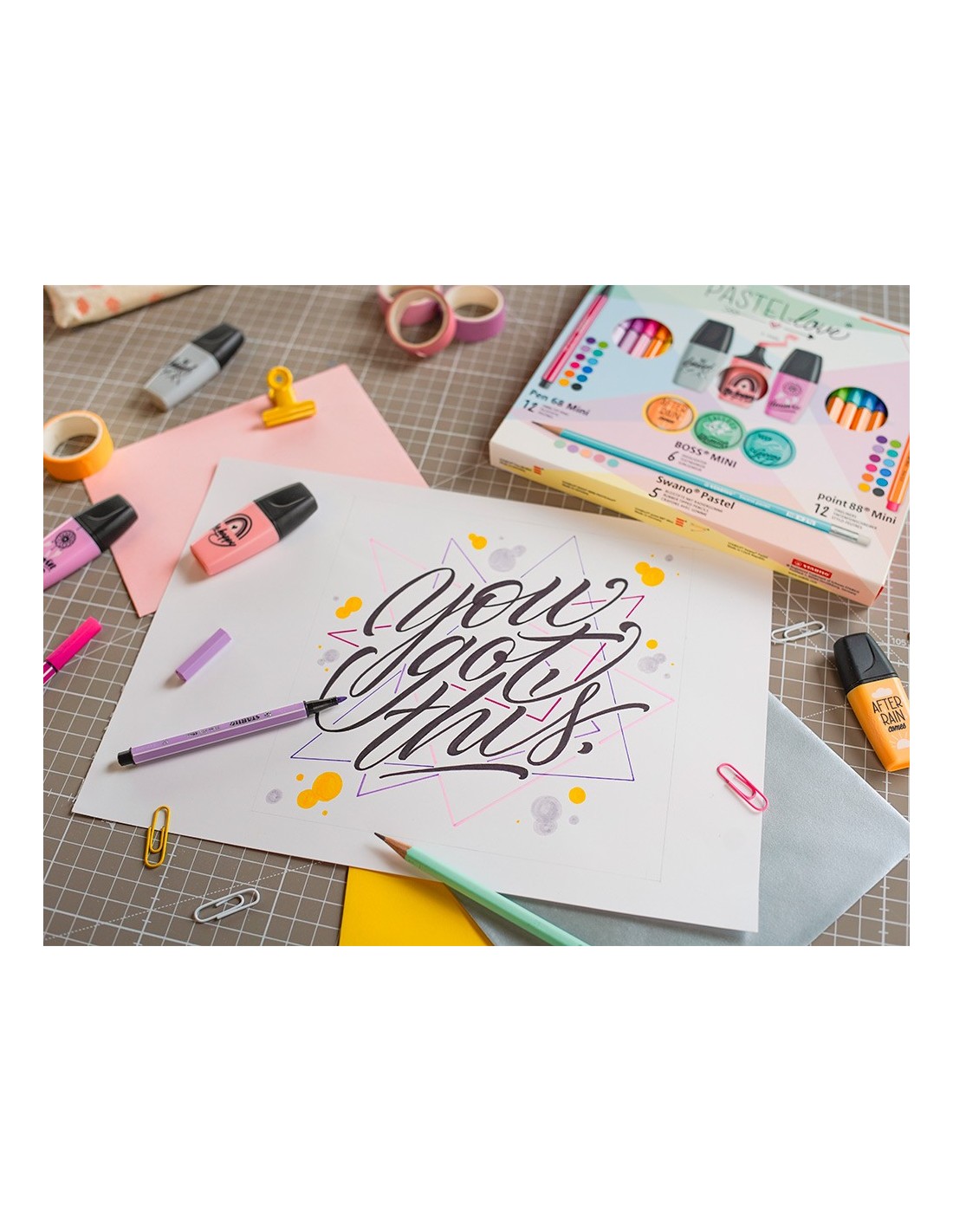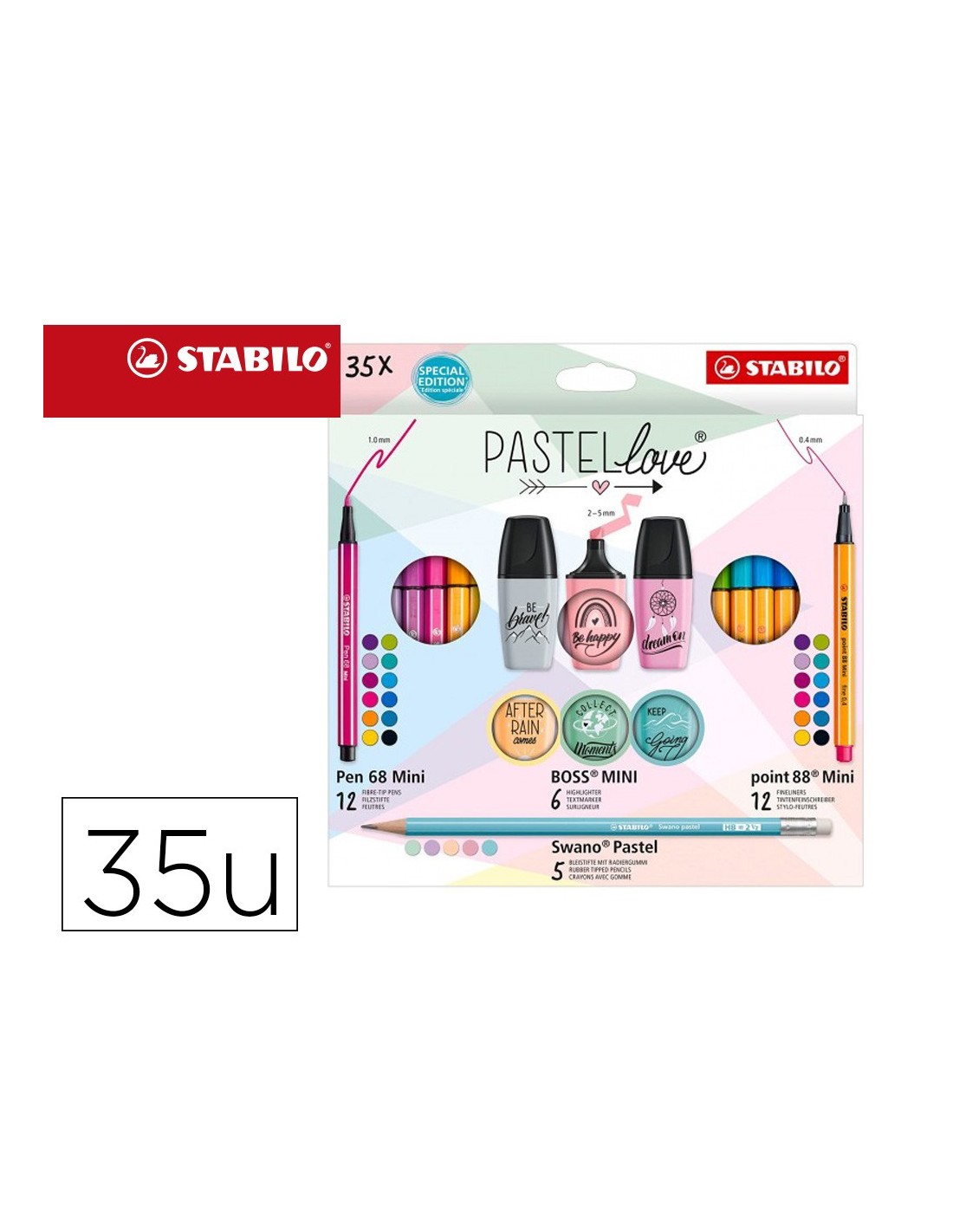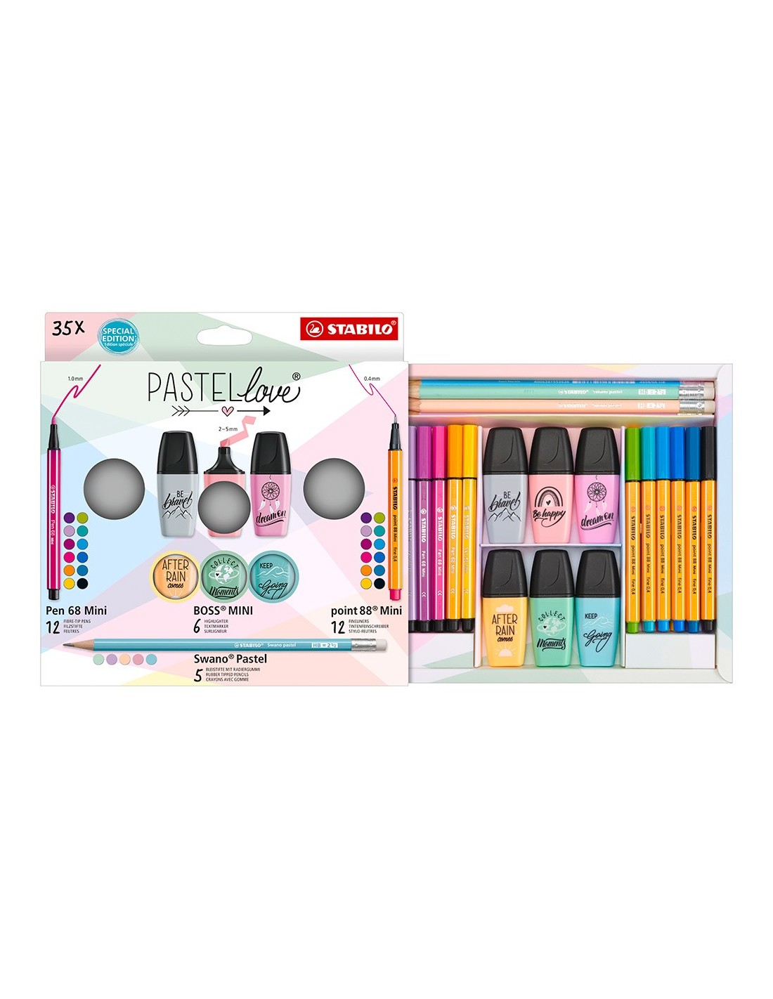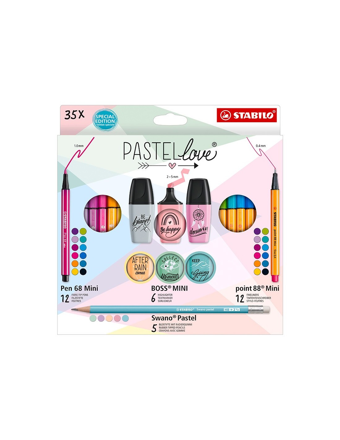 Estuche Stabilo Pastellove Collection con 12 rotuladores premium Pen 68 Mini, 12 rotuladores punta fina point 88 Mini, 6 marcadores mini Pastellove 2.0 y 5 lápices de grafito Swano Pastel. Pen 68 Mini: Alto brillo y luminosidad. Tinta inodora a base de agua. Punta resistente tamaño M (aprox. 1 mm de grosor) para un colorido homogéneo. Tapón ventilado. Puede estar hasta 24 horas destapado sin secarse. Point 88 Mini: Rotulador punta fina Stabilopoint 88 Mini. El punta fina nº1 de Europa en formato Mini. Diseño hexaginal rayado, conocido en todo el mundo. Punta con refuerzo de metal para larga duración. Ancho de línea 0.4 mm. No se seca si se deja sin tapón durante largos periodos. Tapón ventilado. Boss Mini Pastellove Edition 2.0: : El clásico StabiloBoss Original con un formato mini. Colores pastel, suave y de moda. Tecnología Stabiloanti-secado: 4 horas de protección anti-secado para concentrarse en el trabajo. 2 anchos de trazo: 2 + 5 mm. Tinta cuosa. Caben en todos los estuches - ¡