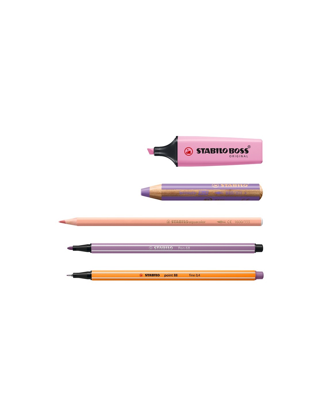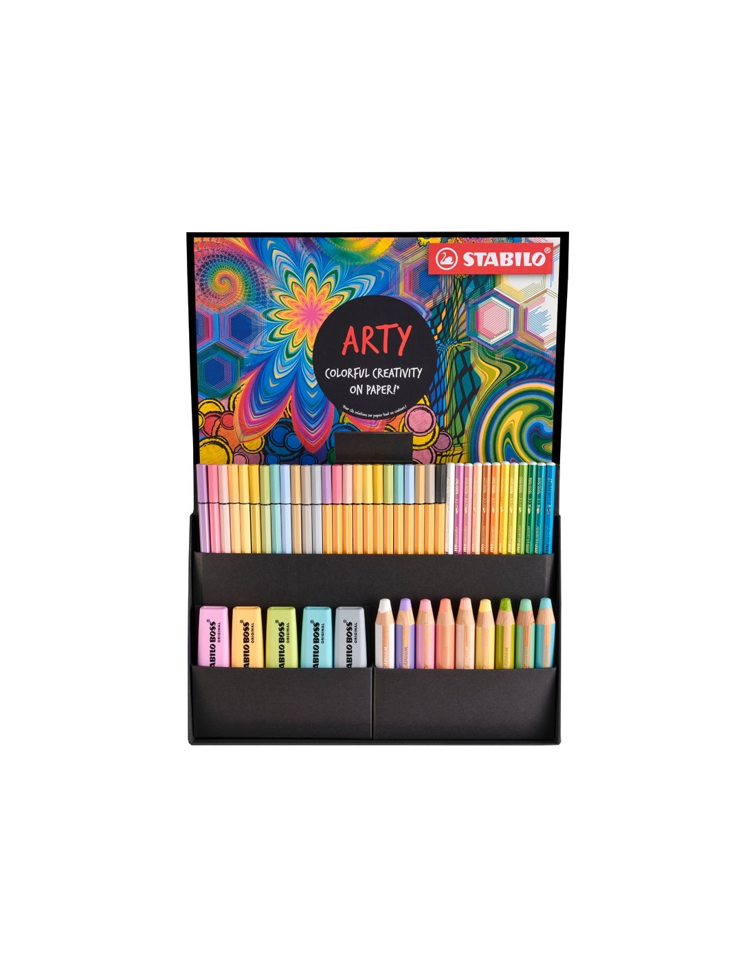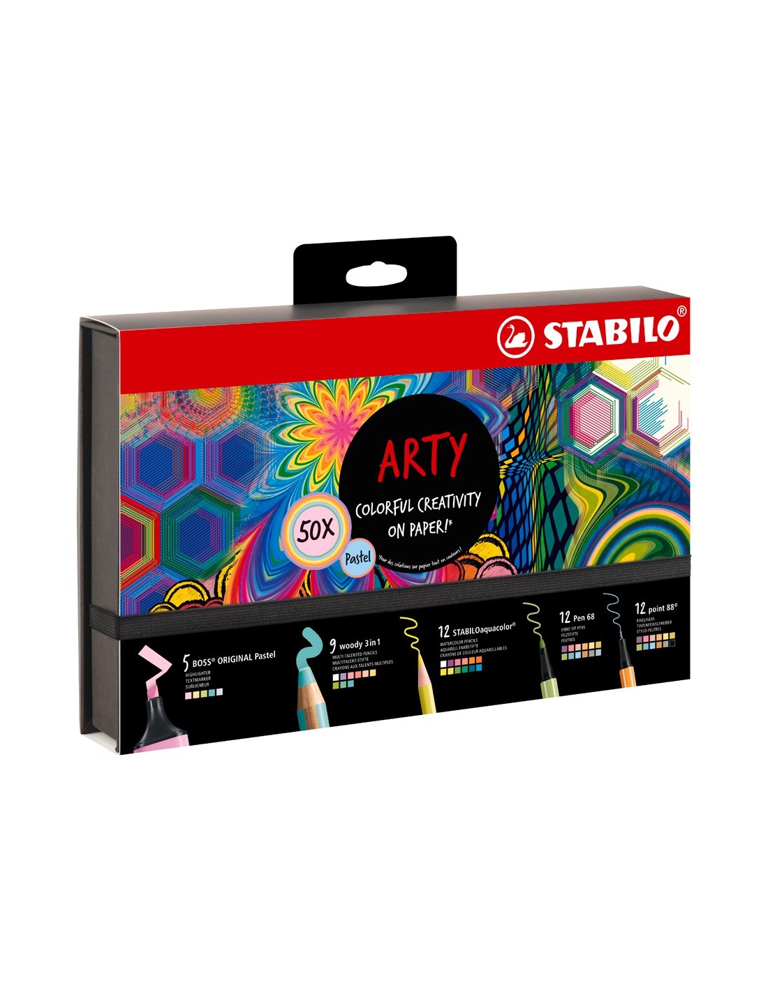 Maletín de cartón Stabilo Arty con 5 marcadores BOSS Original Pastel, 9 lápices de color multitalento woody 3 en 1, 12 lápices de color aquacolor, 12 rotuladores premium Pen 68 y 12 rotuladores punta fina point 88
