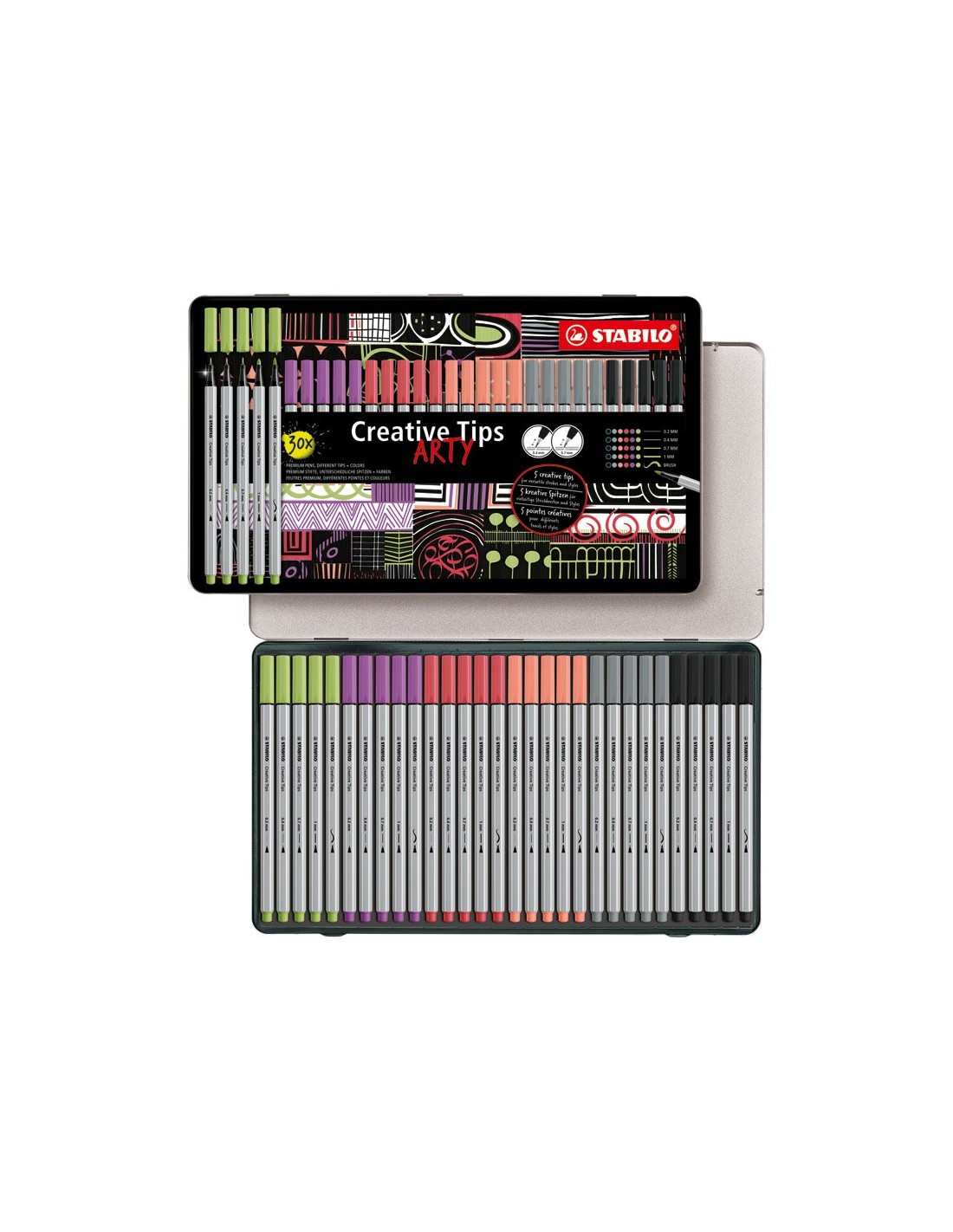 Rotulador Stabilo Creative Tips. Estuche Arty con 30 rotuladores (5 puntasdiferentes) en 6 colores pasteles.