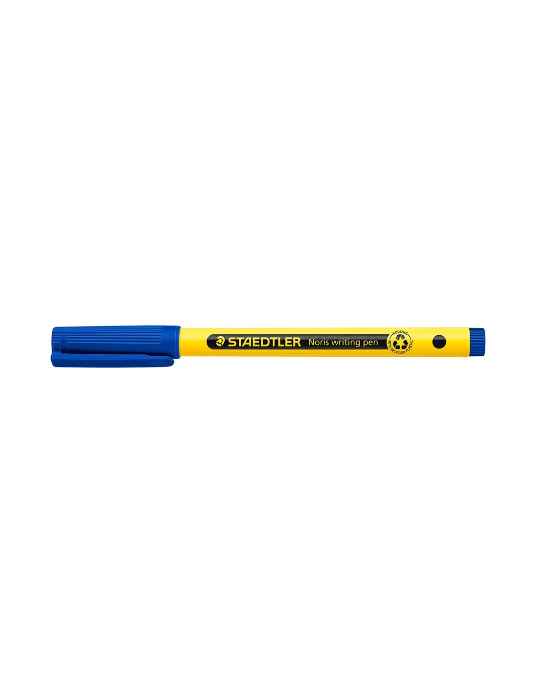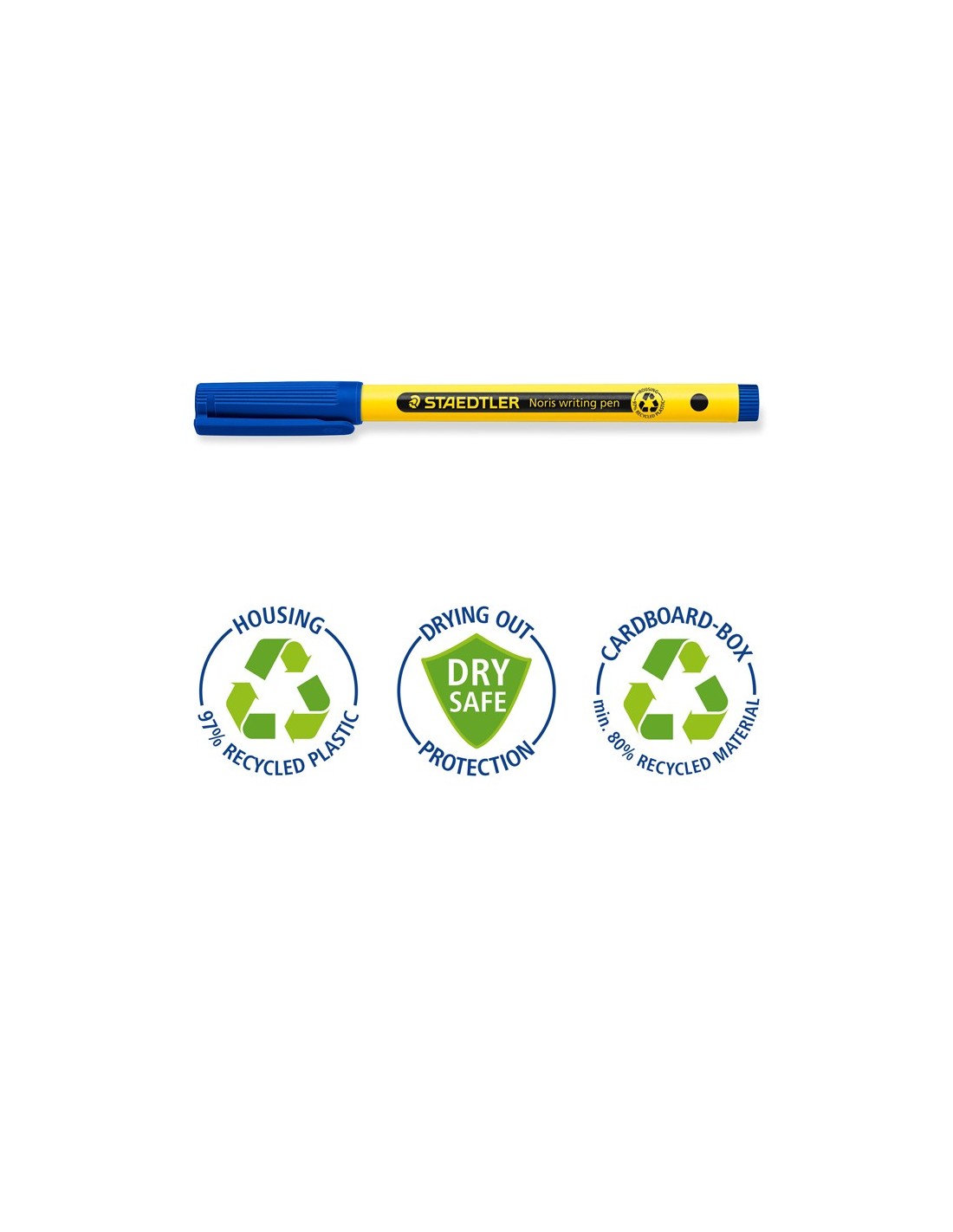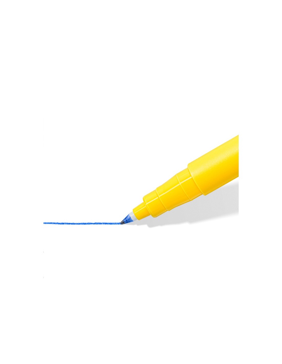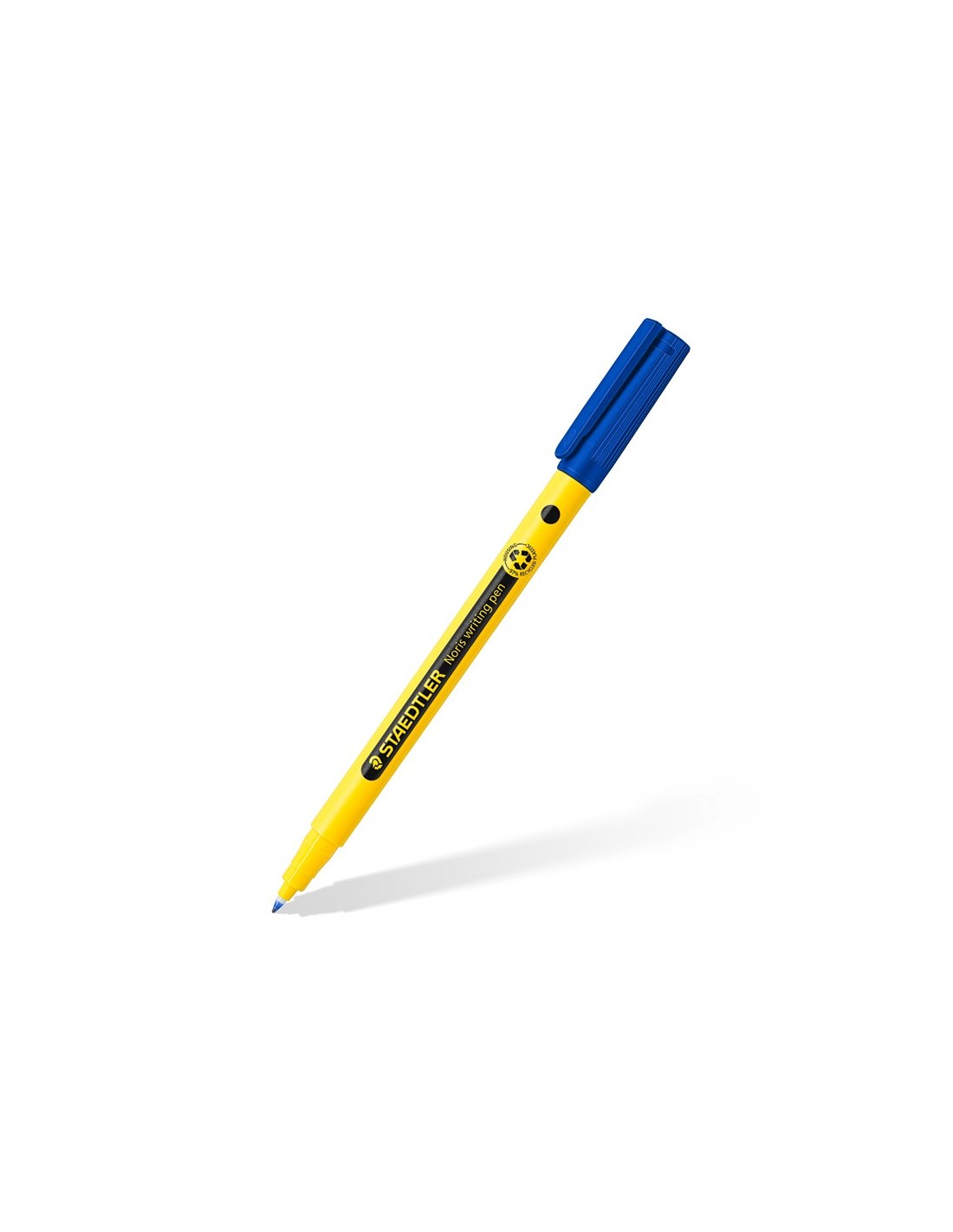Rotulador Staedtler Fineliner con cuerpo en colores amarillo y negro y capuchón en color de la tinta. Carcasa fabricada en un 97% de plástico reciclado (cuerpo, capuchón y embellecedor) según ISO 14021. Punta antisecado Dry Safe resistente a la presión. Lavable sobre la mayoría de tejidos. PuntaF (aprox. 0,6 mm). Color azul.
