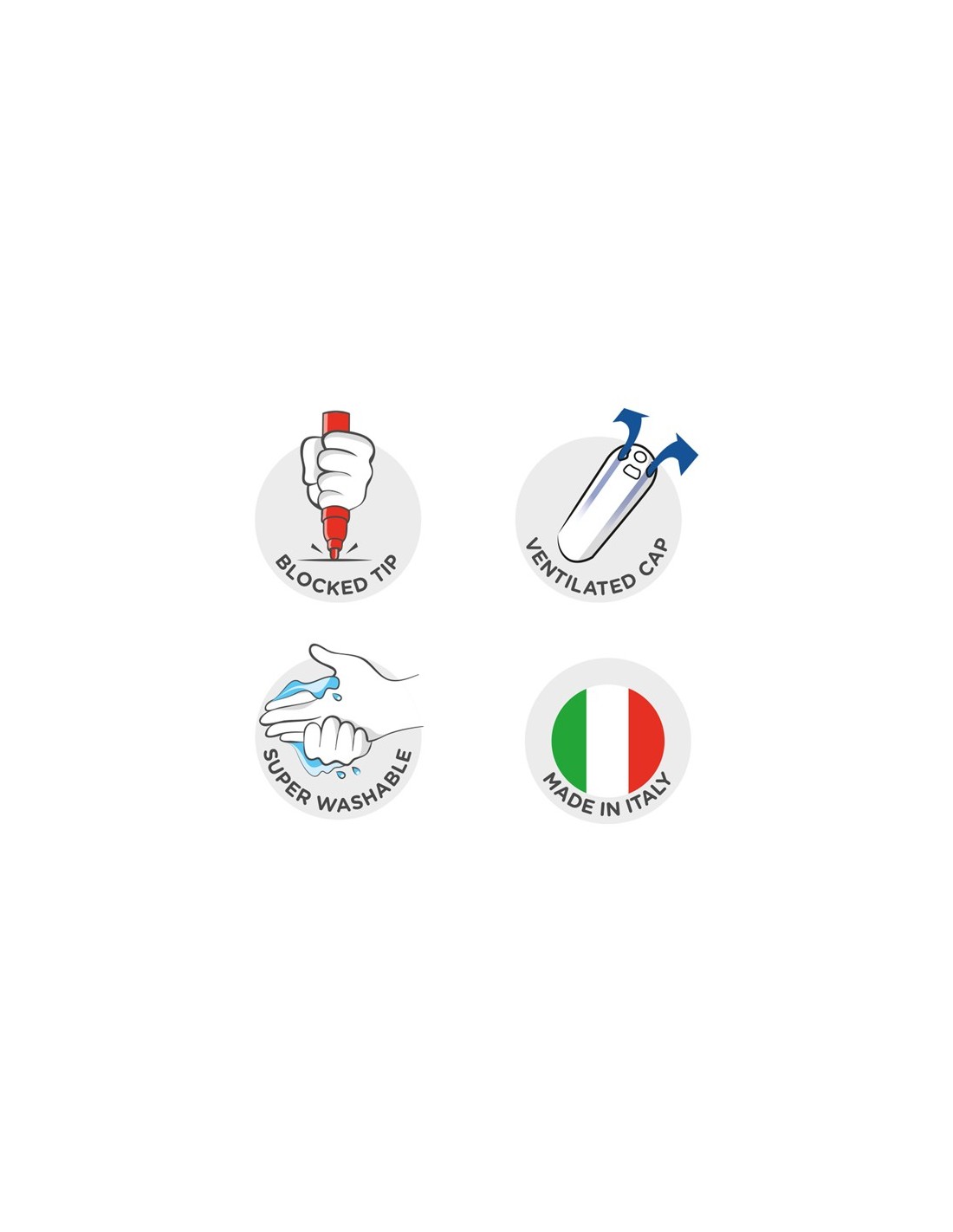 Punta de nylon de 2,6 mm de diámetro. Tinta a base de agua y colorantes alimentarios inocuos y lavables. Punta bloqueada. Permite hasta 800 m de escritura. Sin gluten.