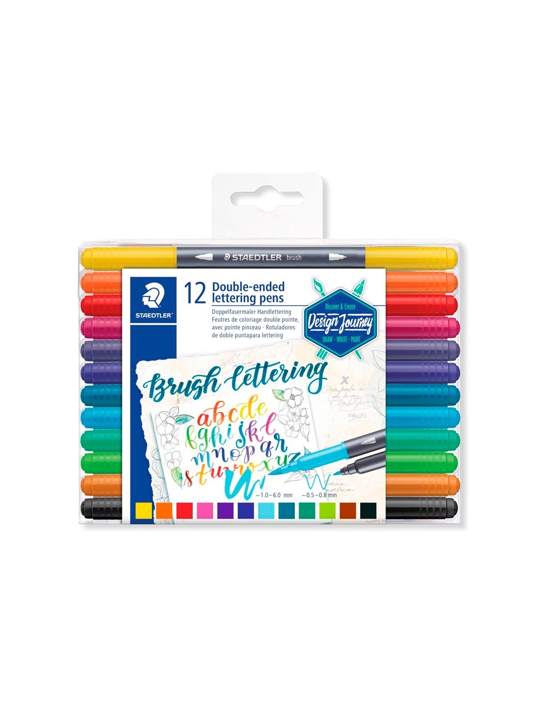 Rotulador de pincel de doble punta para hand lettering y trazos de anchos variables. Perfecto para efectos maravillosos con facilidad de mezcla entre colores. También ideal para bullet journaling, ilustraciones, manga y coloreado. Estuche con 12 rotuladores, colores surtidos. Trazo aproximado de la punta rotulador: 0,5-0,8 mm. Trazo aproximado de la punta pincel: 1,0-6,0 mm.