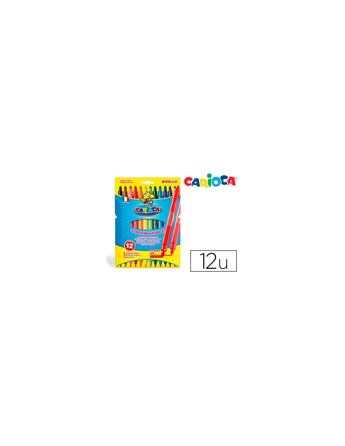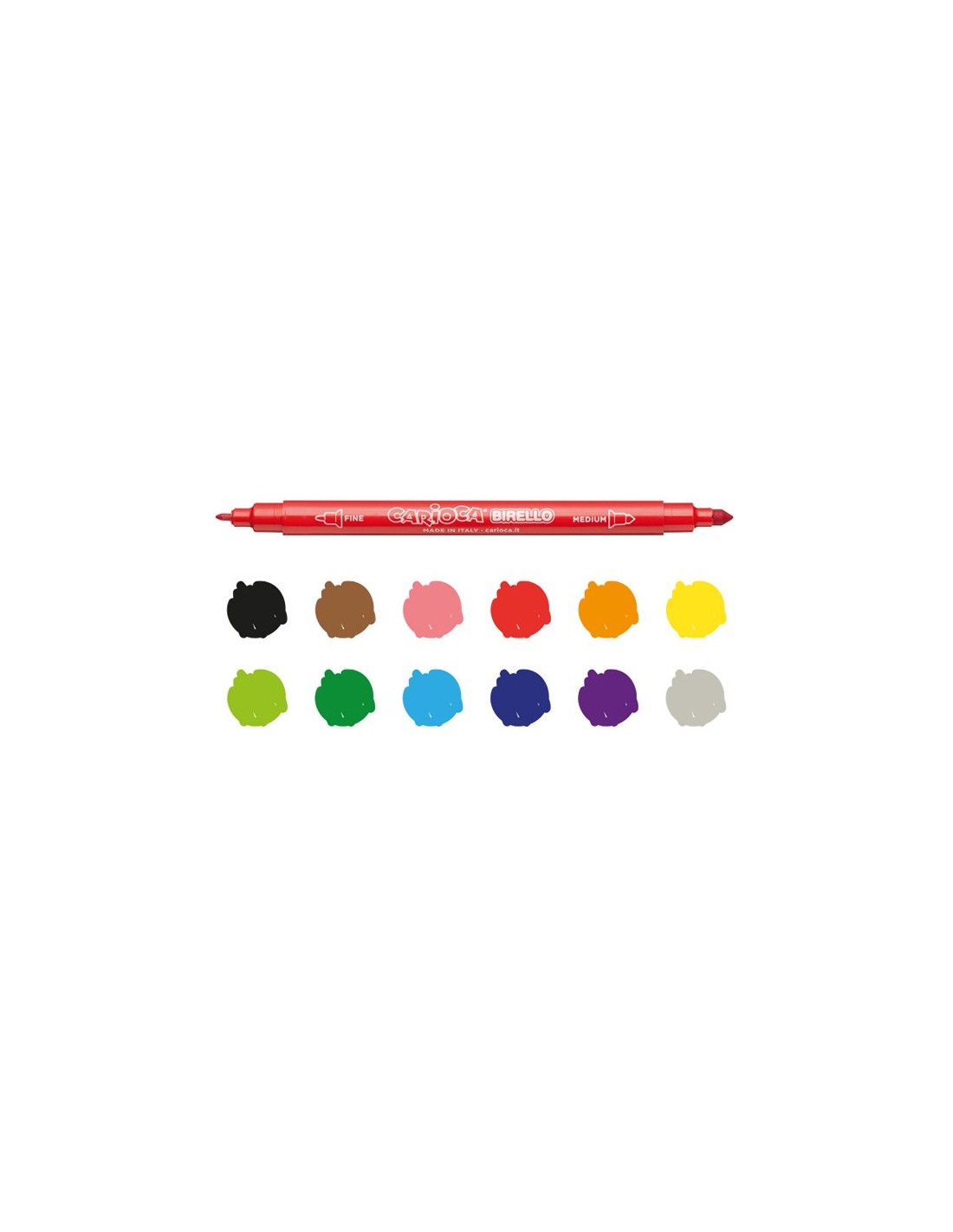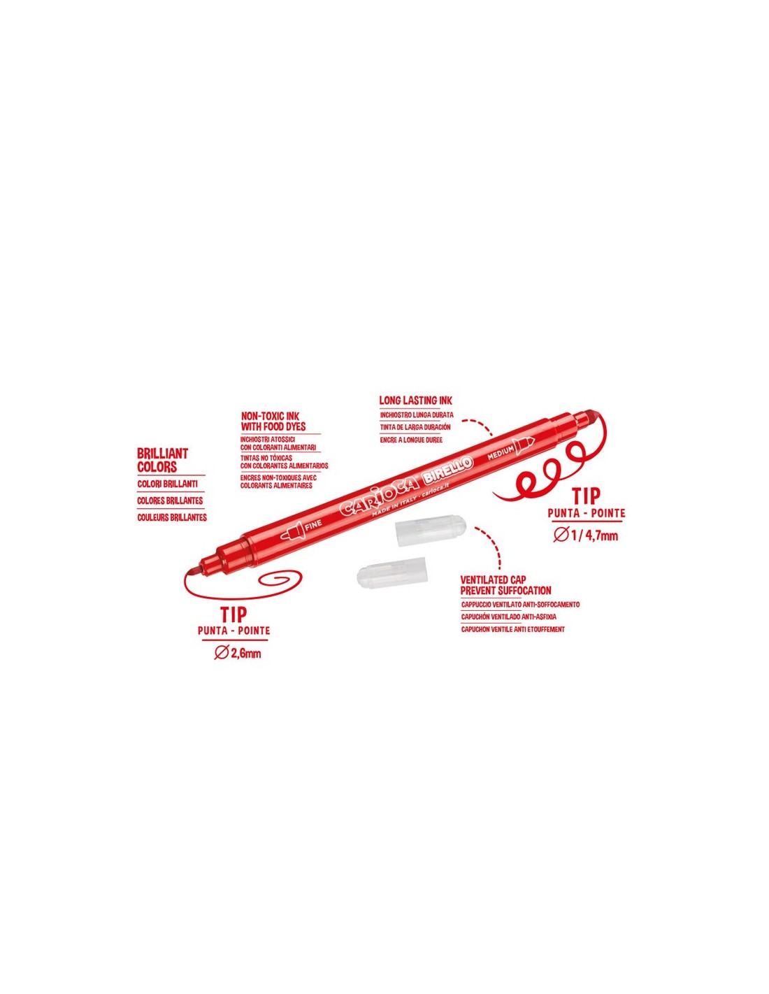 Rotuladores escolares con dos tipos de punta. La punta más gruesa es de 4,7 mm de diámetro y la más fina de 2,6 mm. Lavable, punta de fibra.
