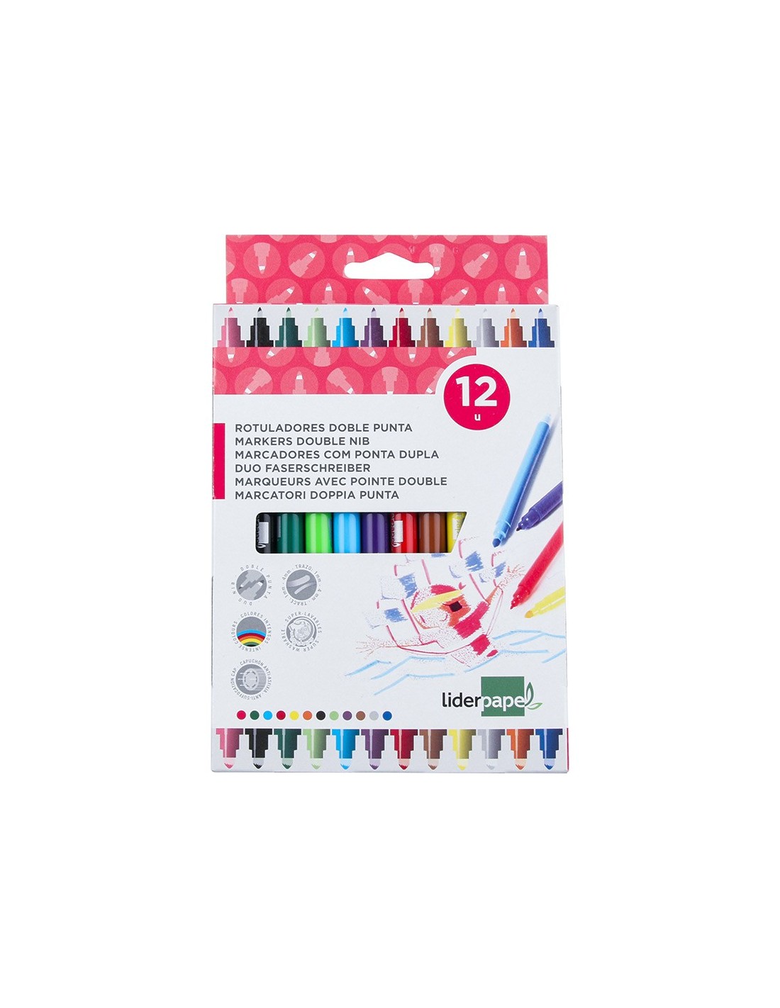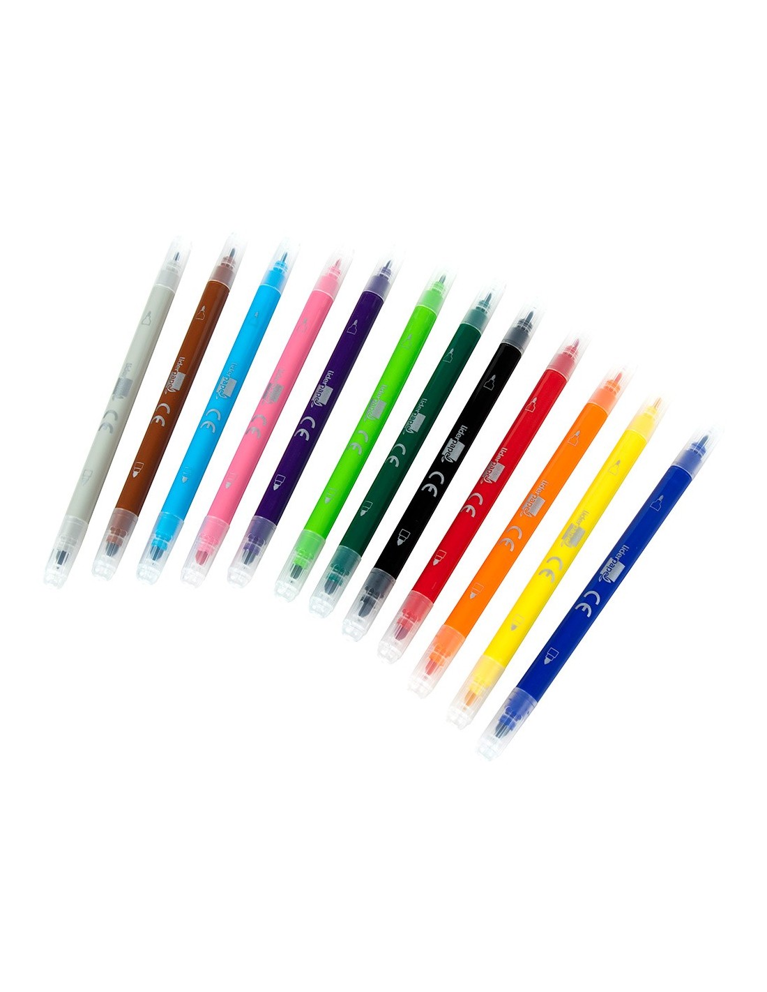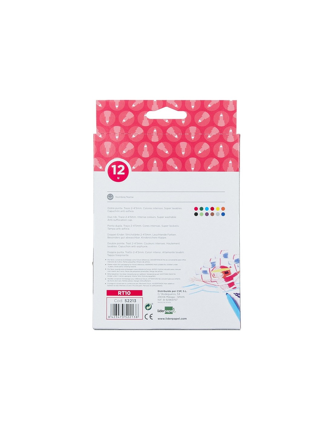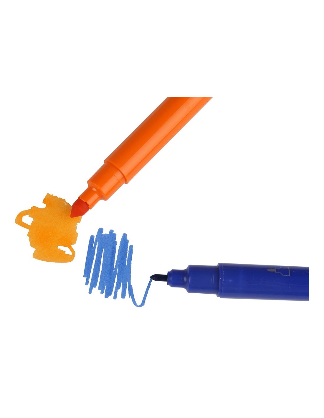 Rotulador con dos puntas de fibra, una gruesa de 5 mm de diámetro y por el otro lado una fina de 2,5 mm. Tinta a base de agua y colorantes alimentarios inocuos y lavables. Permite hasta 800 m de escritura.