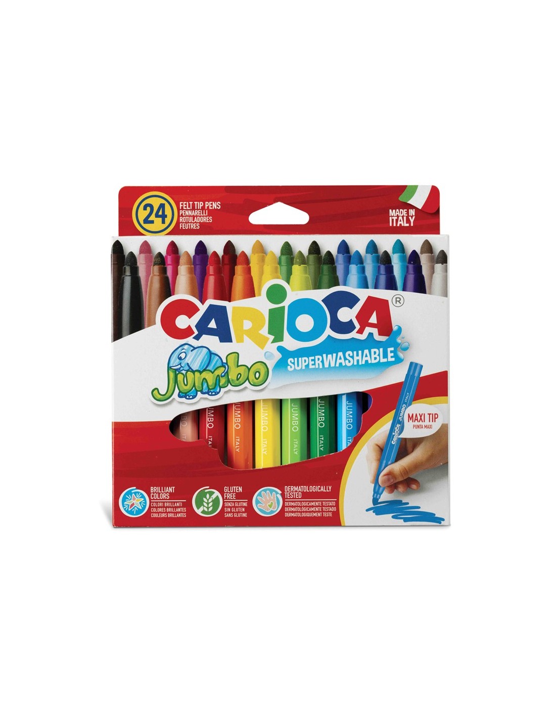 Apto para el uso escolar. No recomendado para menores de 3 años. Punta gruesa. Diámetro: 6 mm. Sin gluten. Lavable. Punta bloqueada.