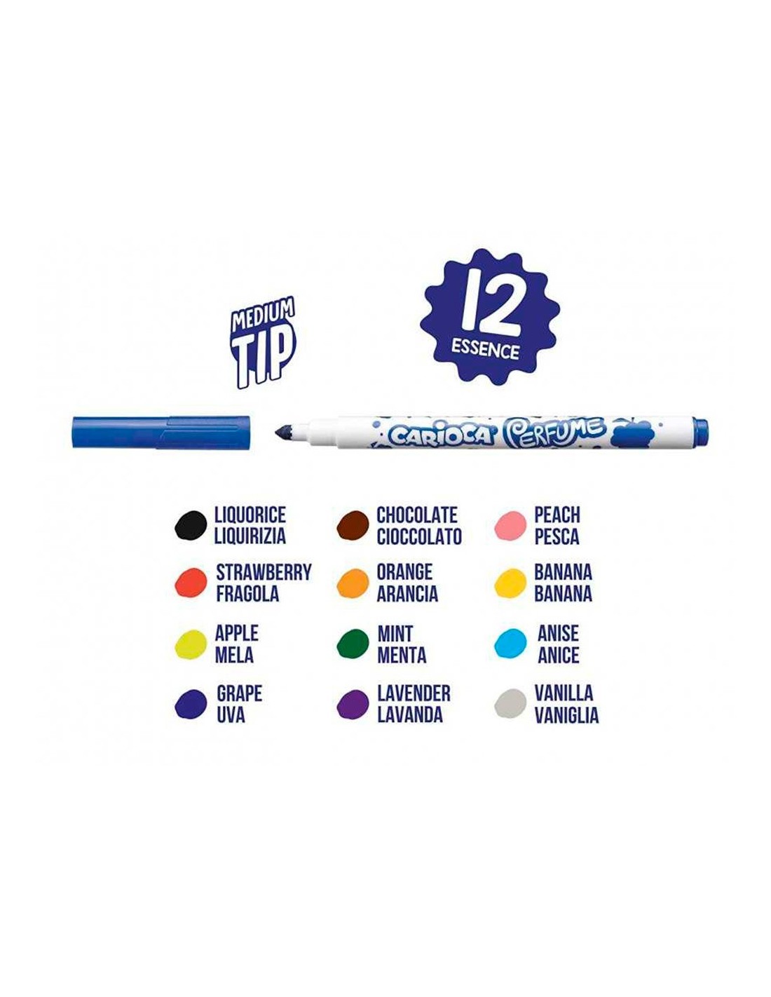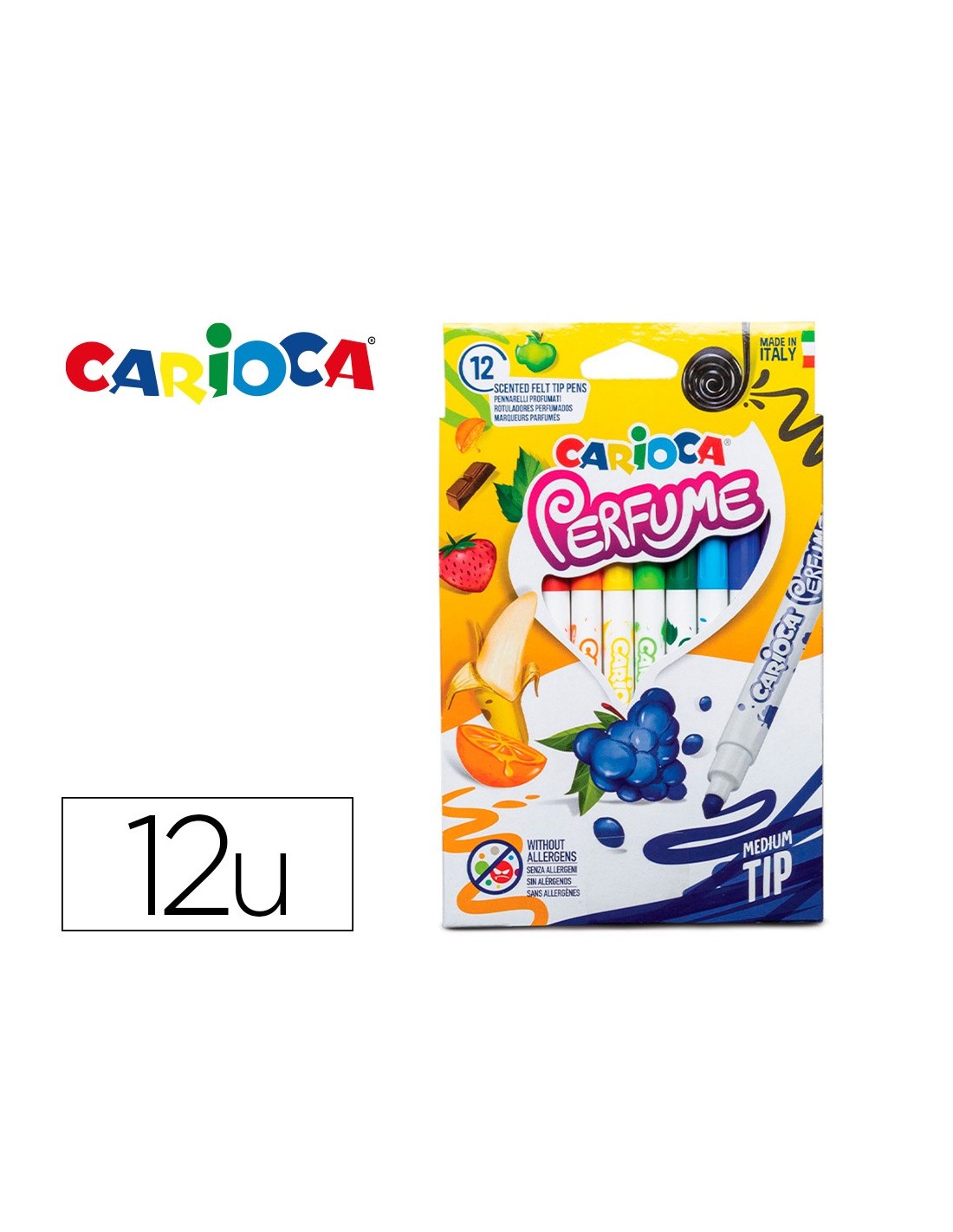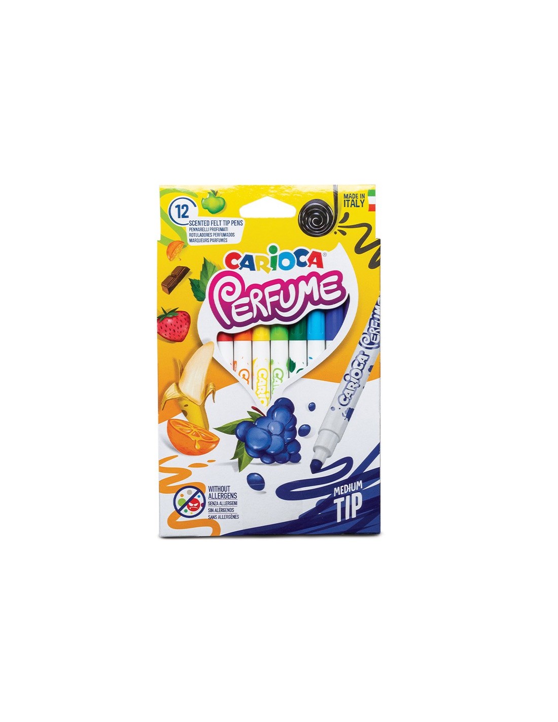 Rotuladores perfumados de doble punta con sellitos, tinta perfumada y lavable, los aromas usados han sido seleccionados rigurosamente para evocar las esencias naturales, libre de sustancias alergénicas, punta bloqueada, cónica, para un doble trazo de escritura. Caja de 12 unidades.