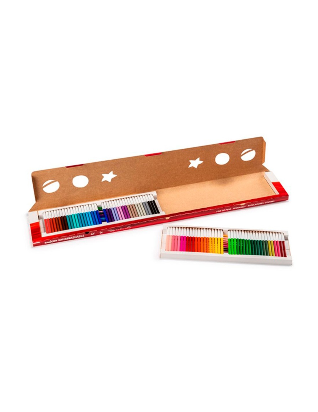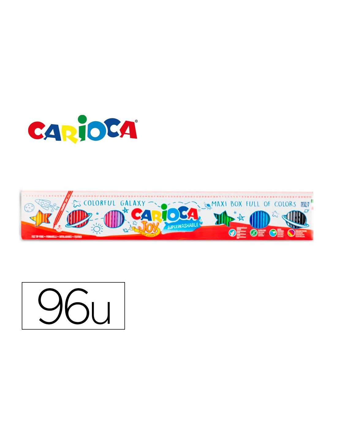 Punta de nylon de 2,8 mm de diámetro. Tinta a base de agua y colorantes alimentarios inocuos y lavables. Punta bloqueada. Permite hasta 800 m de escritura. Sin gluten. Caja de 100 rotuladores.