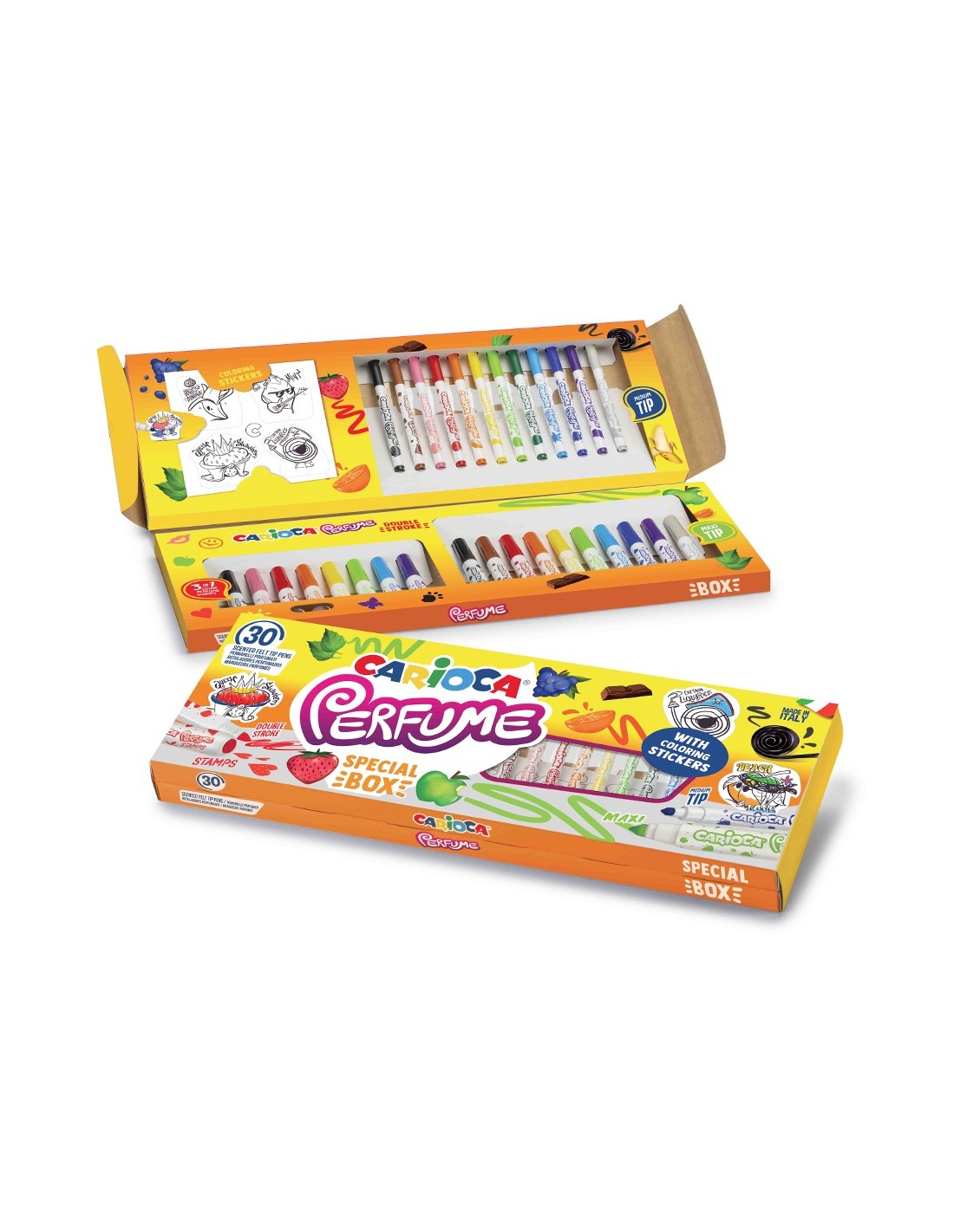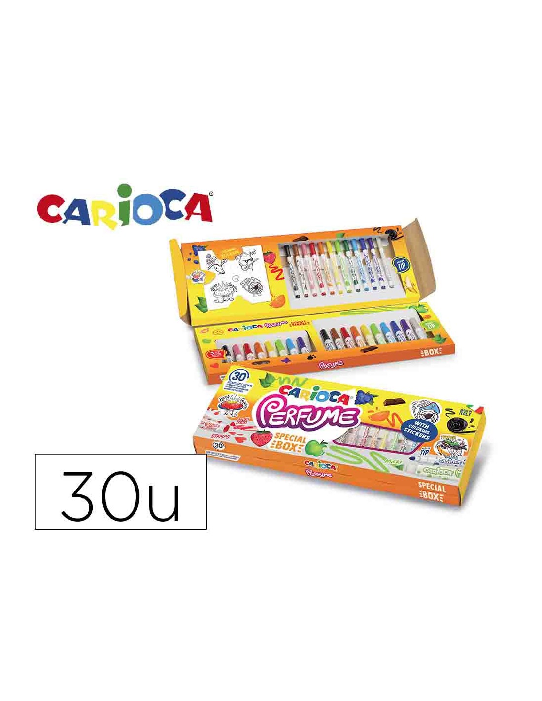 Set de 30 rotuladores perfumados con colores surtidos y pegatinas para colorear. Contiene: 12 Rotuladores Perfume con punta cónica para un doble trazo de escritura, 8 Rotuladores Perfume Stamps con doble punta: una máxi cónica y la otra con sellitos y olores, 10 Rotuladores Perfume Maxi con punta máxi cónica para un doble trazo de escritura. La tinta es lavable y los aromas usados han sido seleccionados rigurosamente para evocar las esencias naturales