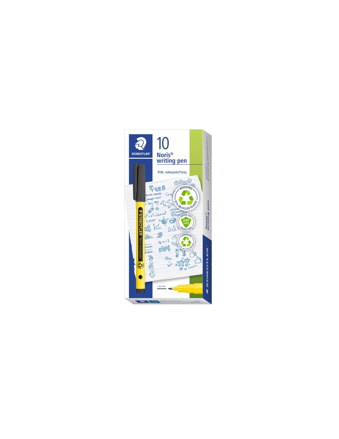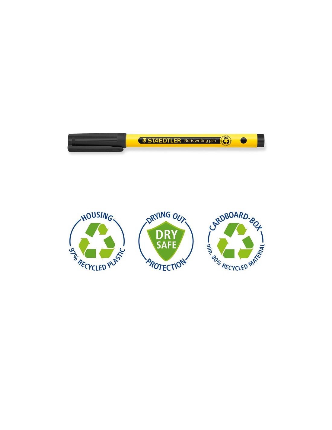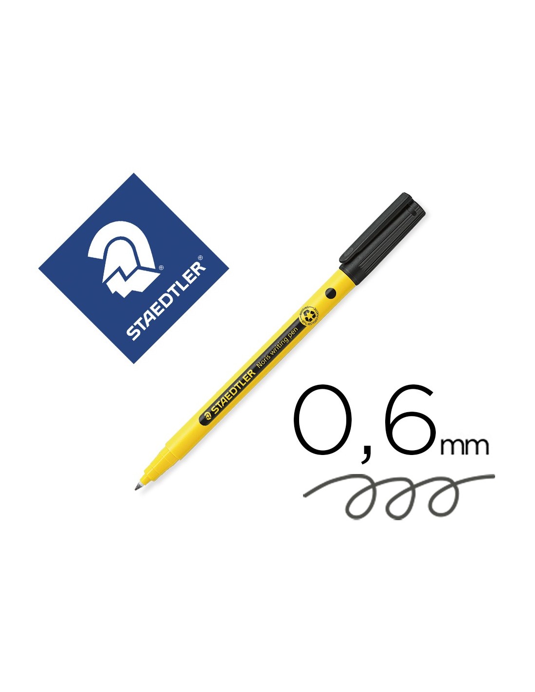 Rotulador Staedtler Fineliner con cuerpo en colores amarillo y negro y capuchón en color de la tinta. Carcasa fabricada en un 97% de plástico reciclado (cuerpo, capuchón y embellecedor) según ISO 14021. Punta antisecado Dry Safe resistente a la presión. Lavable sobre la mayoría de tejidos. PuntaF (aprox. 0,6 mm). Color negro.