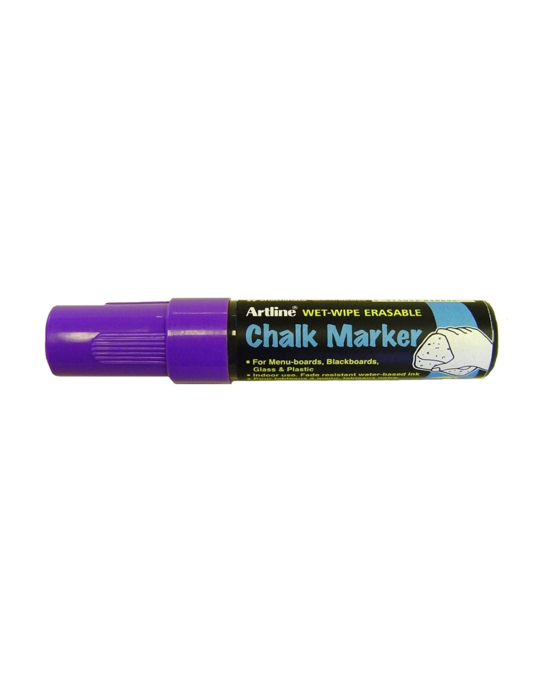 Rotulador de punta rectangular de fibra acrílica. Para todo tipo de pizarras negras, verdes, cristal y plástico. Uso exterior o interior. Borrable con una bayeta húmeda. Trazo aproximado de 12 mm. Longitud de escritura: 150 - 200 m.