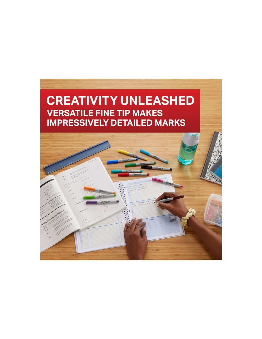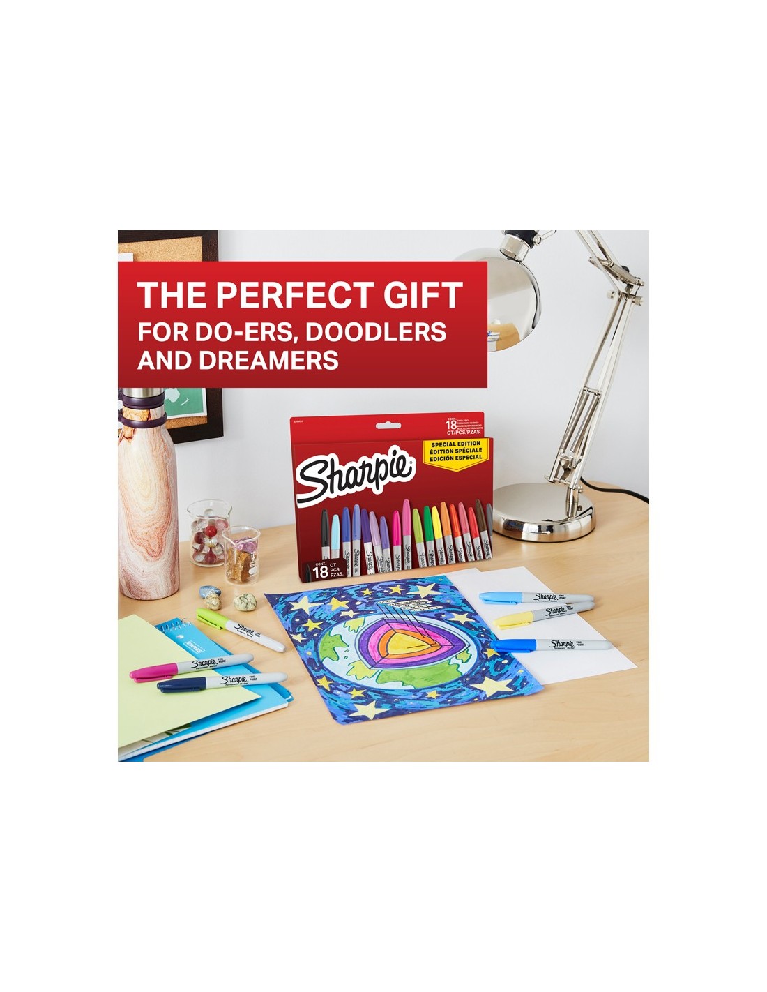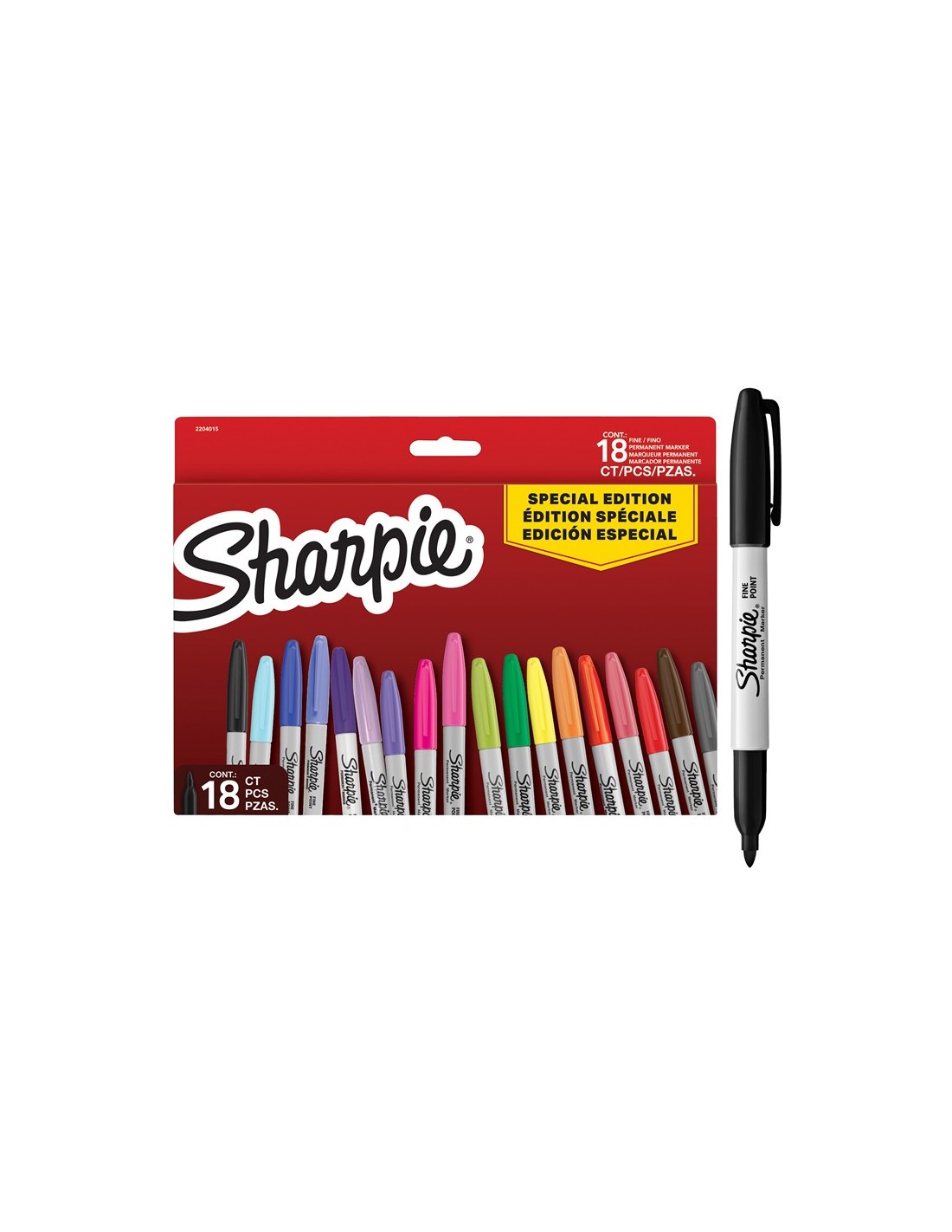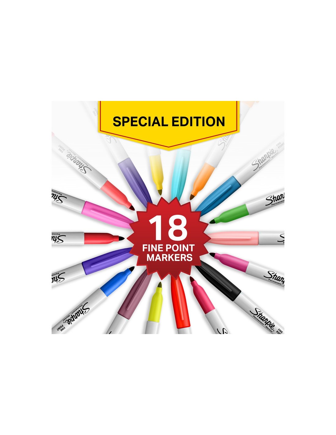 Pack promocional vuelta al cole, blíster 18 unidades Sharpie marcador permanente Fine, punta 0.9 mm, tinta a base de alcohol. Con matices brillantesde cada color, los rotuladores permanentes Sharpie Glam Pop te inspiran p ara transformar superficies ordinarias en expresiones creativas y apasionadamente atrevidas. Estos rotuladores Sharpie de edición especial están hechos para escribir prácticamente sobre cualquier superficie. La colección Glam Pop presenta colores intensamente brillantes que hacen que tu idea destaque independientemente de la superficie. El rotulador permanente original, Sharpie, tiene una tinta icónica que se seca rápidamente y resiste tanto al agua como a la decoloración. Los rotuladores Sharpie de punta fina titienen una punta versátil para conseguir trazos muy detallados y llamativ os.