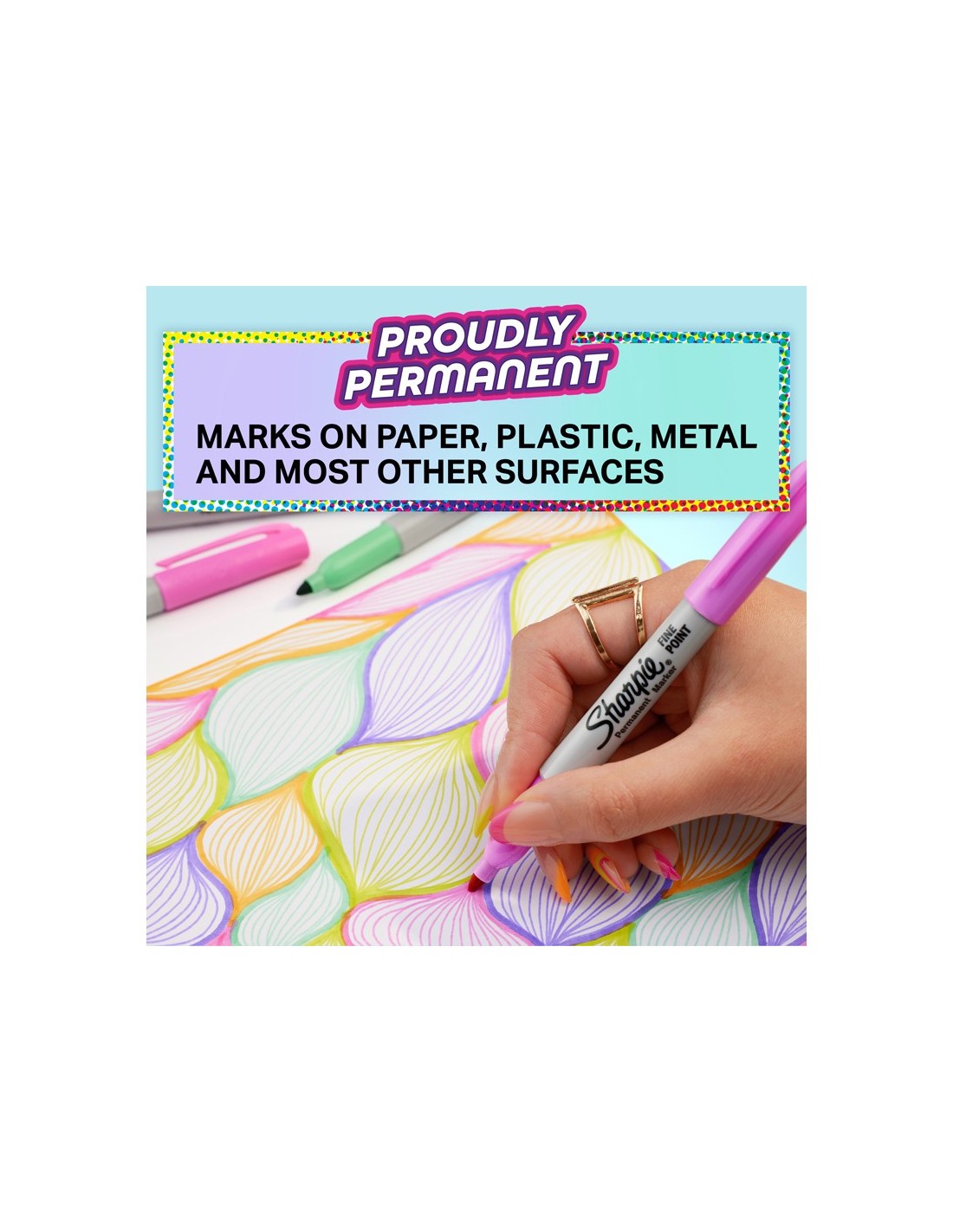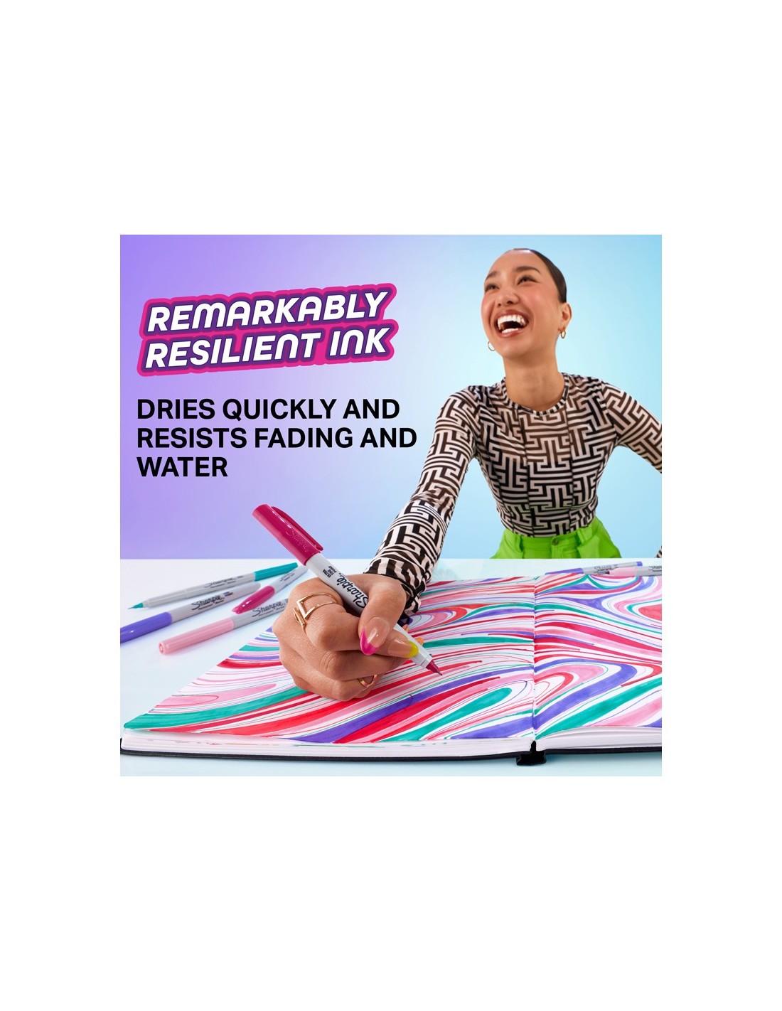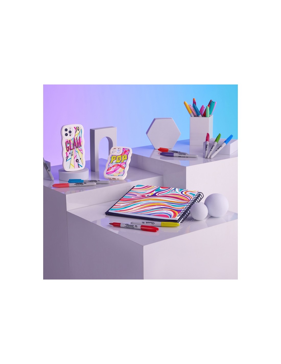 Sharpie marcador permanente Fine, punta 0.9 mm, tinta a base de alcohol. Con matices brillantes de cada color, los rotuladores permanentes Sharpie Glam Pop te inspiran para transformar superficies ordinarias en expresionescreativas y apasionadamente atrevidas. Estos rotuladores Sharpie de edici ón especial están hechos para escribir prácticamente sobre cualquier superficie. La colección Glam Pop presenta colores intensamente brillantes que hacen que tu idea destaque independientemente de la superficie. El rotulador permanente original, Sharpie, tiene una tinta icónica que se seca rápidamente y resiste tanto al agua como a la decoloración. Los rotuladores Sharpie de punta fina tienen una punta versátil para conseguir trazos muy detdetallados y llamativos.