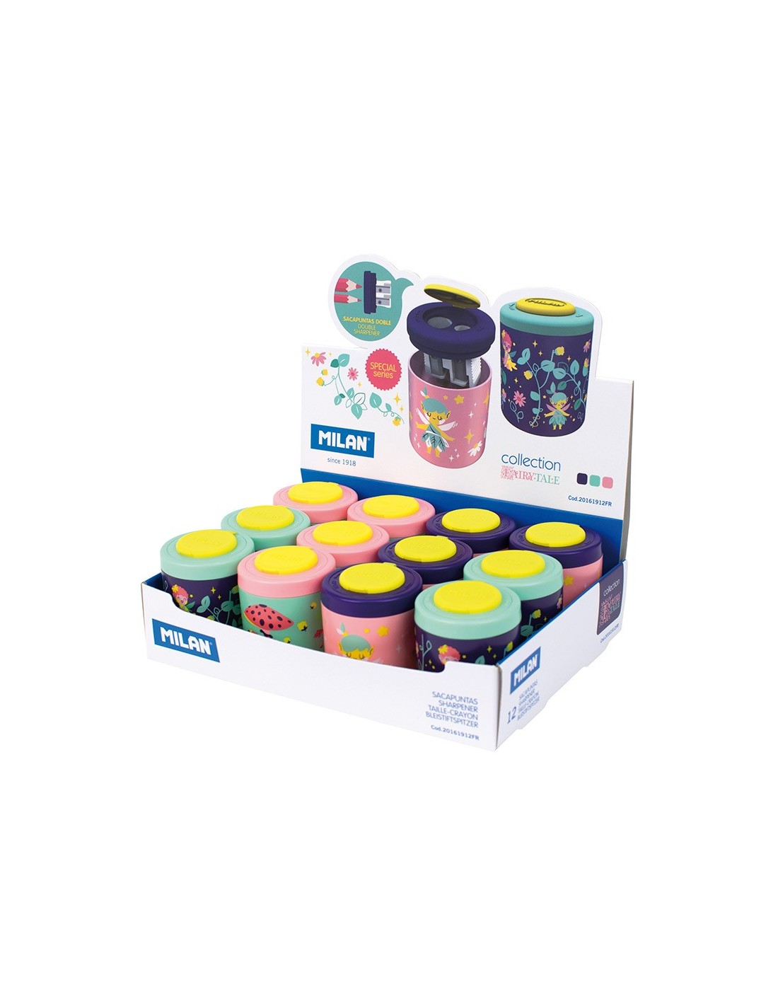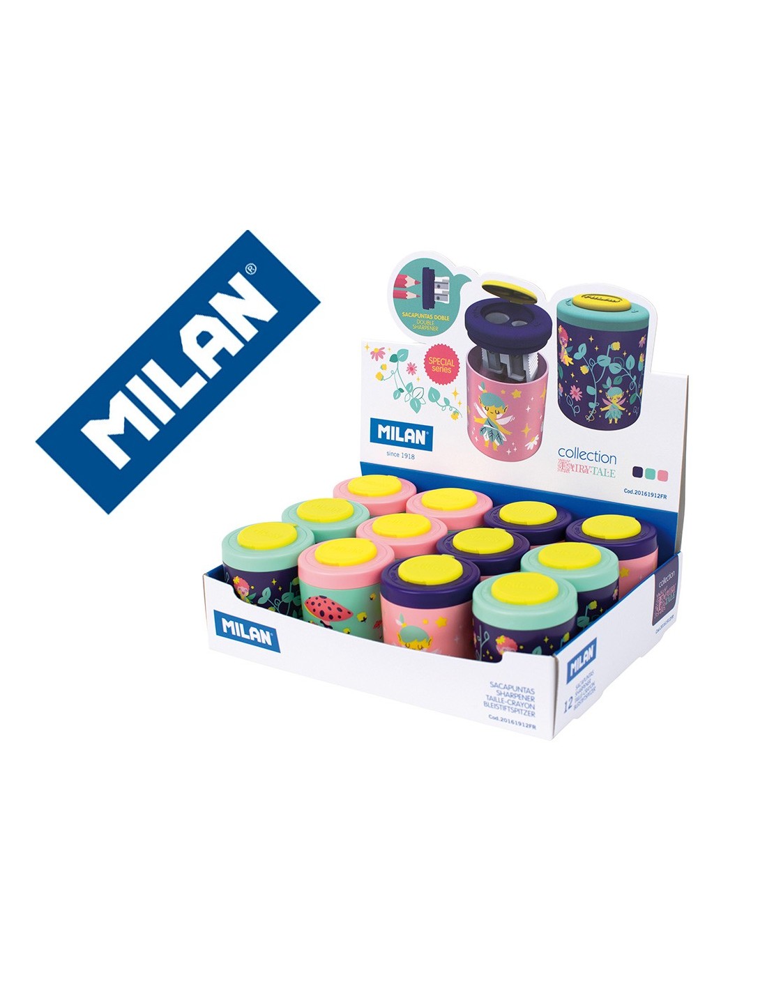 Sacapuntas doble, uno estándar y otro Maxi con depósito. Diseño Collection, edición especial Fairy Tale. Cómodo tapón con rosca. El sacapuntas tieneuna cuchilla de acero al carbono afilada y resistente, ideal para todo ti po de lápices. Artículo con cuchilla de seguridad. Este sistema evita que se pueda separar la hoja del cuerpo del sacapuntas, siendo óptimo para usoescolar. Colores surtidos disponibles: violeta, verde y rosa. Diseño orig inal creado por el departamento de I+D de Milan.