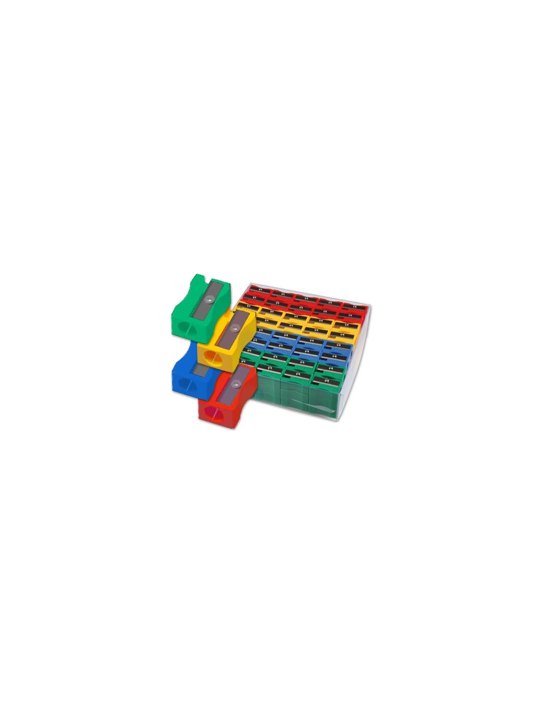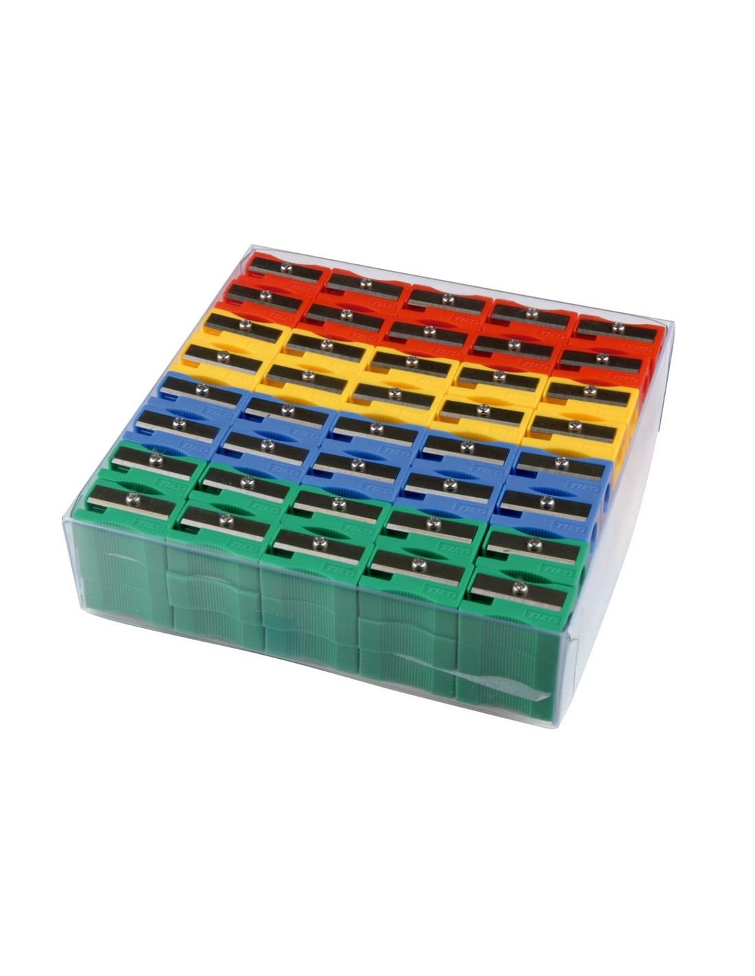 Sacapuntas en forma de bloque. Uso escolar, oficina y hogar. Incluye 120 sacapuntas en colores surtidos. Un uso.