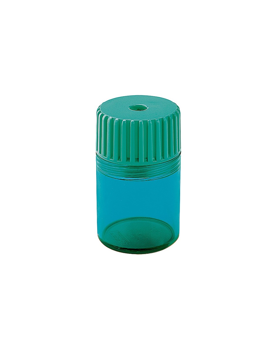 Sacapuntas de interior y cobertura de plástico. Con cuchilla fijada por presión. Con depósito para las virutas. Con tapa que lo hace más seguro para los niños. Color turquesa. Un uso.