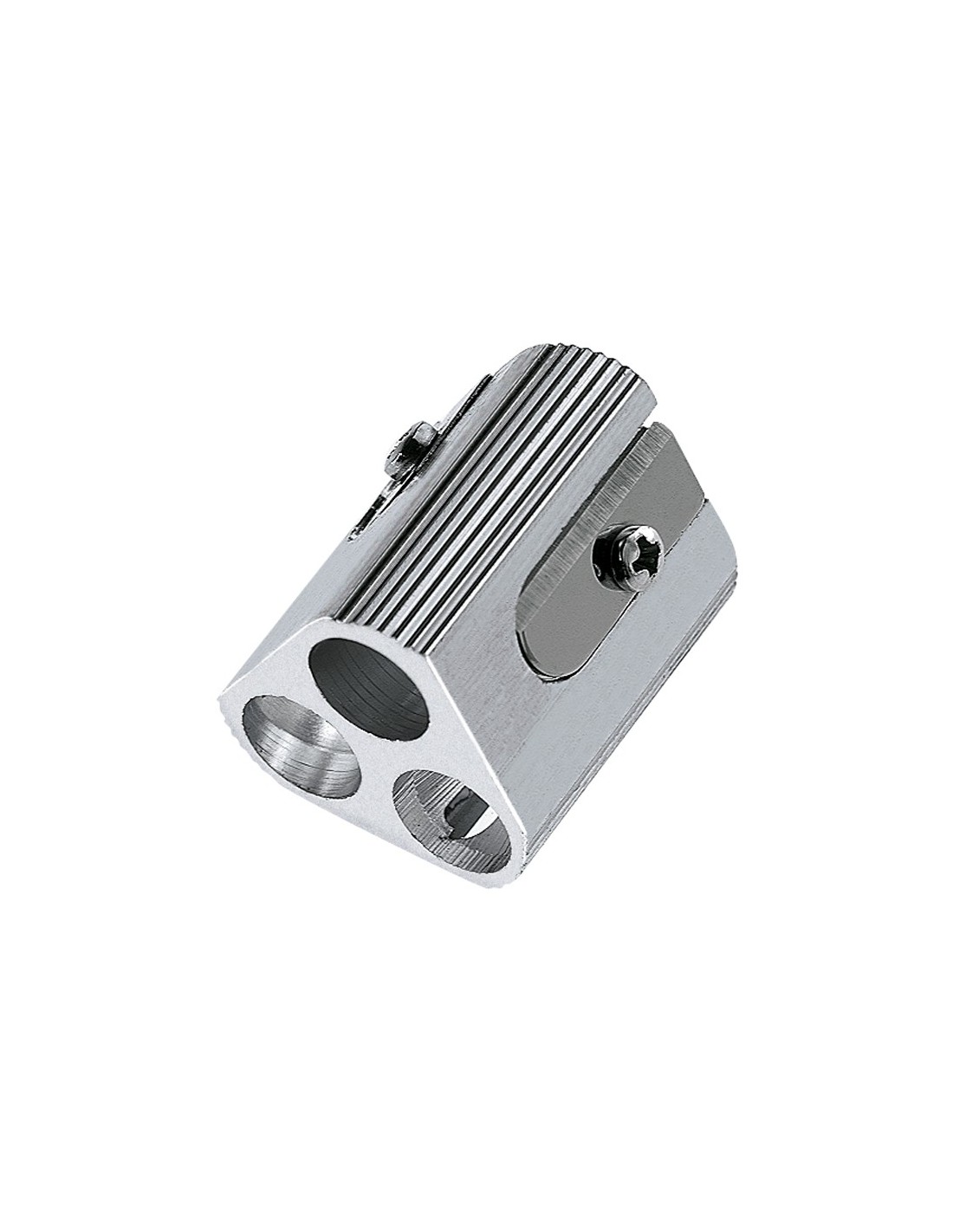 Sacapuntas de magnesio en forma prisma triangular y cantos redondeados. De gran robustez y resistencia. Tres usos que permiten tres formas distintas de afilar el lápiz.