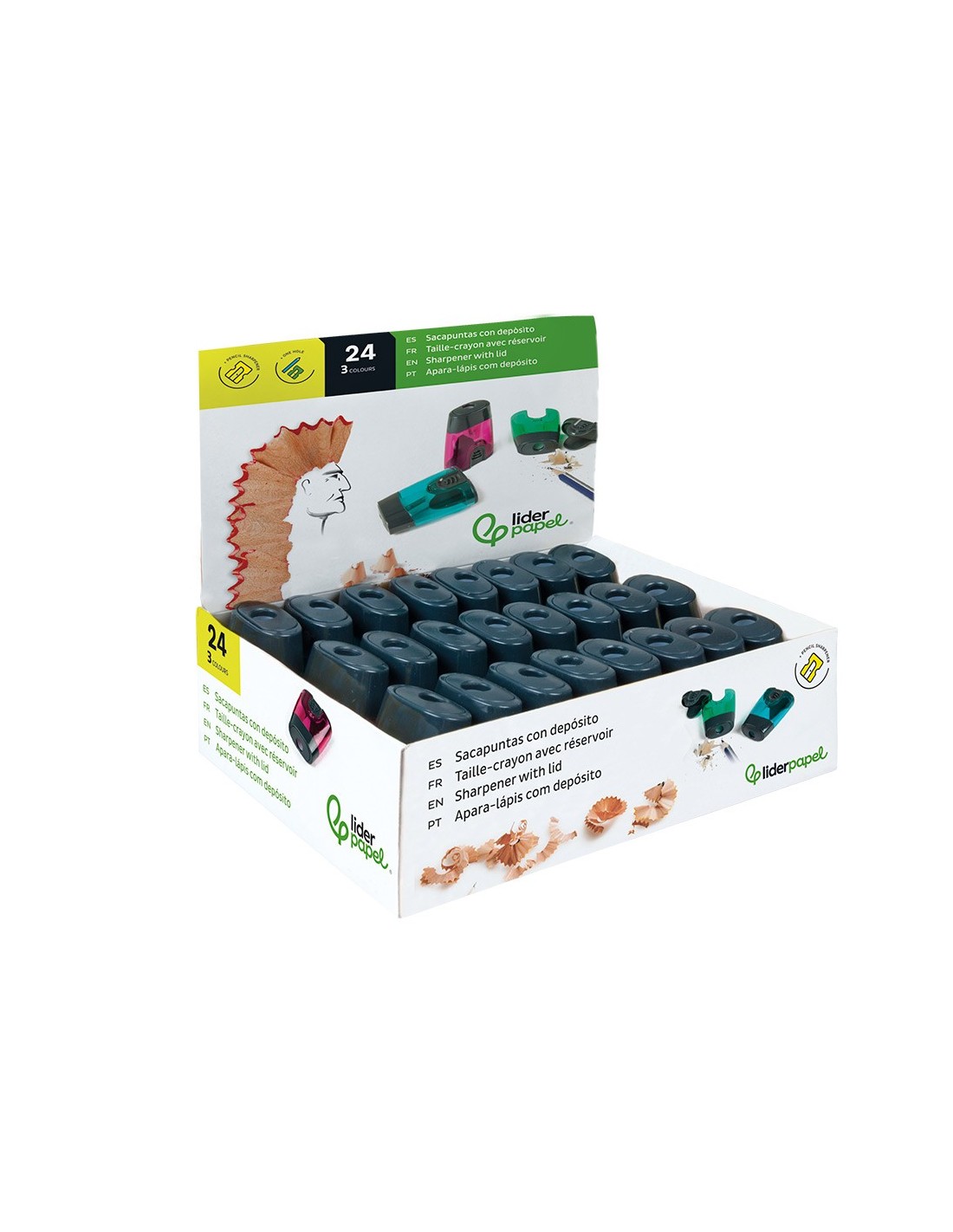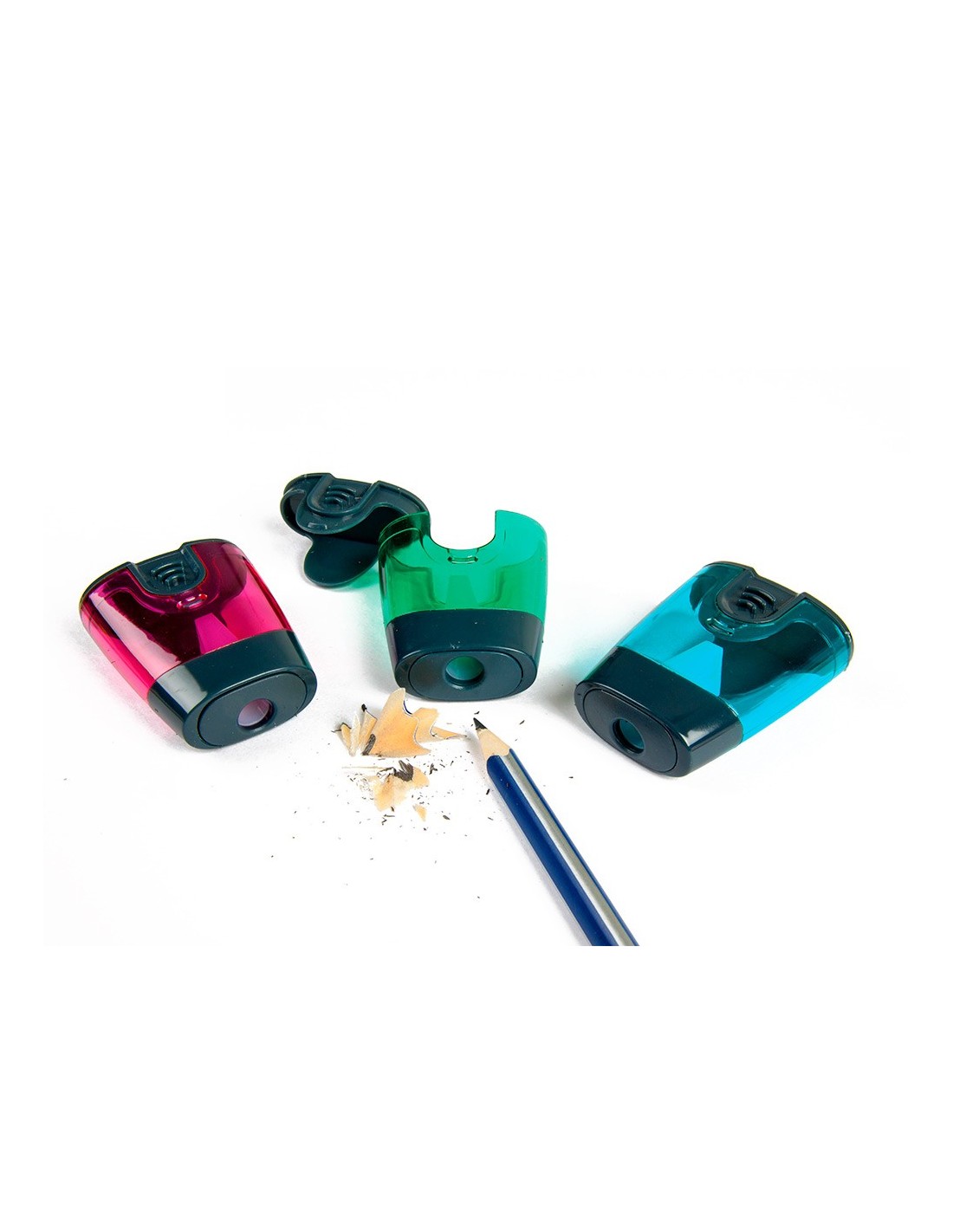 Cuerpo de plástico y sacapuntas metálico. Alta seguridad para niños: con protector de la cuchilla para evitar cortes en los dedos al limpiar el sacapuntas. Colores surtidos. Un uso.