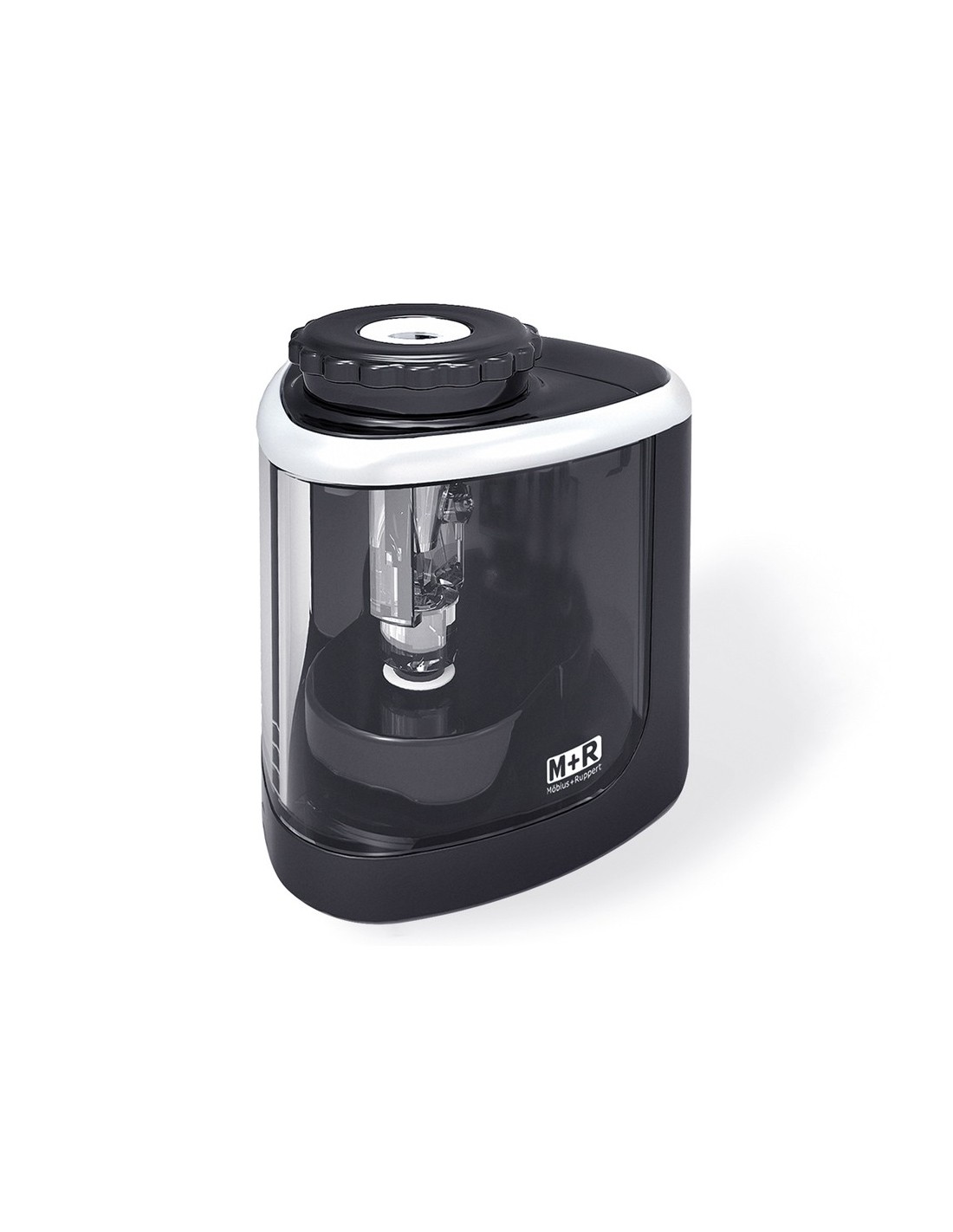 Sacapuntas de plástico. De sobremesa, eléctrico. Funciona con pilas tipo AA, no incluidas. Con depósito para las virutas. Diseño atractivo y ergonómico. Color gris antracita. Un uso. Medidas: 63 x73 x 63 mm.
