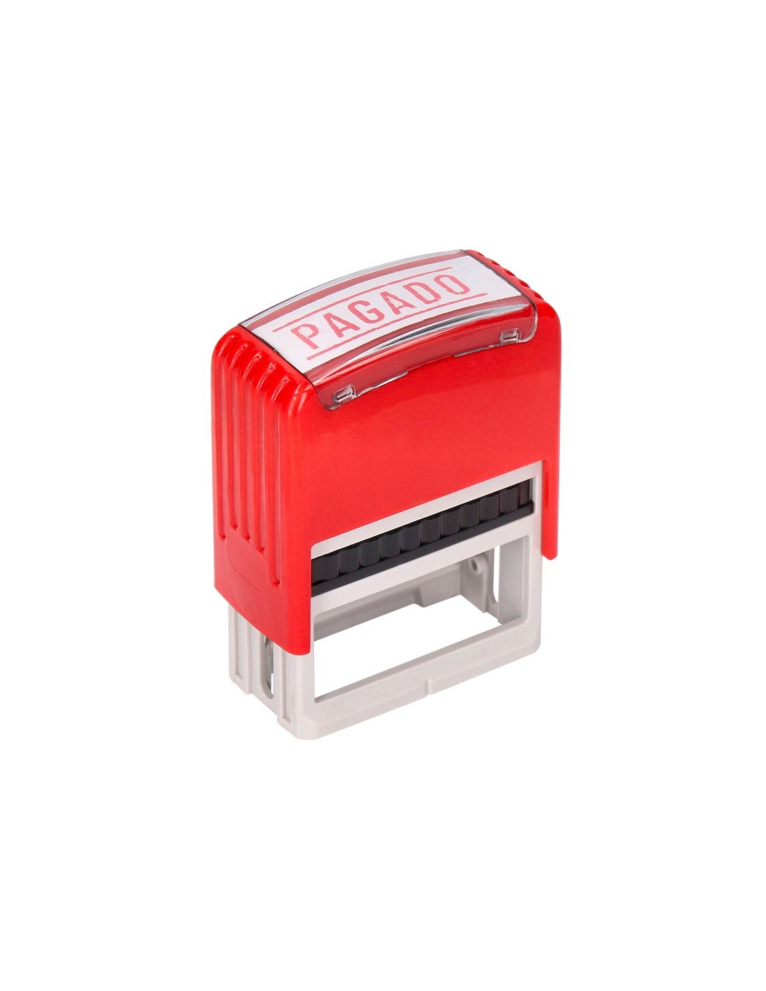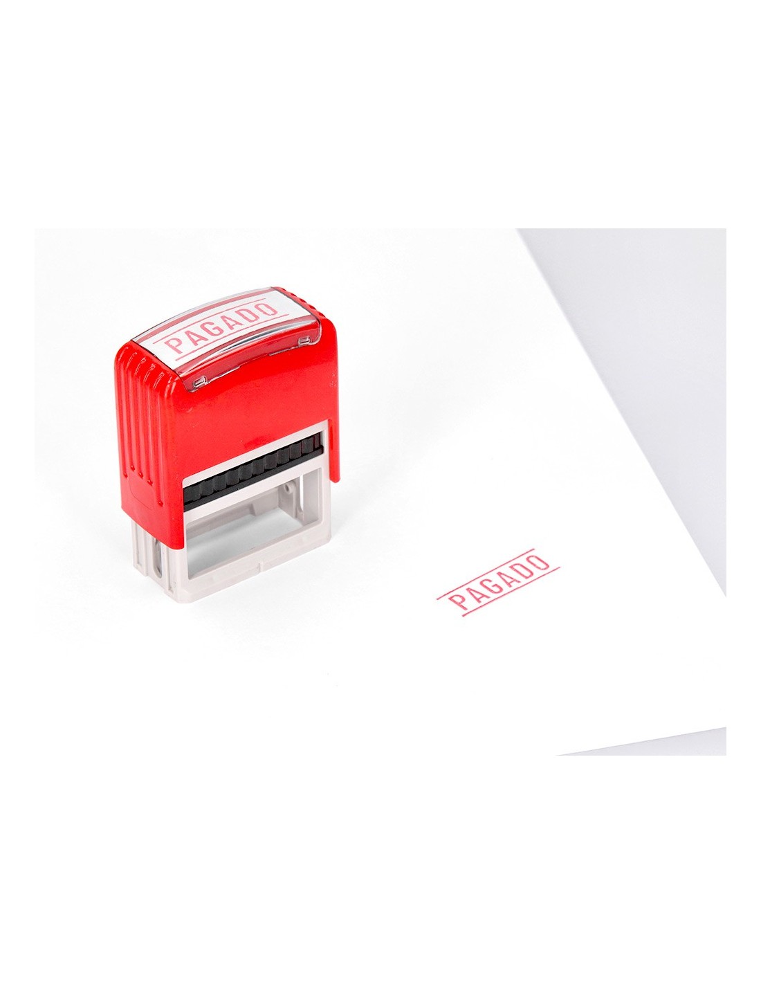 Sello de entintaje automático. Texto PAGADO en color rojo. Altura tipo: 7,5 mm. Medida del sellado: 14 x 38 mm.