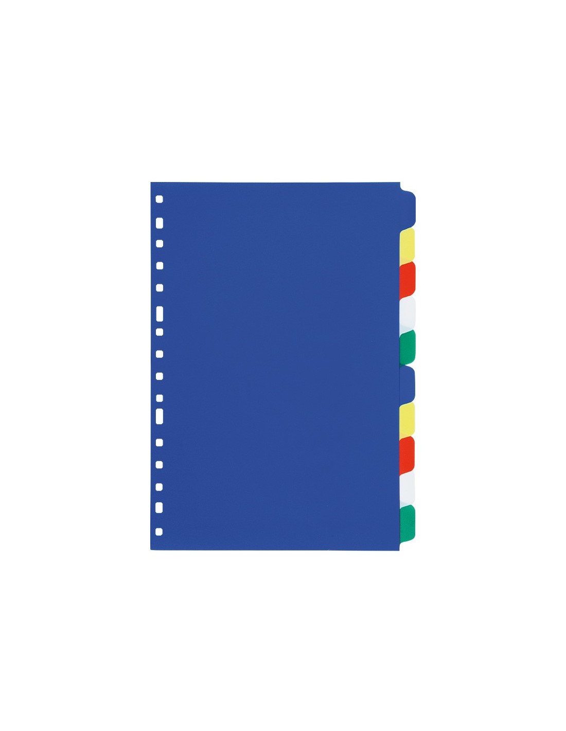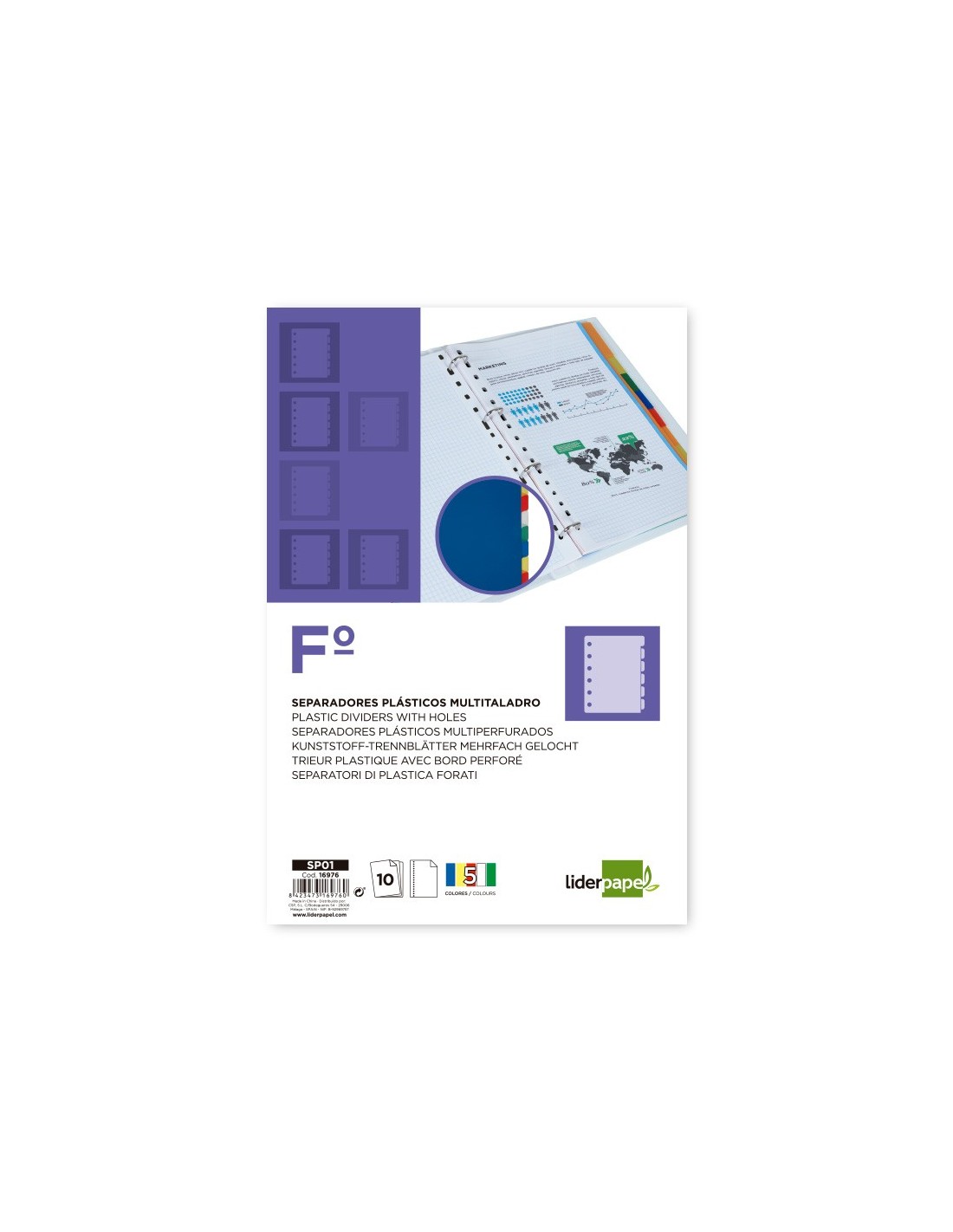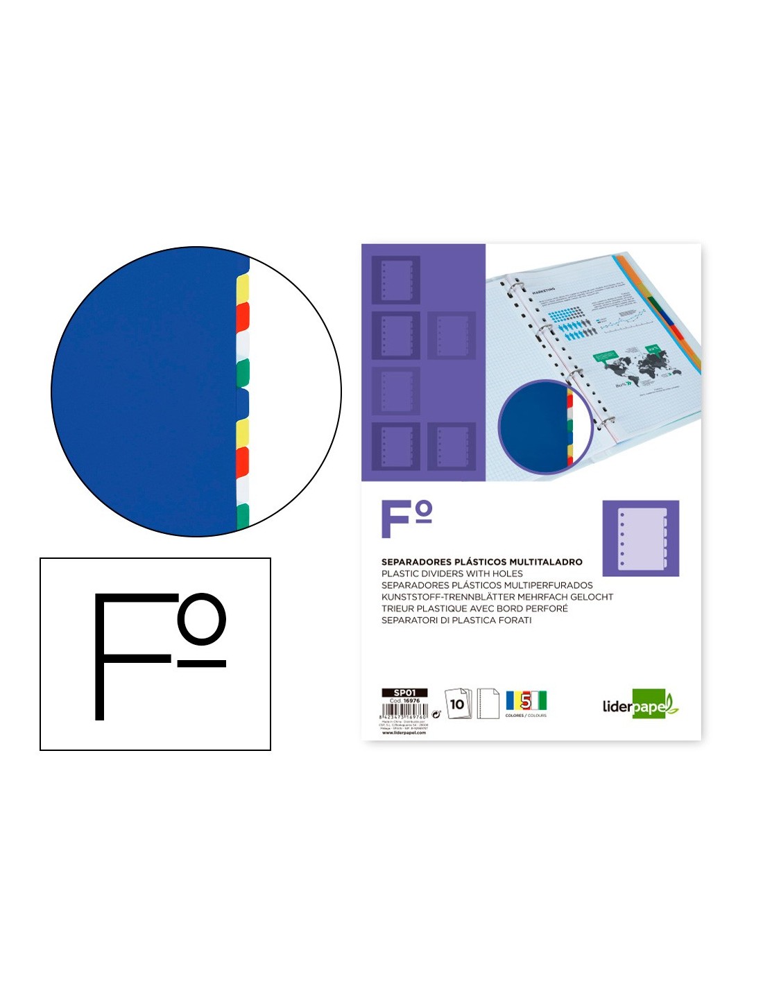 Juego de separadores fabricado en PVC de 160 micras. Colores opacos. Disposición en escalera para una rápida consulta e identificación de documentos. Perforación multitaladro para archivar en diferentes mecanismos de anillas.