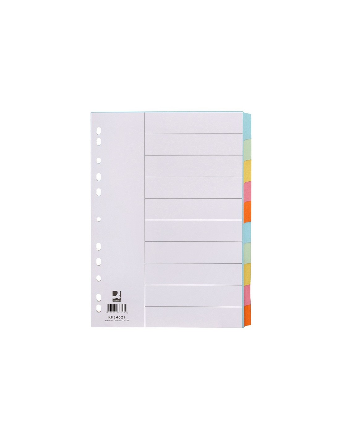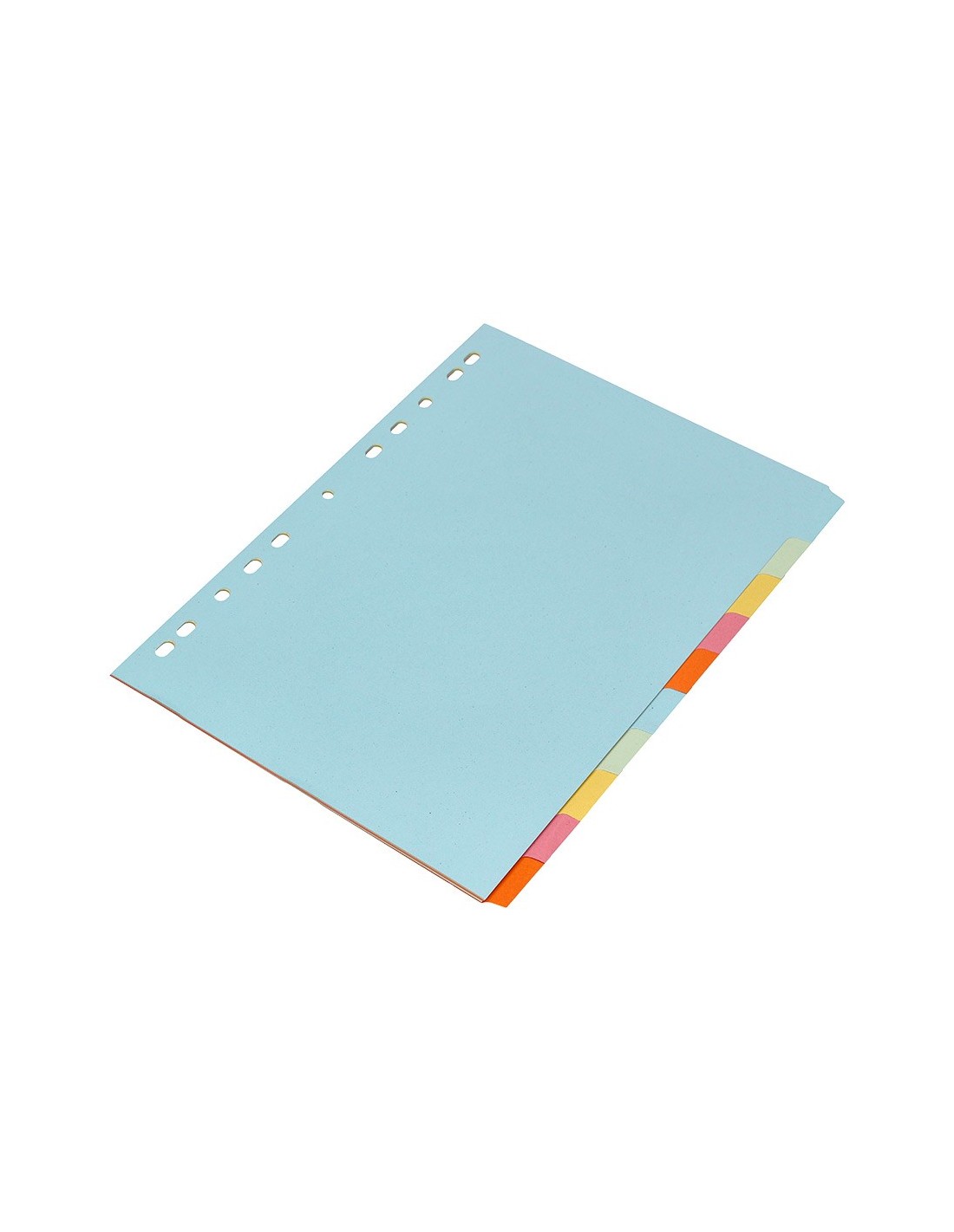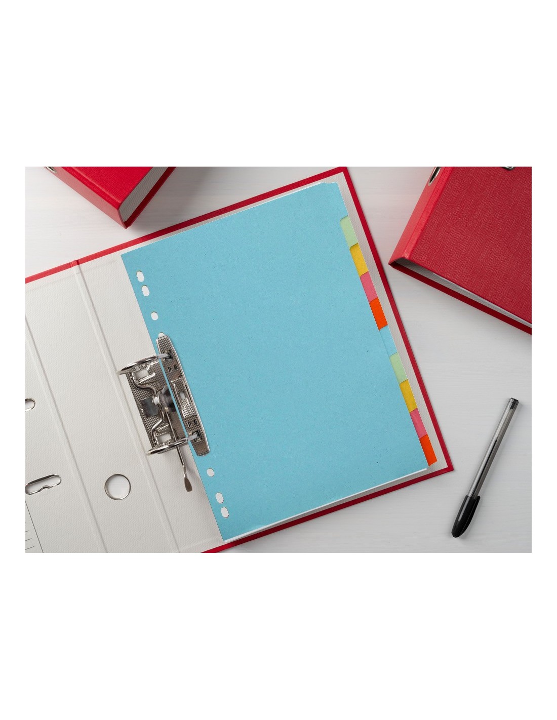 Juego de separadores fabricados en cartón de 175 g/m². Pestañas en colores pastel. Para archivar en diferentes mecanismos de anillas. Incluye carátula con índice.