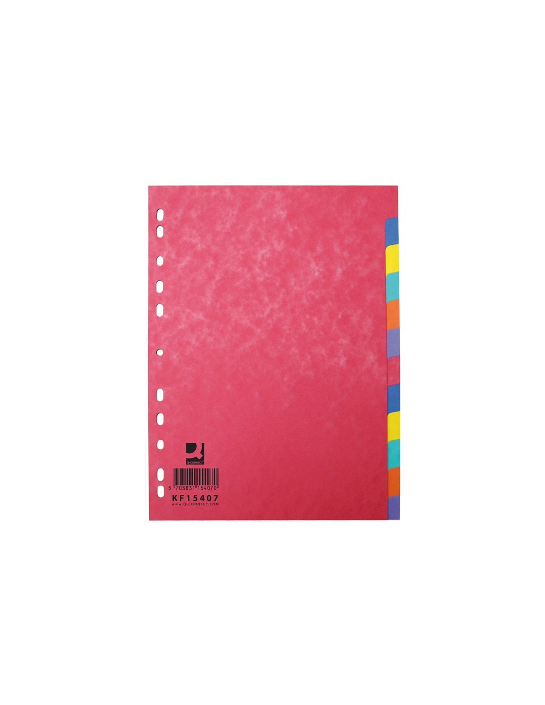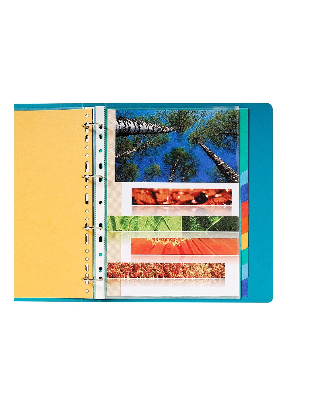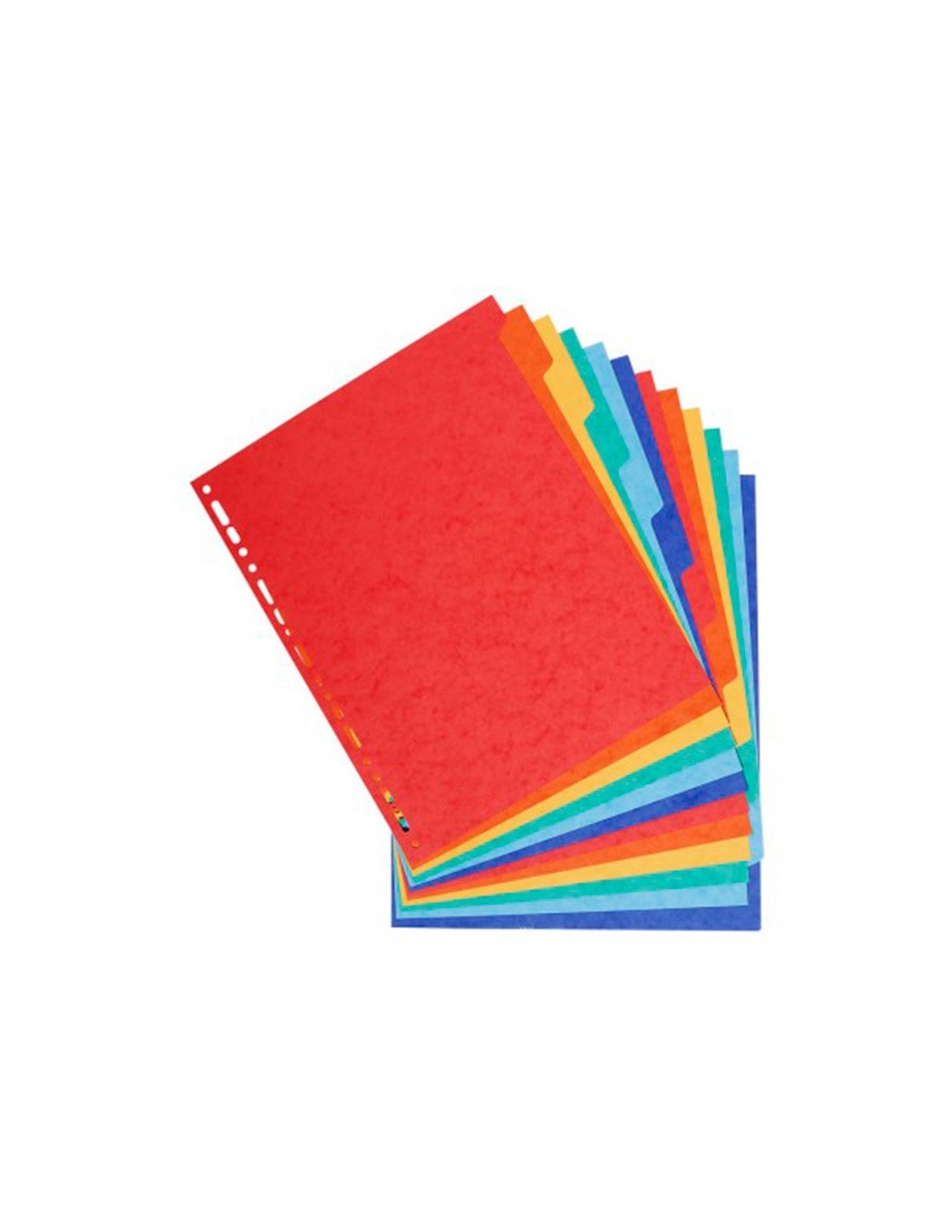 Juego de separadores fabricado en cartulina brillo de color de 225 g/m². Disposición en escalera para agilizar la consulta e identificación de documentos. Multitaladro para archivar en diferentes mecanismos de anillas. Colores vivos opacos. En formatos DIN A4 y A4+.