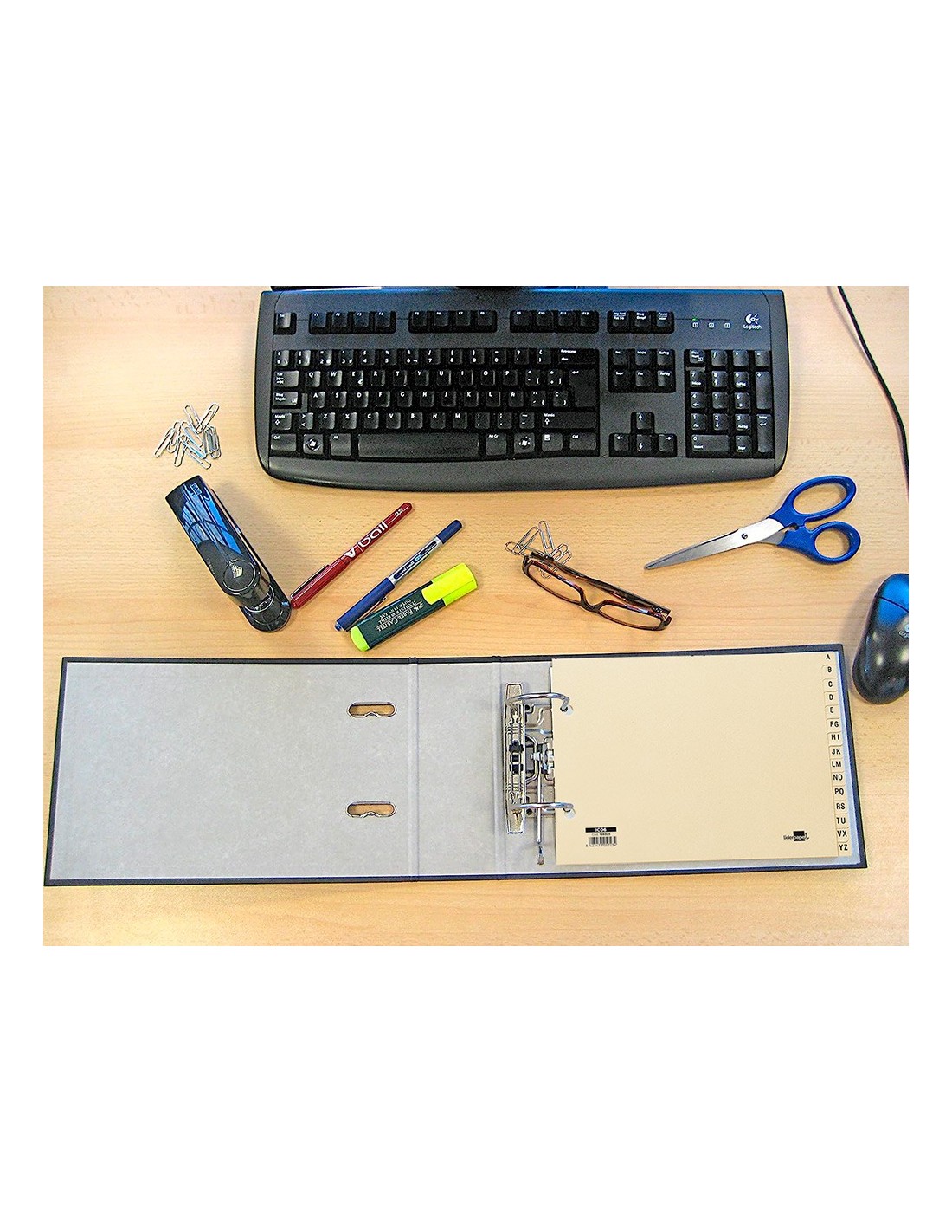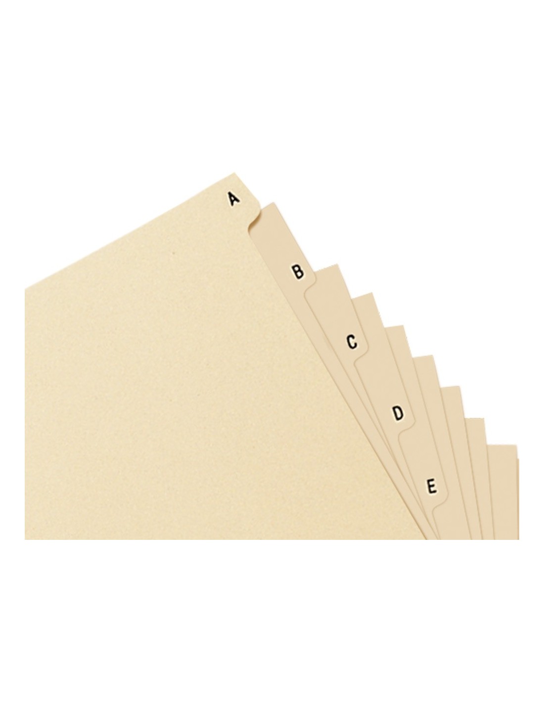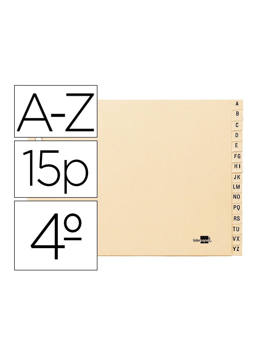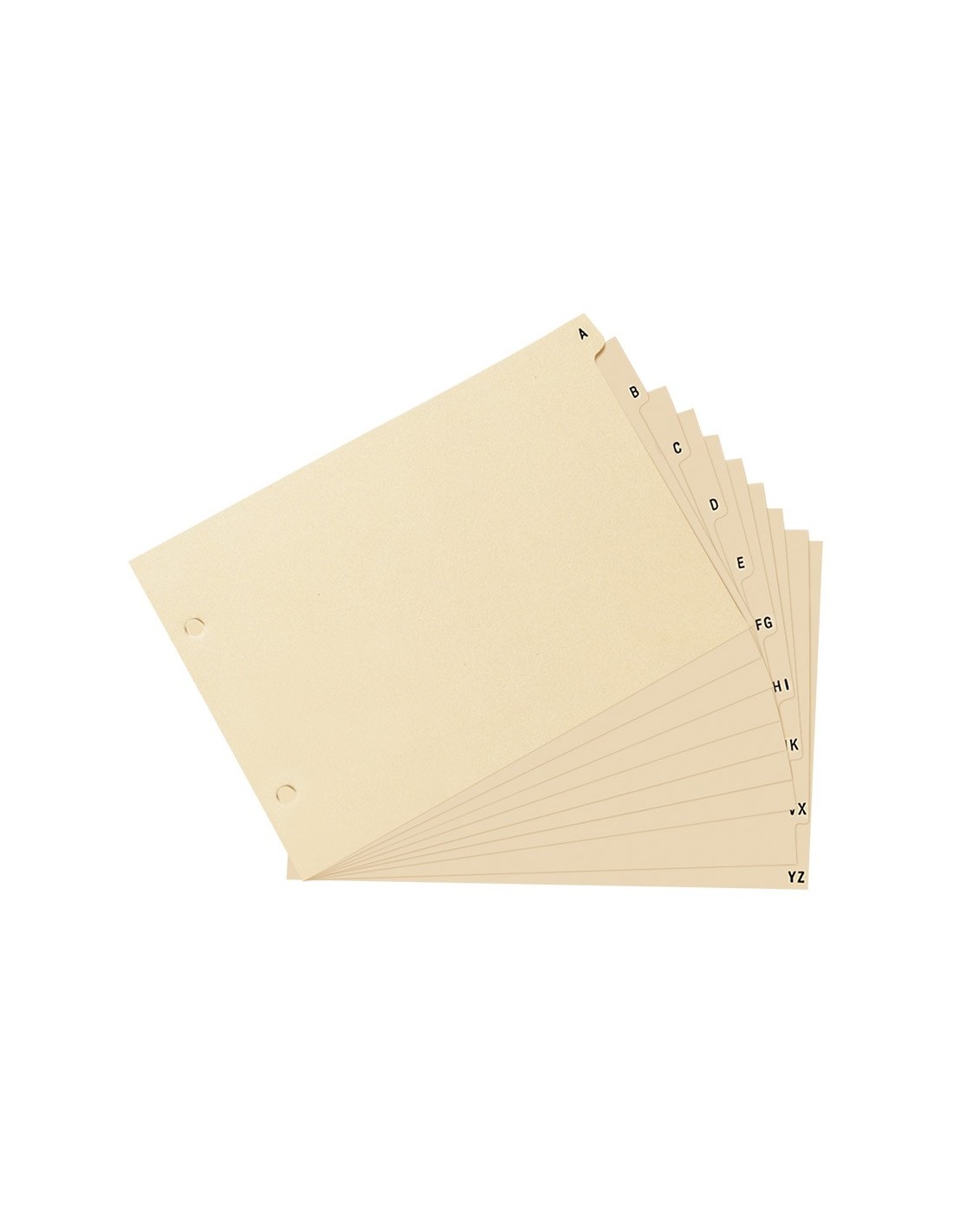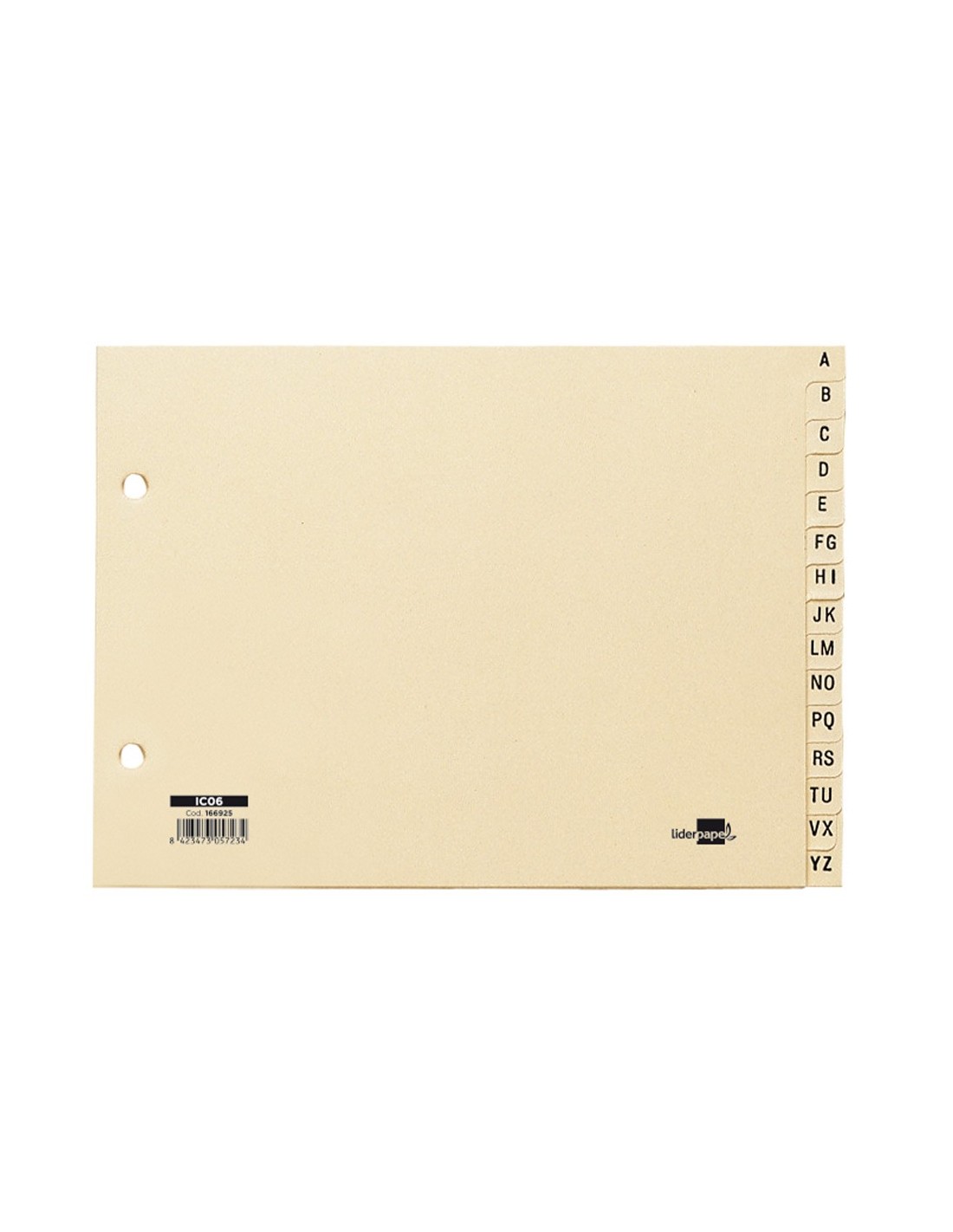 Juego de índice alfabético tamaño cuarto apaisado, fabricado en cartulina de 180 g/m². Indicado para archivadores de palanca y carpetas de 2 anillas. 2 taladros.
